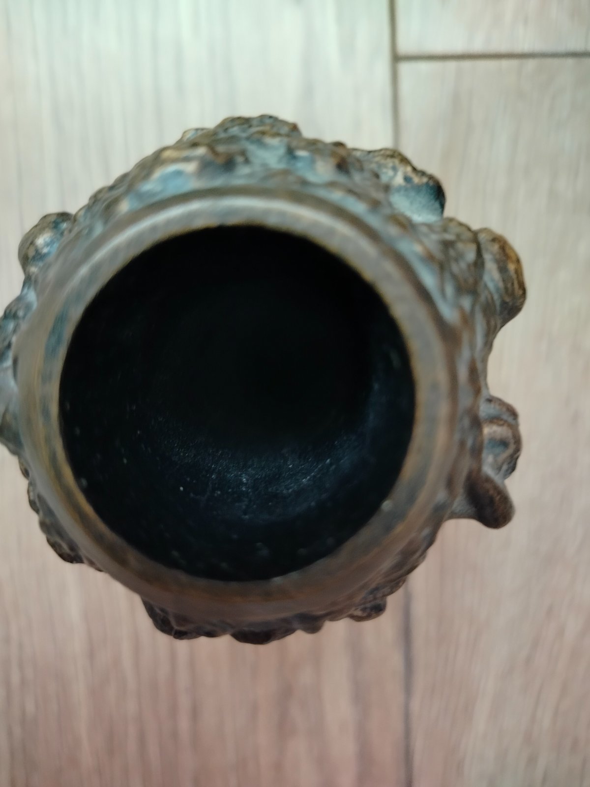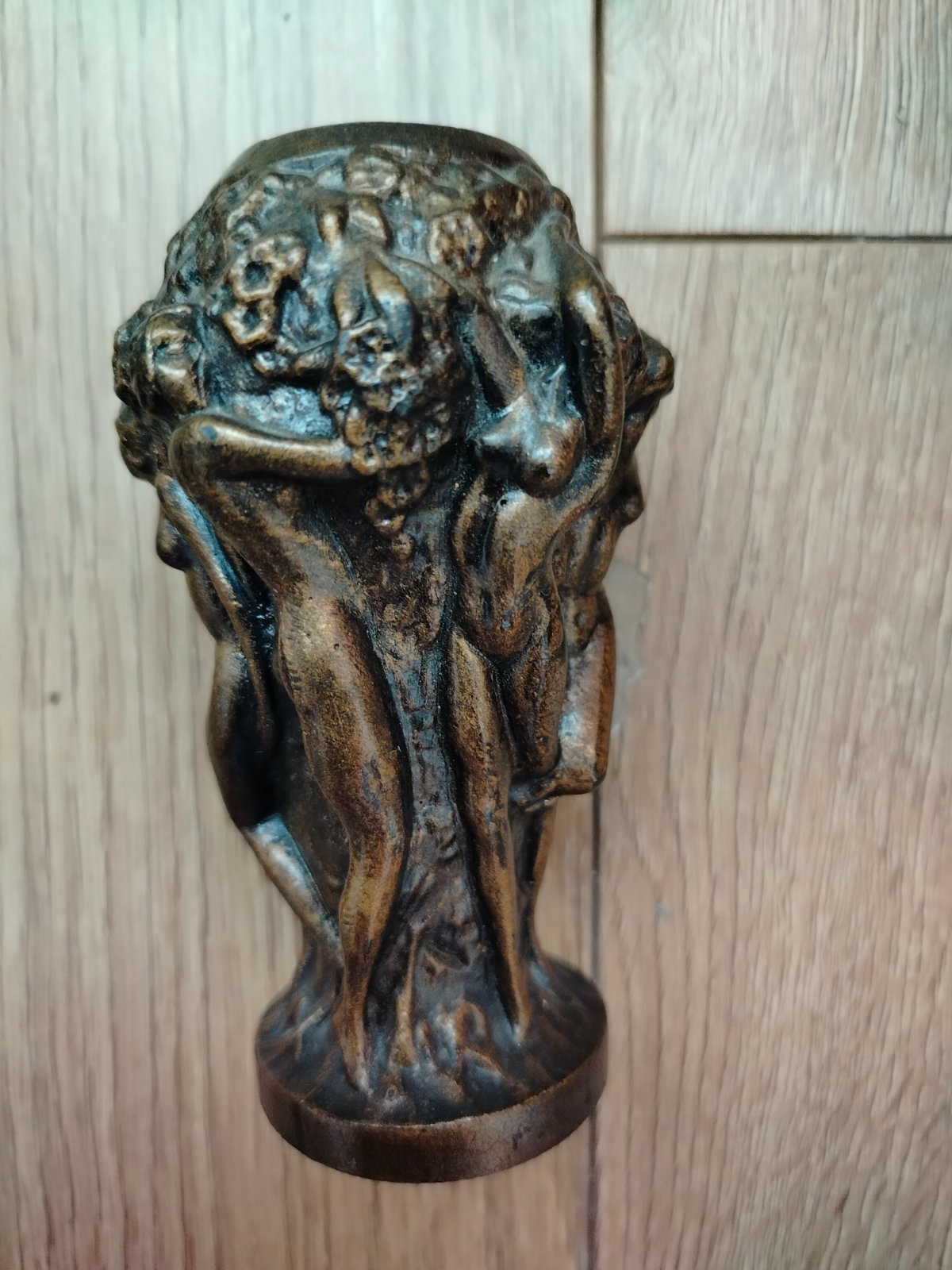 Ponúkam na predaj peknú malú bronzovú vázičku v štýle Art Nouveau s motívom troch prepletených Grácií (Tri grácie). Je to dekoratívny kúsok, vhodná na suchú aranžmán alebo len ako samostatný interiérový doplnok. Minimálne používaná, úplne bez poškodenia, škrabancov, odbitých častí či iných defektov. Patina bronzu je pekná, tmavá s detailmi kvetov a listov.
