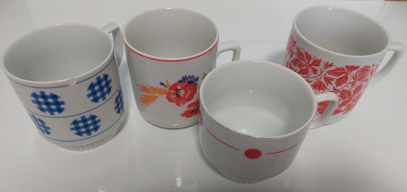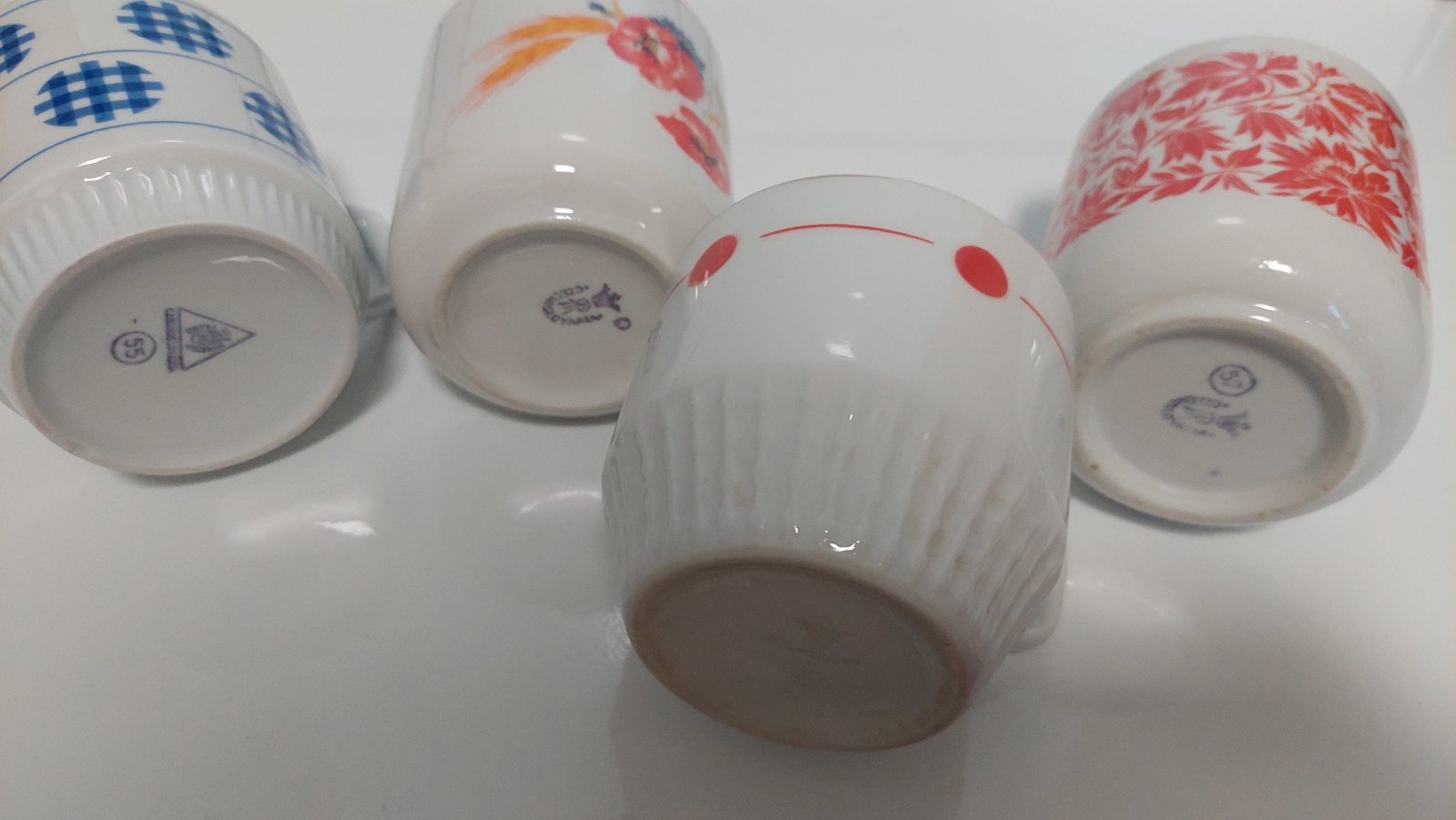 Hrnceky vyrobené v Ceskoslovensku. V peknom stave. Modry hrncek a hrnček s vlcimi makmi nepoužité. Modry hrncek ma menší otuk z vonkajšej strany ostatné sú bez poskodenia. Modry a s červenými bodkami 4 eura/ ks, s vlcimi makmi a s červenou datelinou 5 eur/ ks