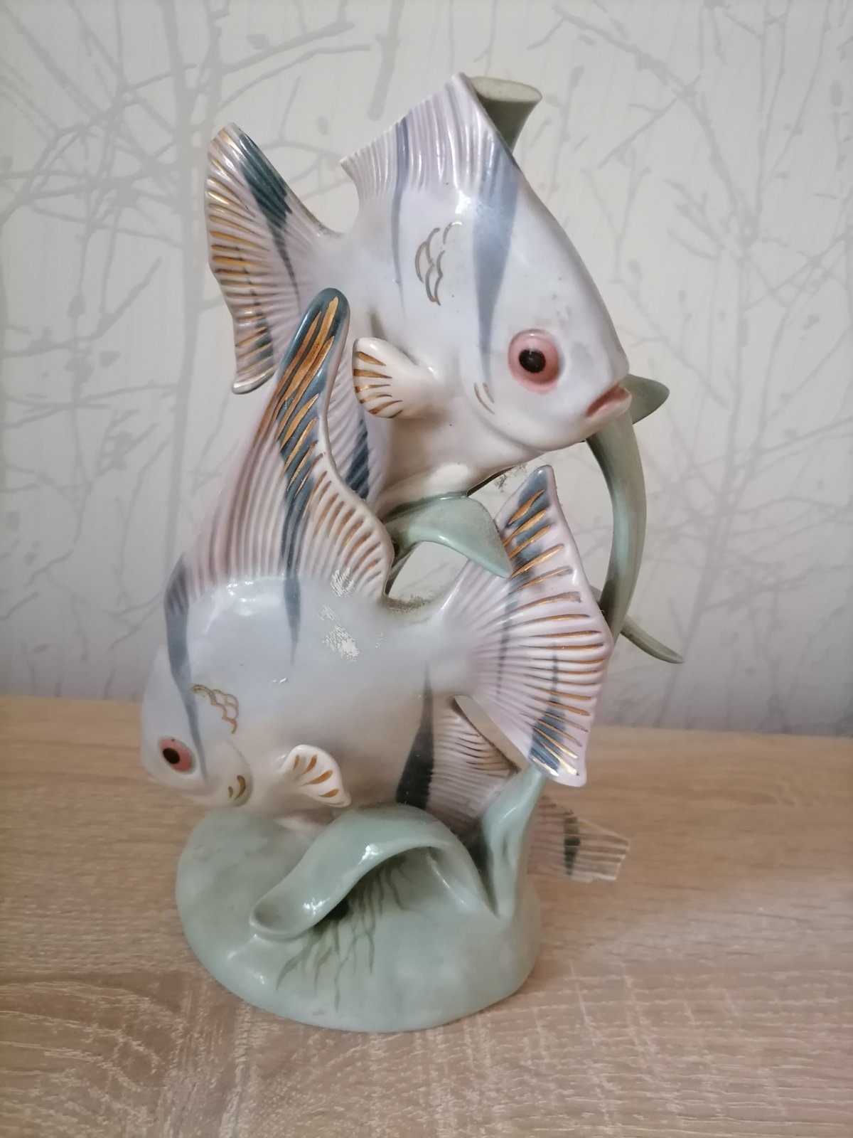 Rybky-retro. Jedna má zlomenú plutvu, druhá trošku. Výška : 23 cm. Cena: 20 €. Uprednostňujem osobný odber. Pri poslaní platba vopred na účet.