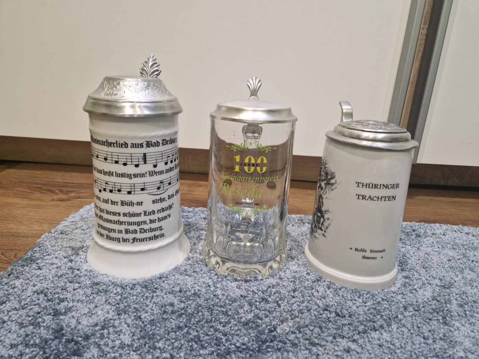 Predam pouzivane pre zberateľa 3 pivné krigle ako dekoráciu alebo na používanie podľa vlastného vkusu.
