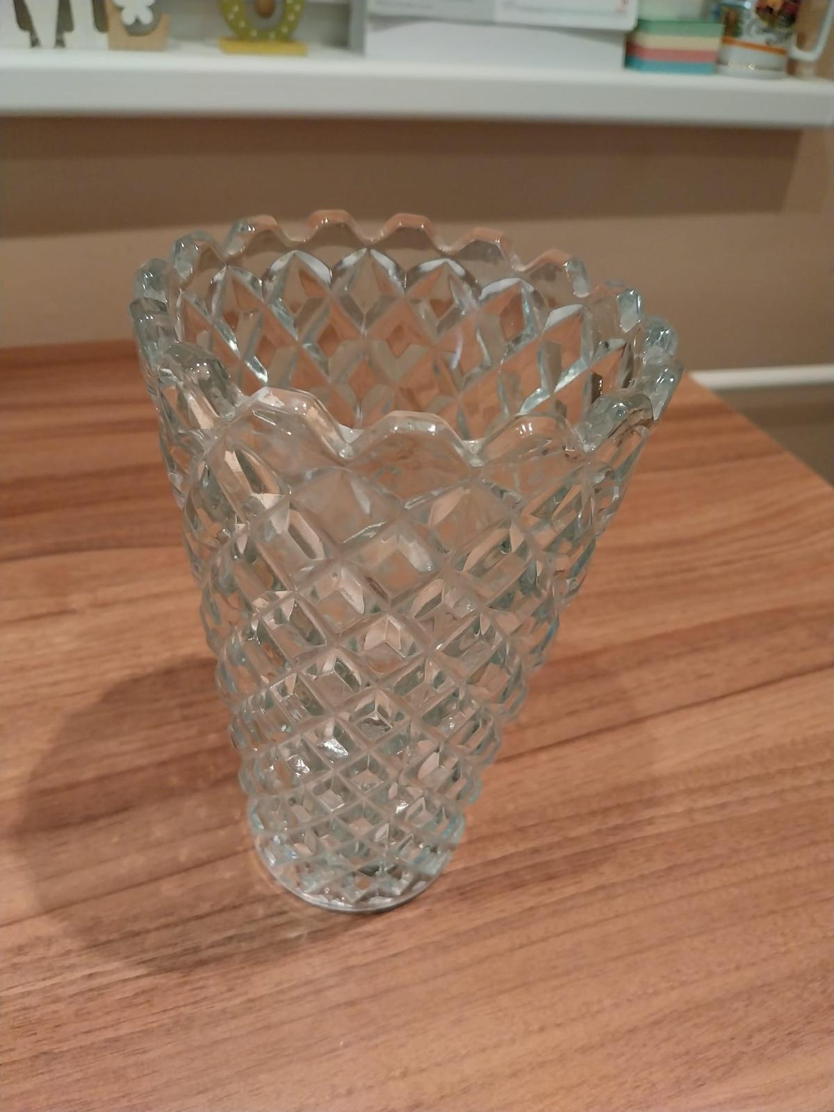 Obr 7-11: Stredná váza tažké hutné sklo, vek cca 50-60rokov, výška na obrázku. Má malý nedostatok - z vonkajsej strany oťuk, ktorý však nemení jej plnú funkčnosť, cena 15€,