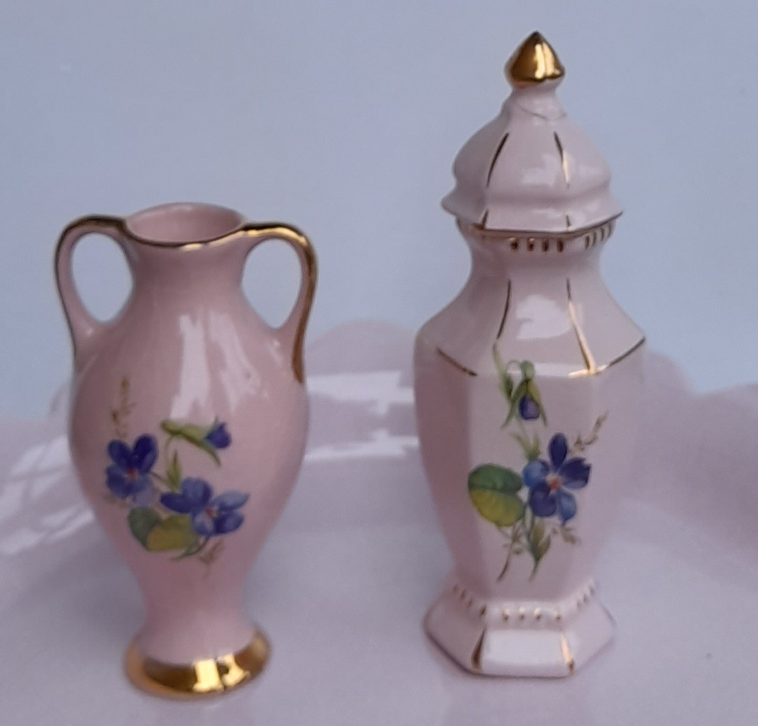 1.staré amforky s fialkami, značené, výška 10,5cm, patina-jemné vlásočnice,