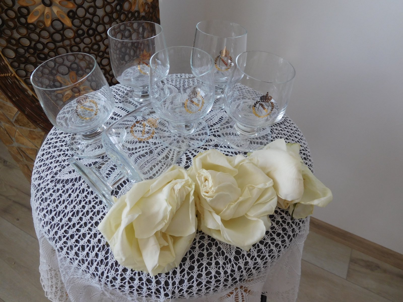 Ponúkam na predaj viď foto 1-sklenené poháriky so zlatým lémom,akoby dúhované- 5 kusov---15 eur 2-Sklenené poháriky na foto-4 kusy čisté sklo bez vzoru---13 eur 3-Šáločky Thun NATALIE-čechoslová...