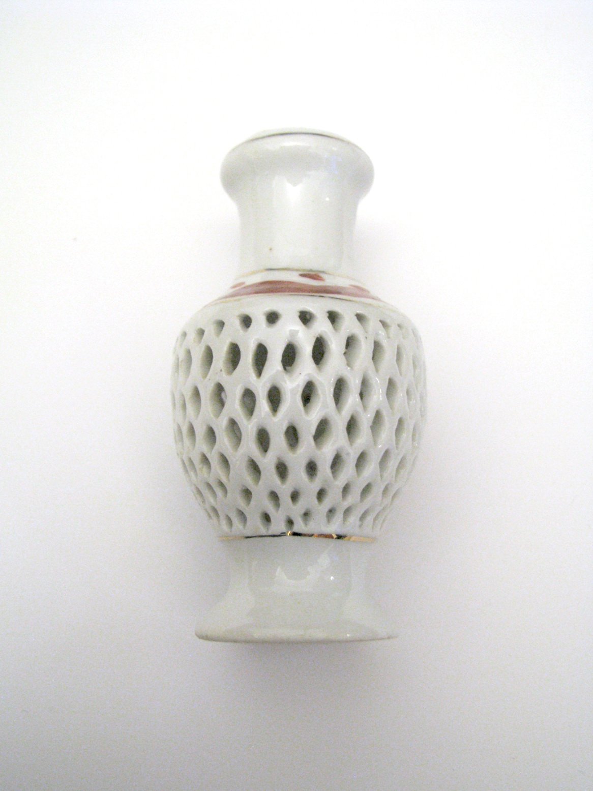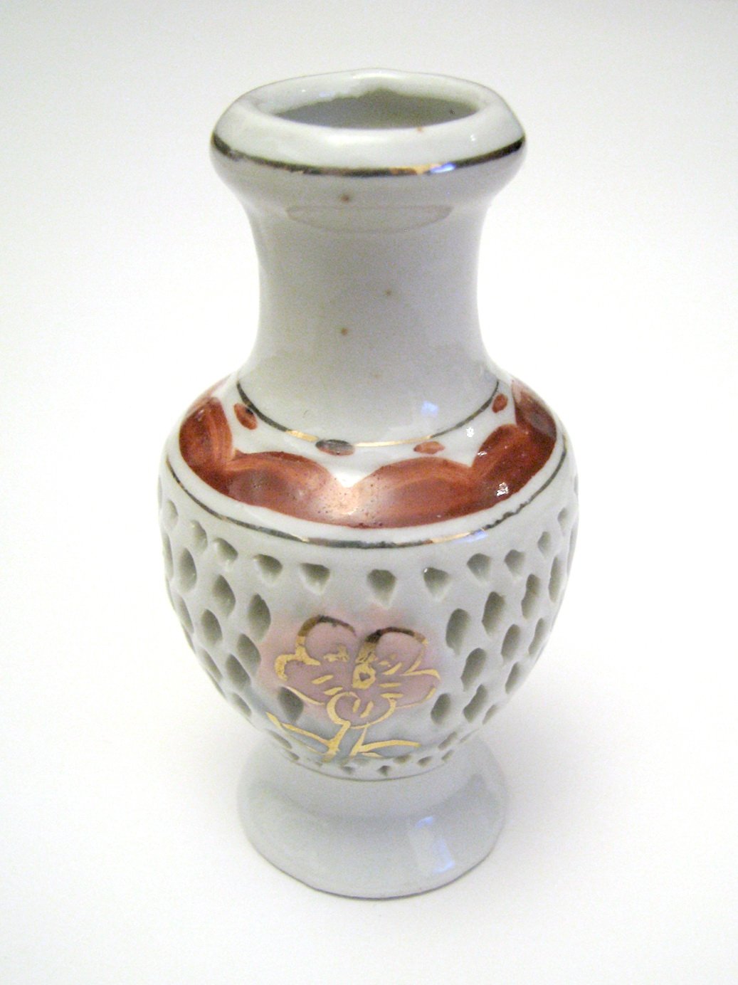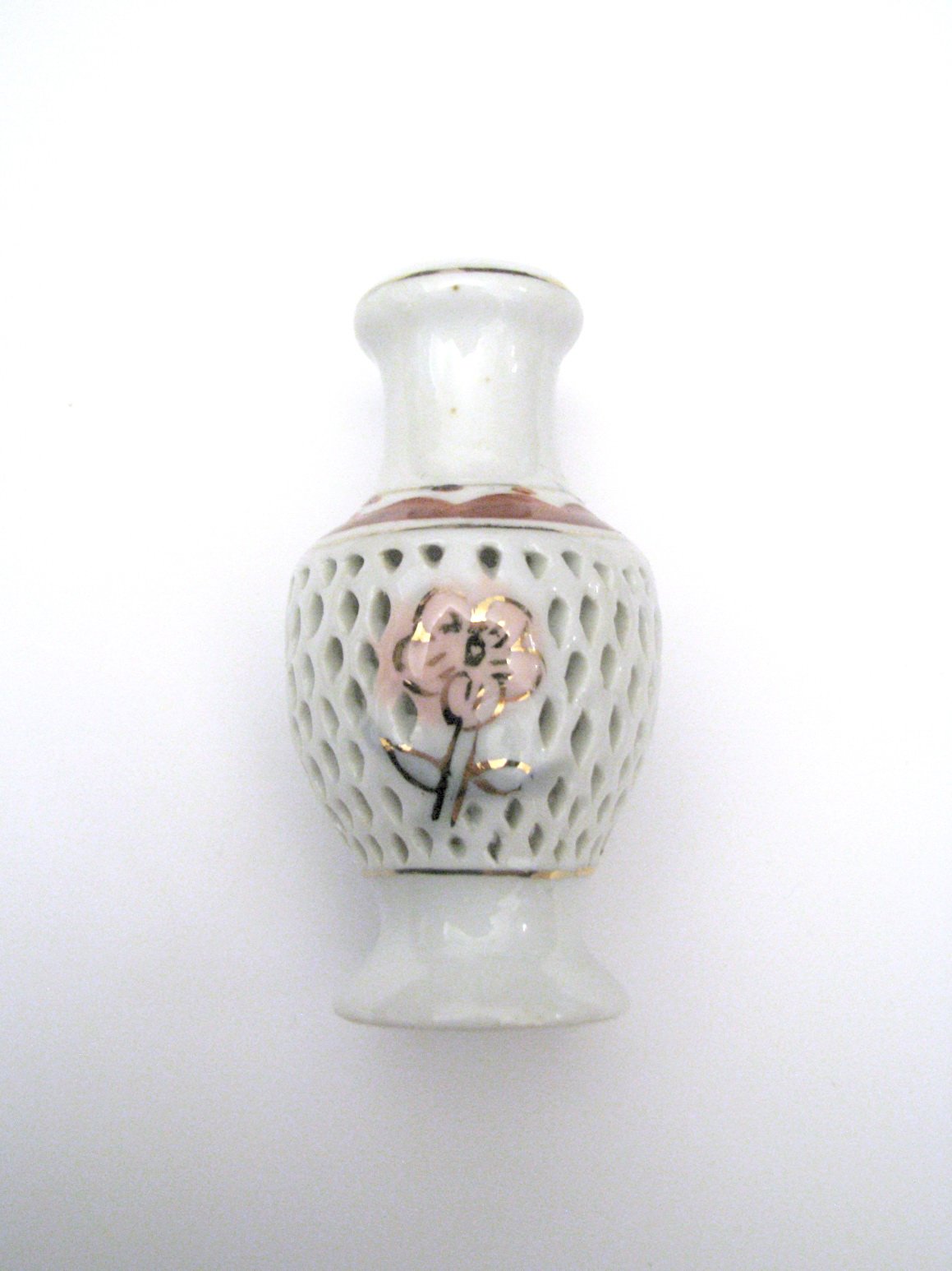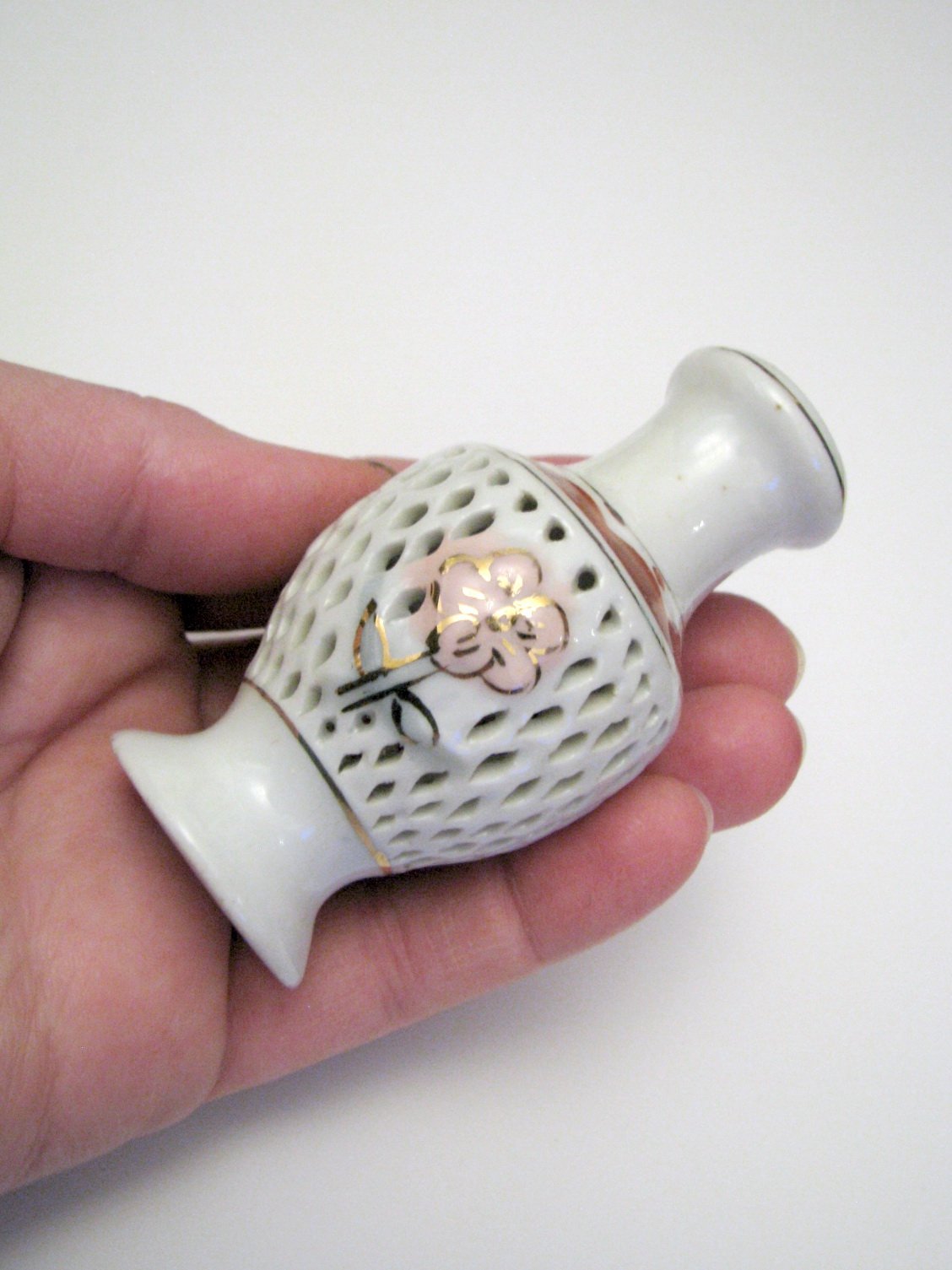 Malá stará porcelánová vázička s kvietkom, dierkovaná, so zlátenými detailmi. Výborne zachovalá, bez poškodení.
