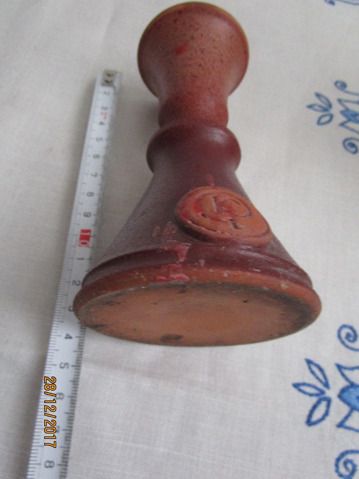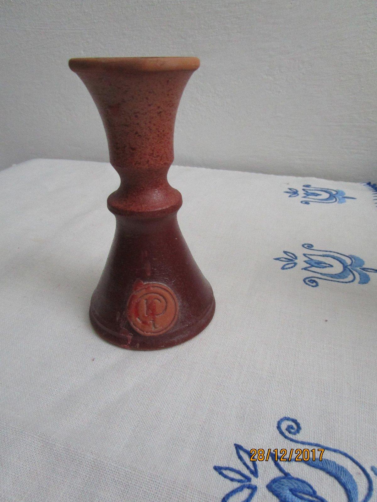 Keramický svietnik s monogramom na prednej strane.