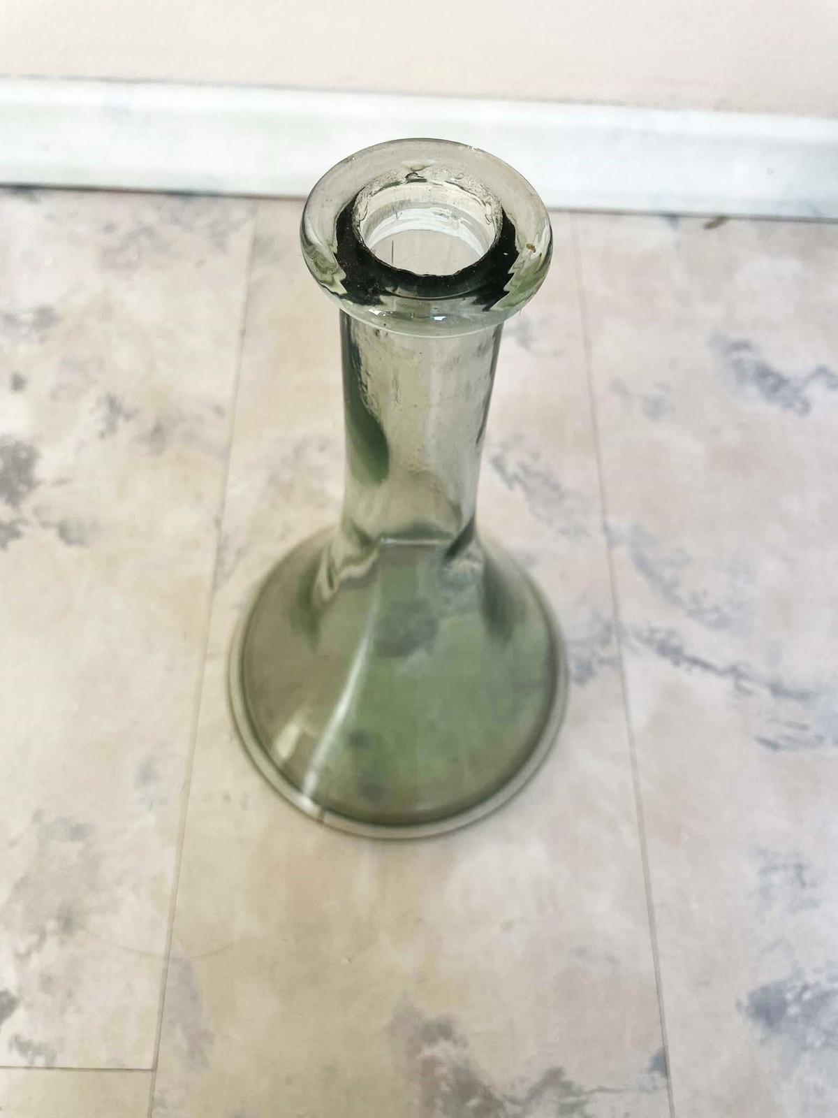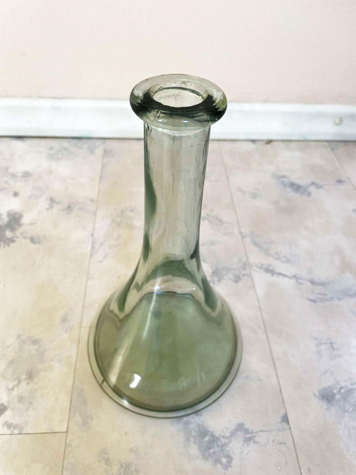 stará váza - karafa z hrubého olovnatého skla, výška = 27 cm, spodný priemer = 14 cm,v otvore hore je jemne poškodená od vrchnáka,ale nie je to vôbec vidno a esteticky to nevadí,ale upozorňujem,viď foto,výška = 27 cm, spodný priemer = 14 cm