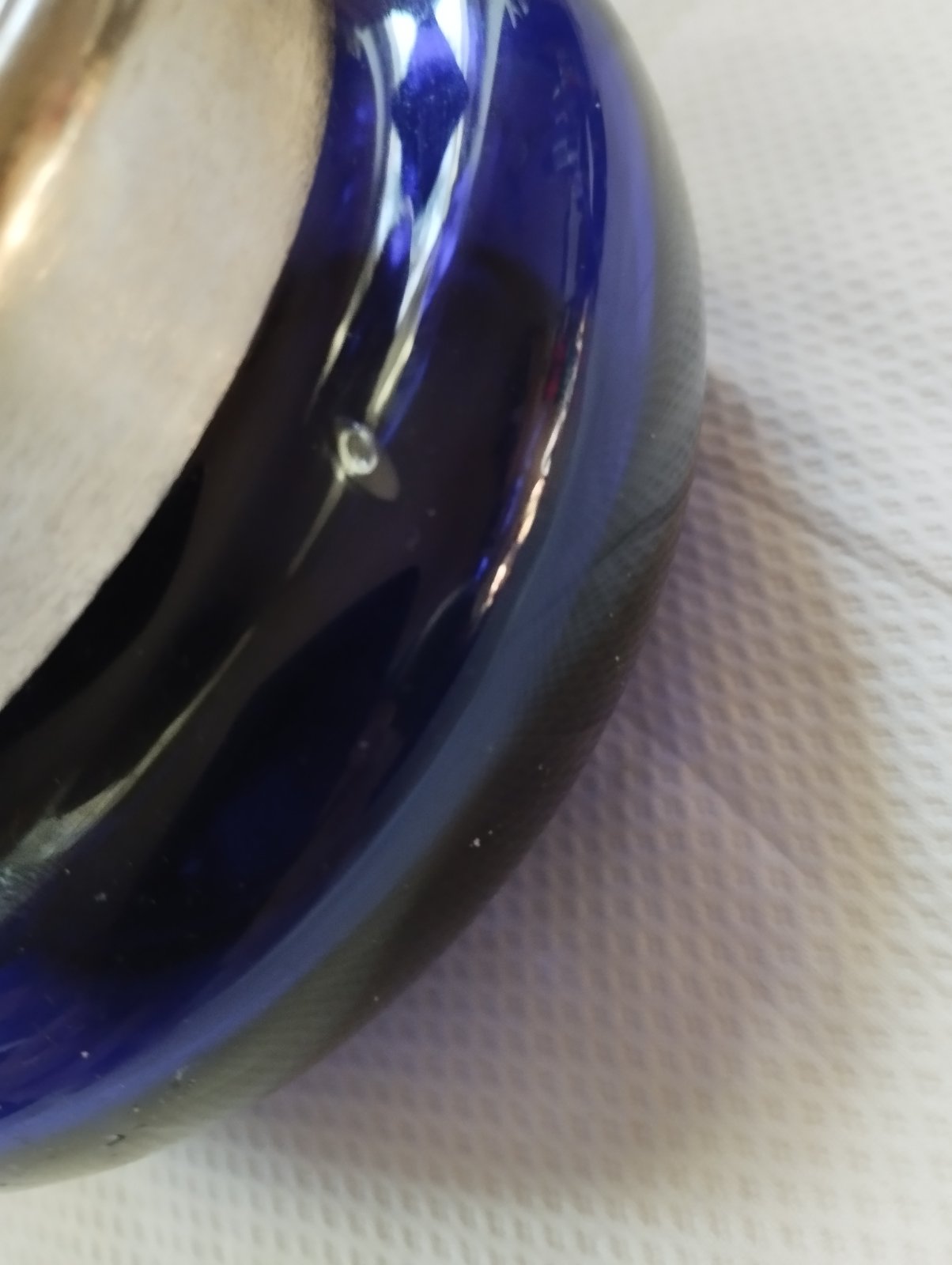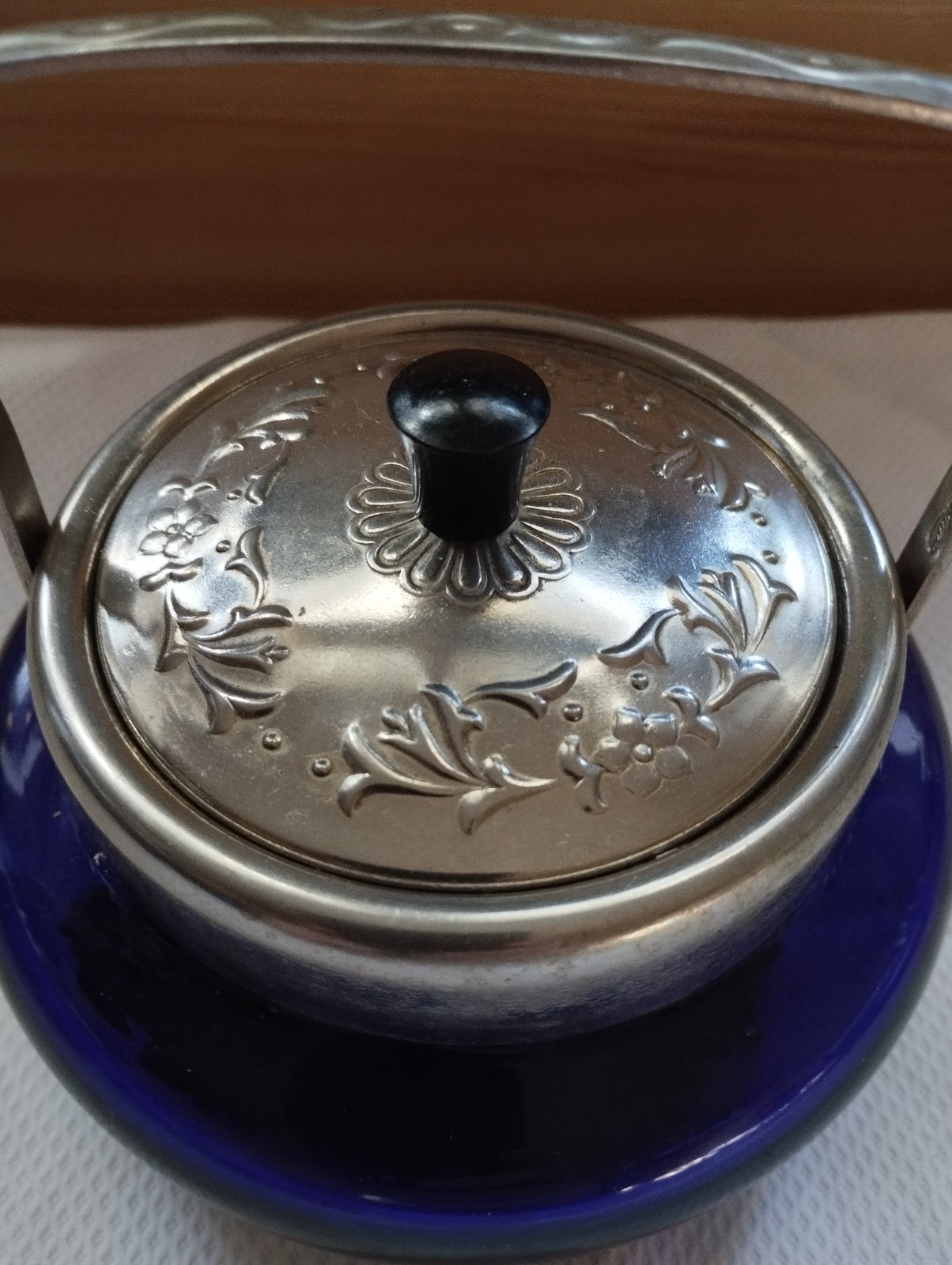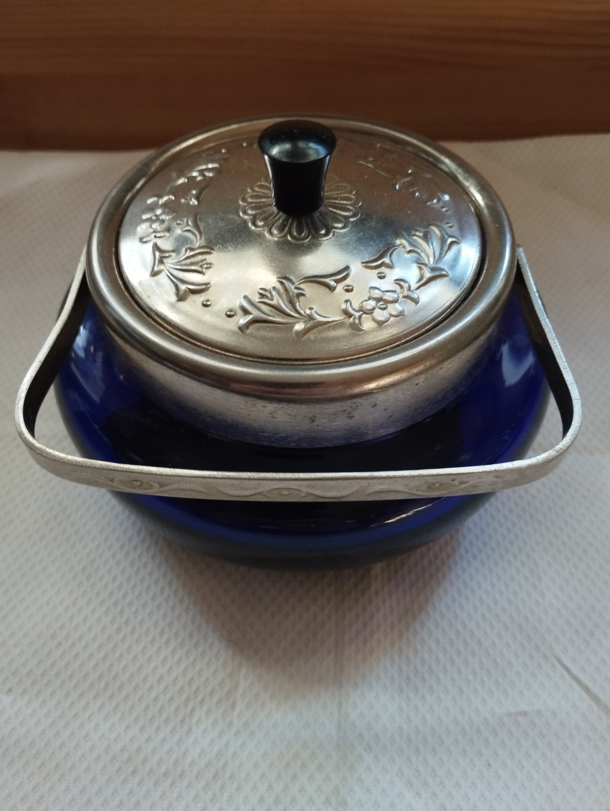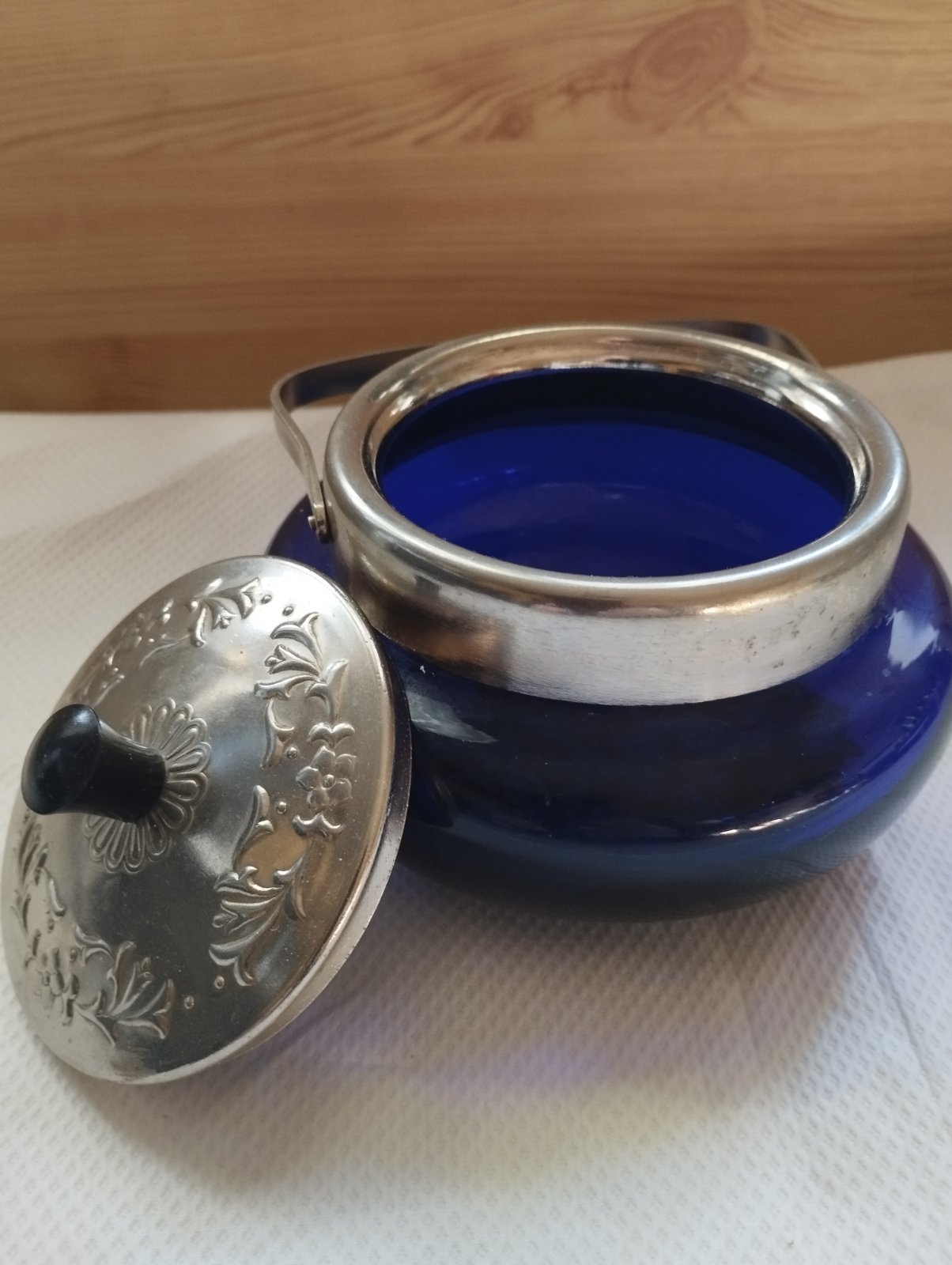Cukornicka z modrého skla na boku je malá strbinka, nafotené,je neviditeľná....priemer cca 13cm výška bez rúčky 9cm