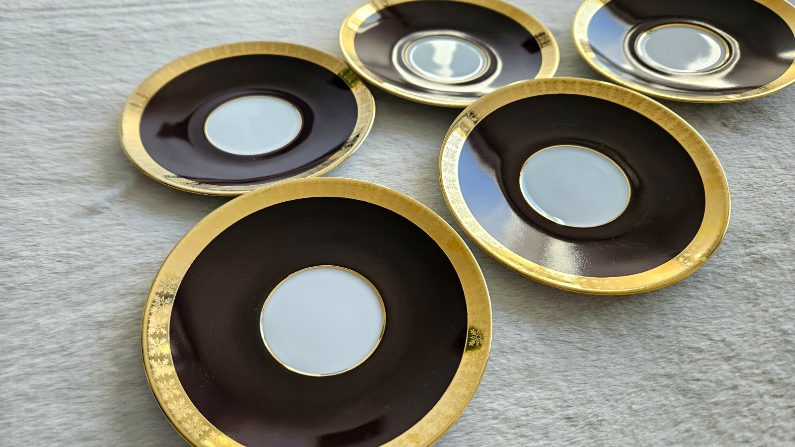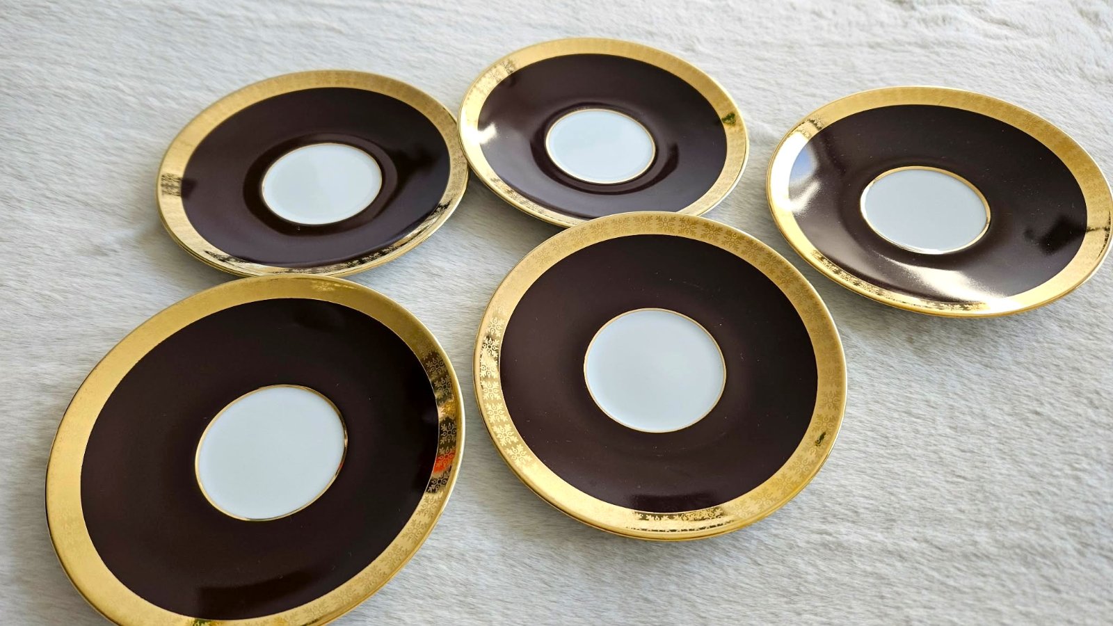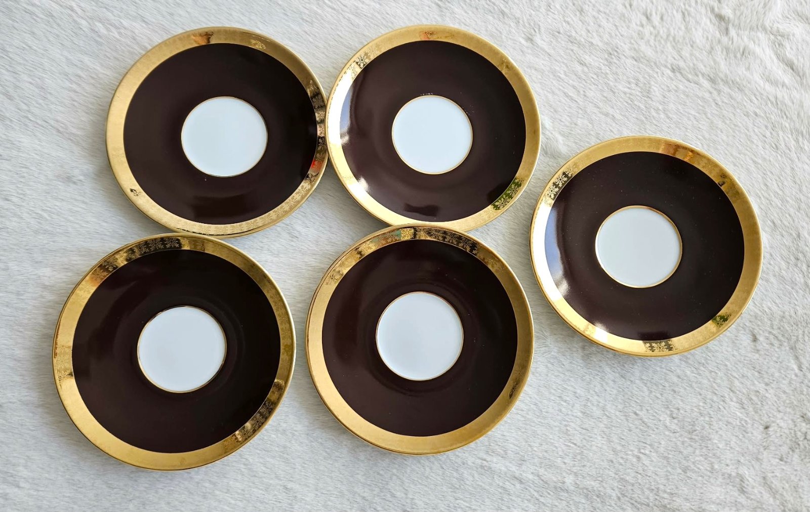 Retro porcelánové podšálky / tanieriky, biela/hnedá/zlatá, Československo, 5 ks