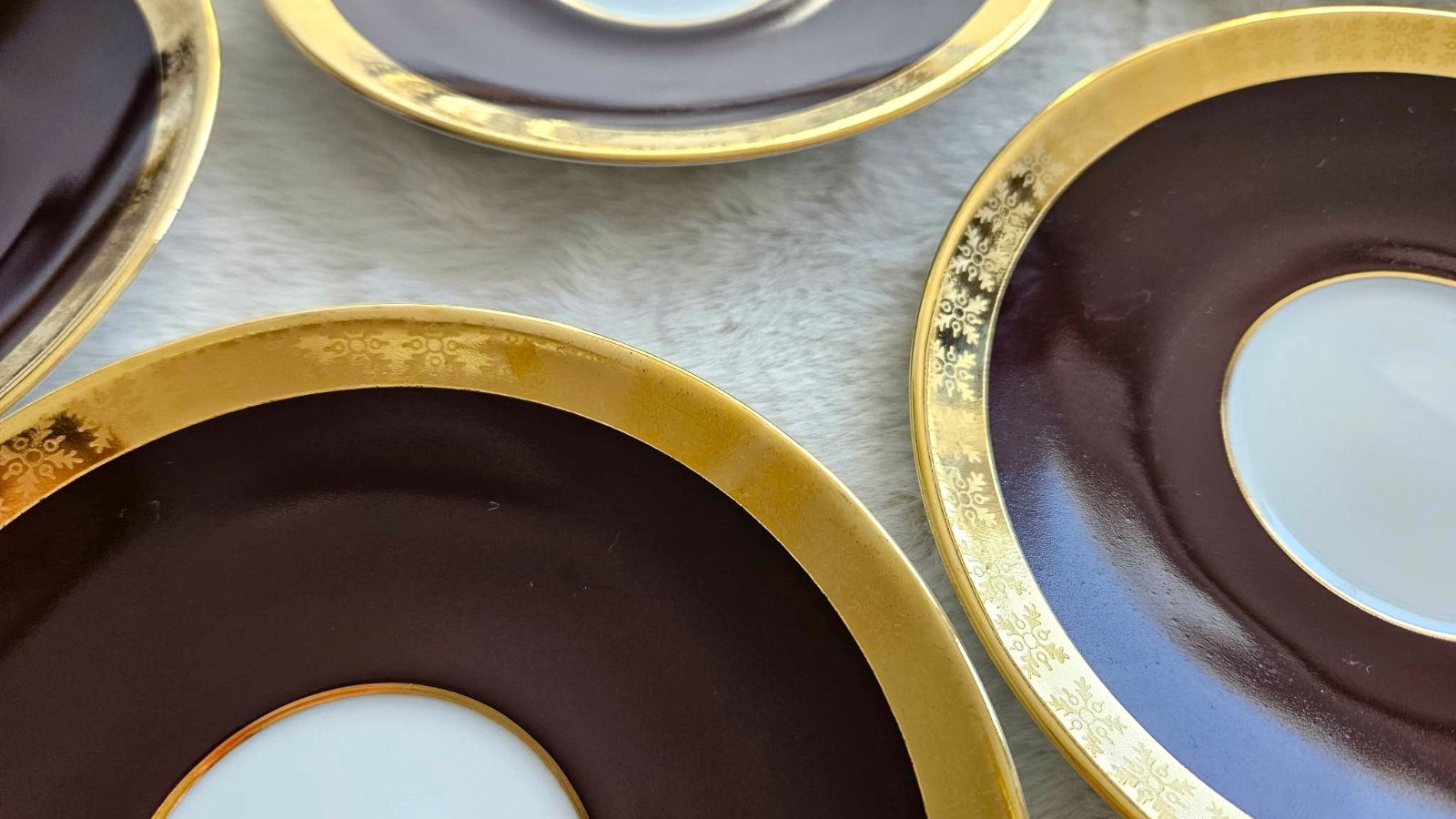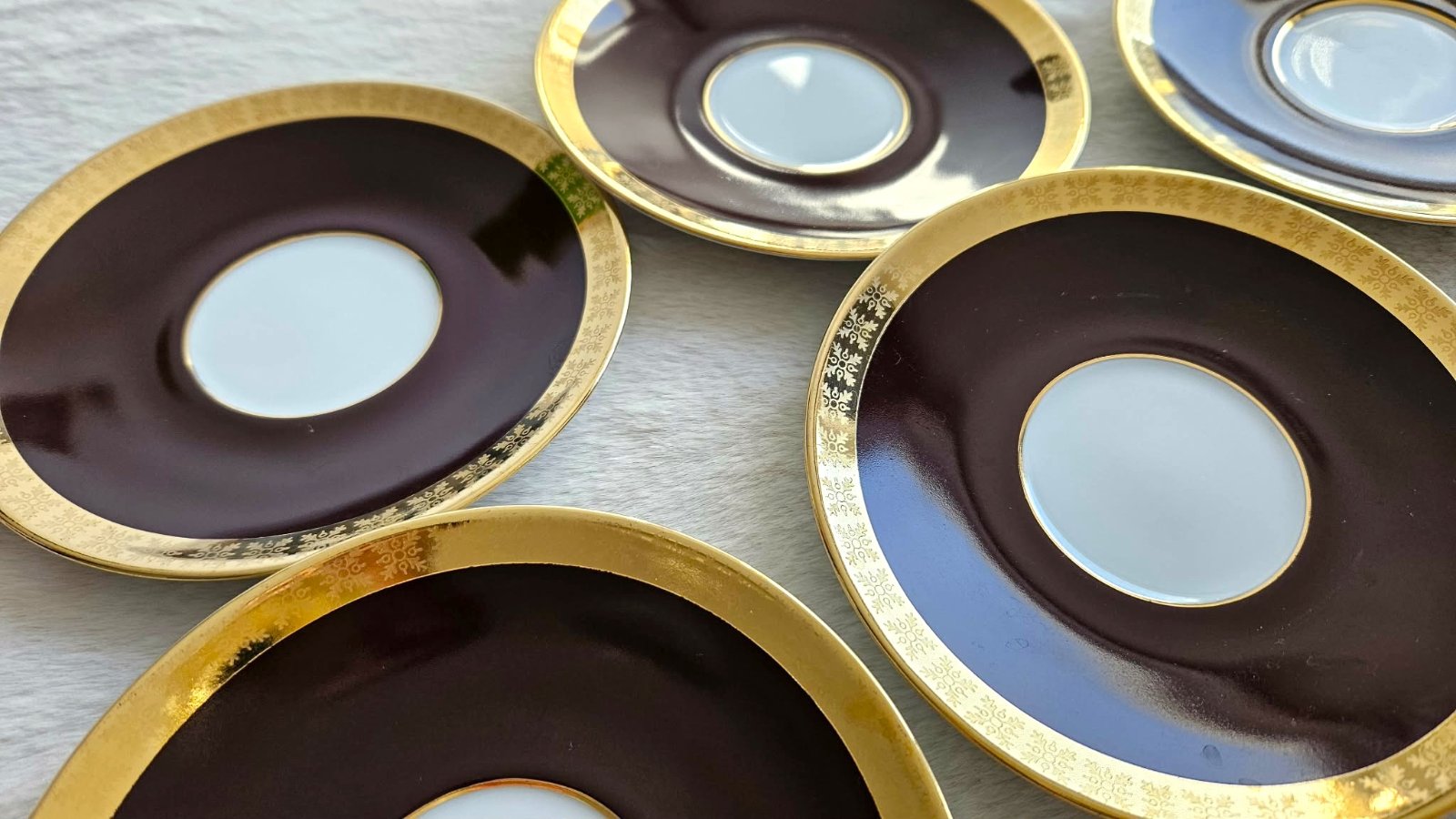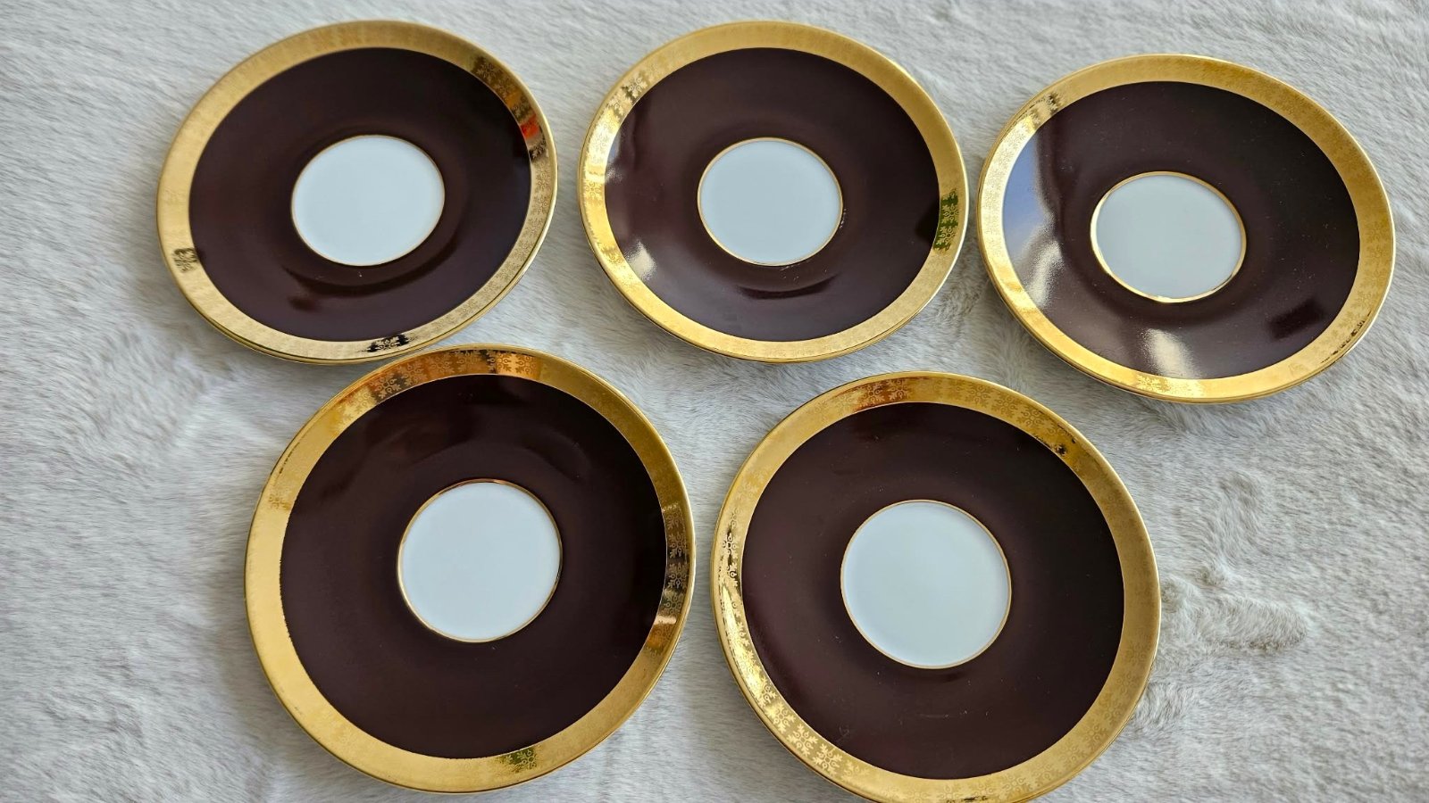 Retro porcelánové podšálky / tanieriky, biela/hnedá/zlatá, Československo, 5 ks
