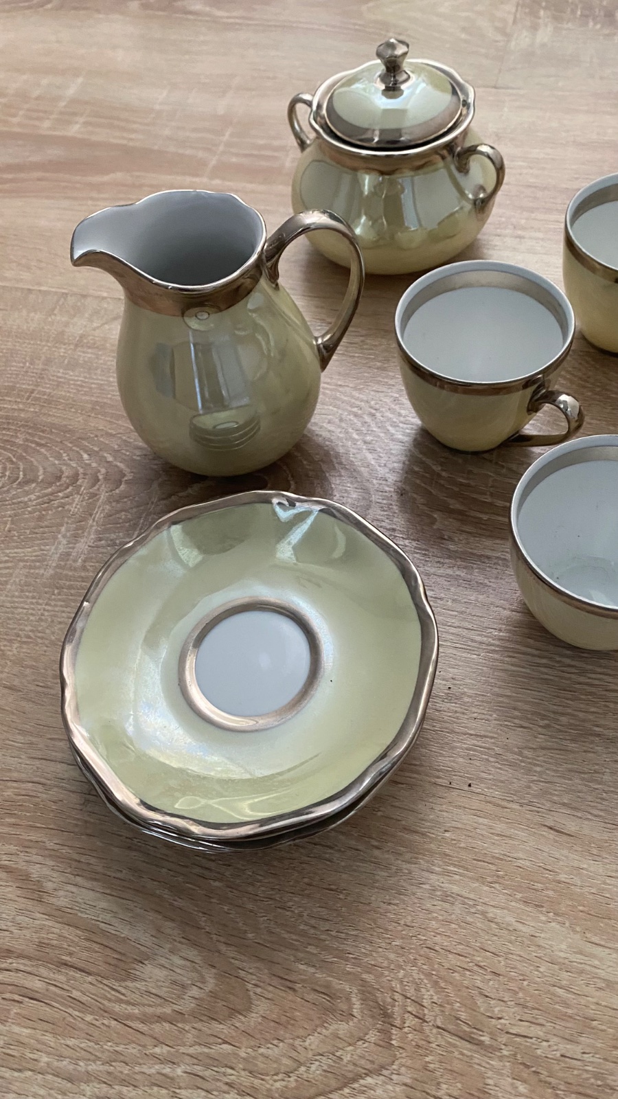 Predam neposkodeny porcelan v peknej zlto-perletovej farbe, 4 salky na kavu, 4 podsalky, mliecnik a cukornicka.