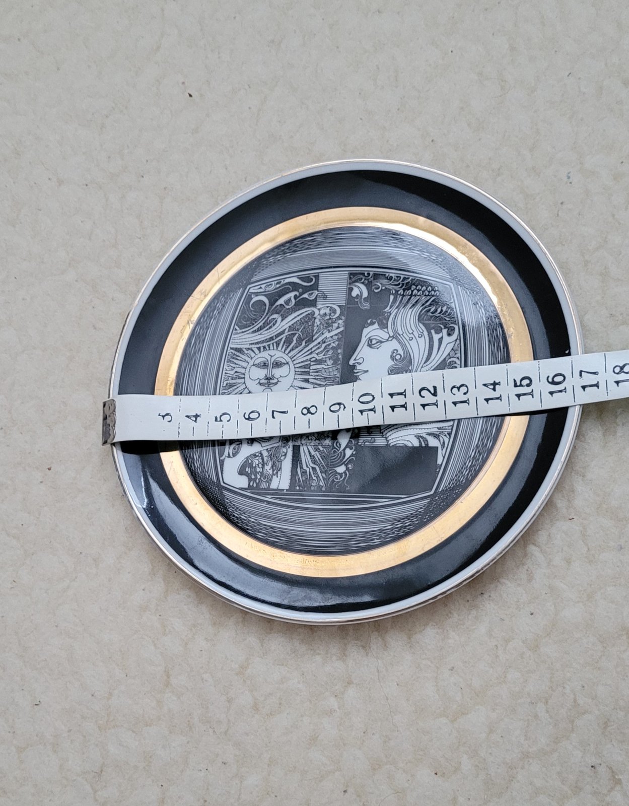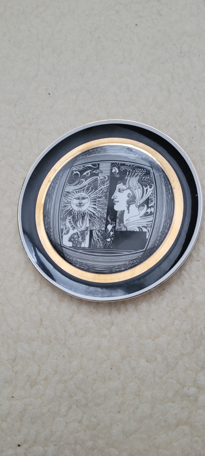 Zdobí ho grafika od významného maď. umelca Endreho Szásza z r. 70. a 80 r. 20. storočia. Konkrétny motív sa nazýva Slnečné svetlo (Napfény) Ručne maľovaný porcelán s prvkami pozlatenými 24 – karátovým zlatom. Je určený ako nástenná dekorácia alebo zberateľský predmet. Pochádza z produkcie maď. porceklánky Hollóháza, v perfektnom stave.