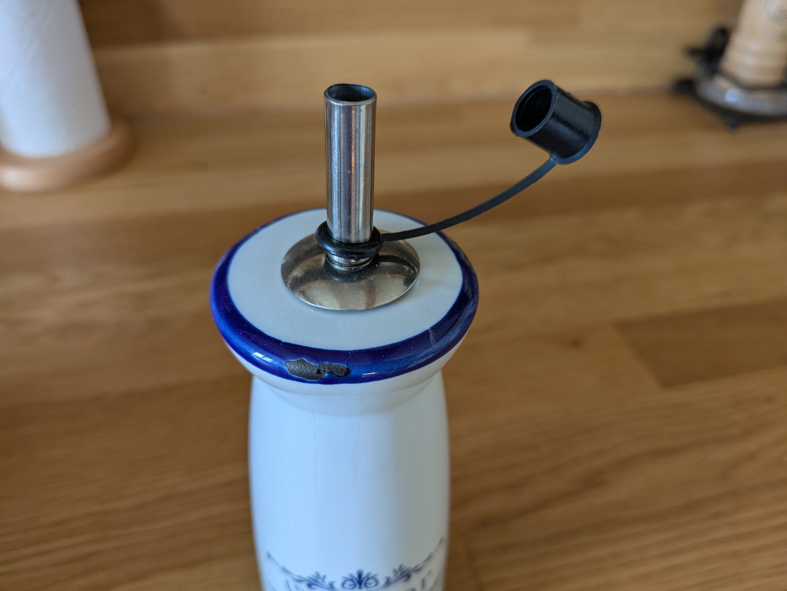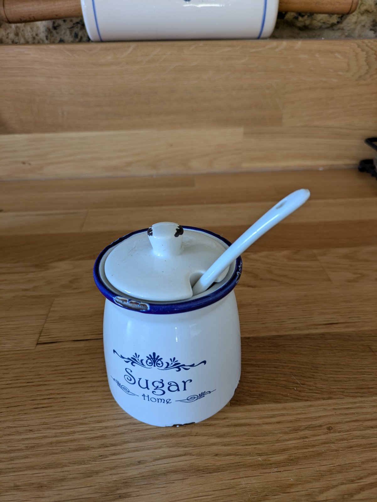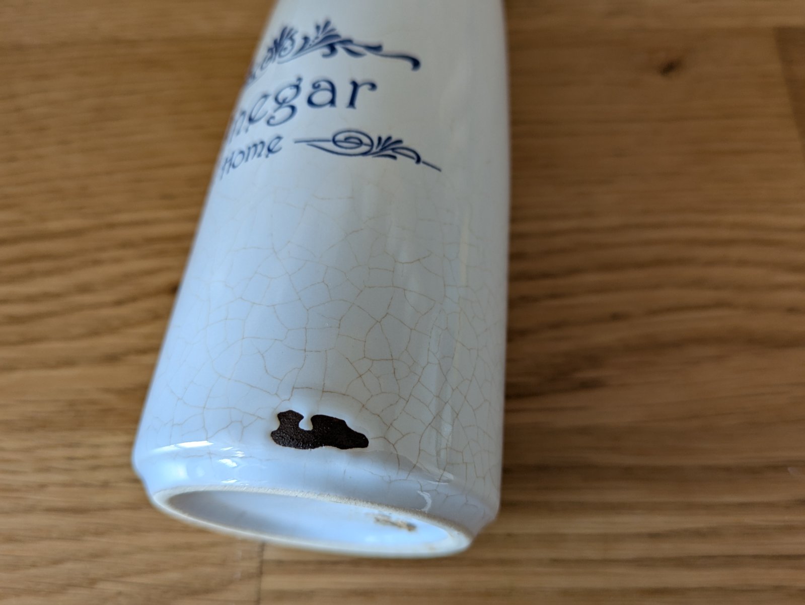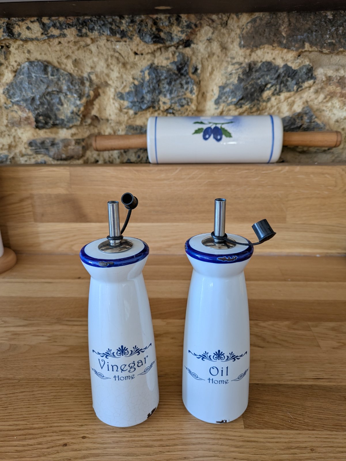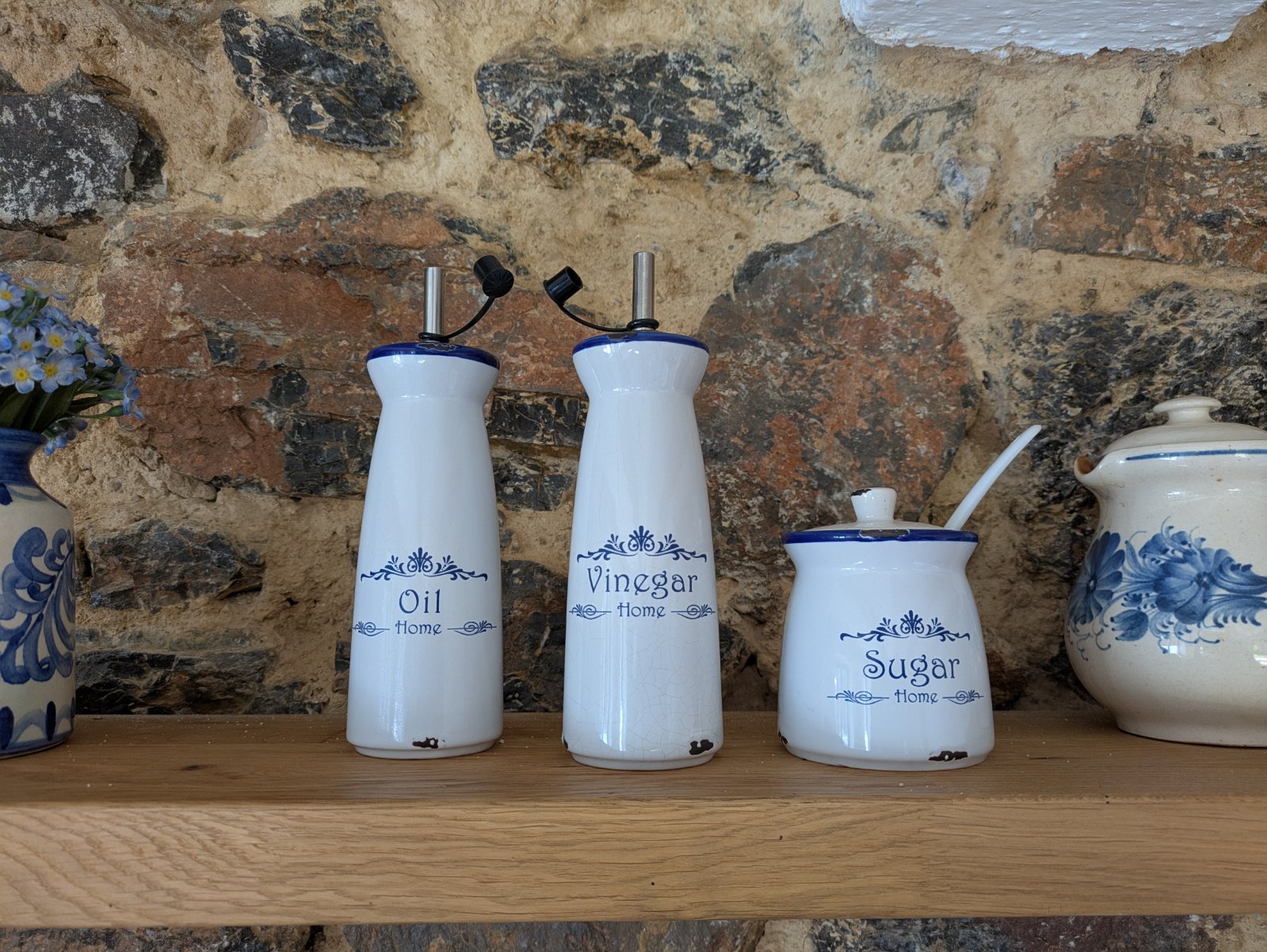 Predám keramické nádobky na olej, ocot a cukor. Vzhľad starého obitého smaltu. Nepoškodené. Cukornička má keramickú lyžičku.
