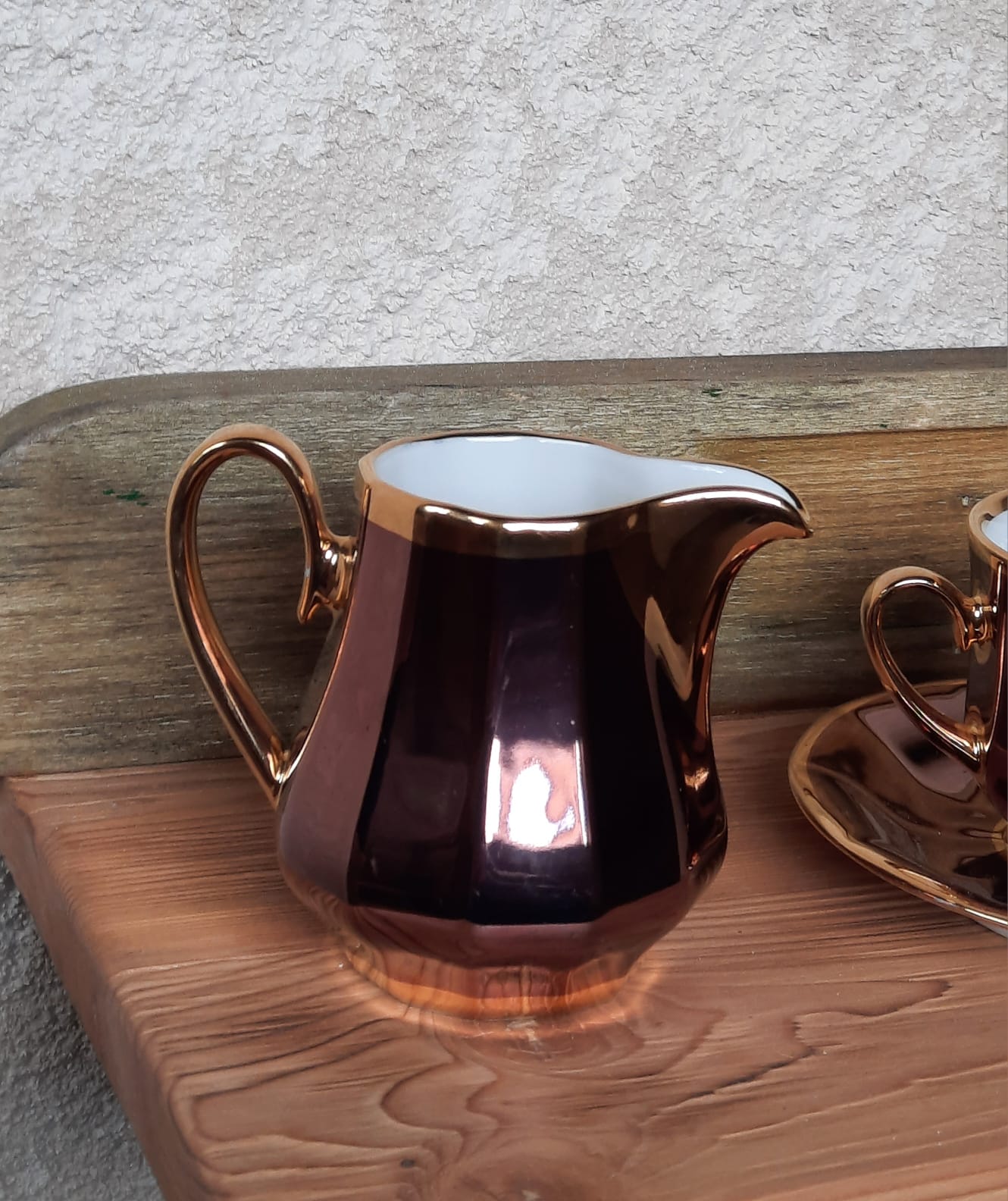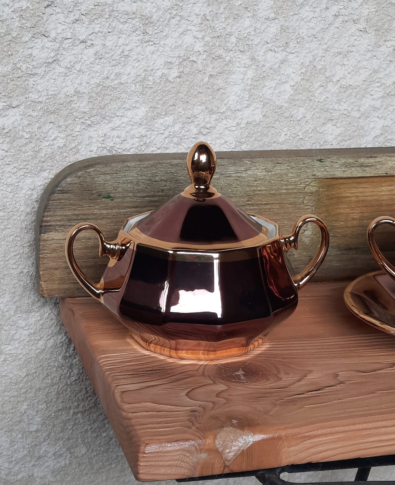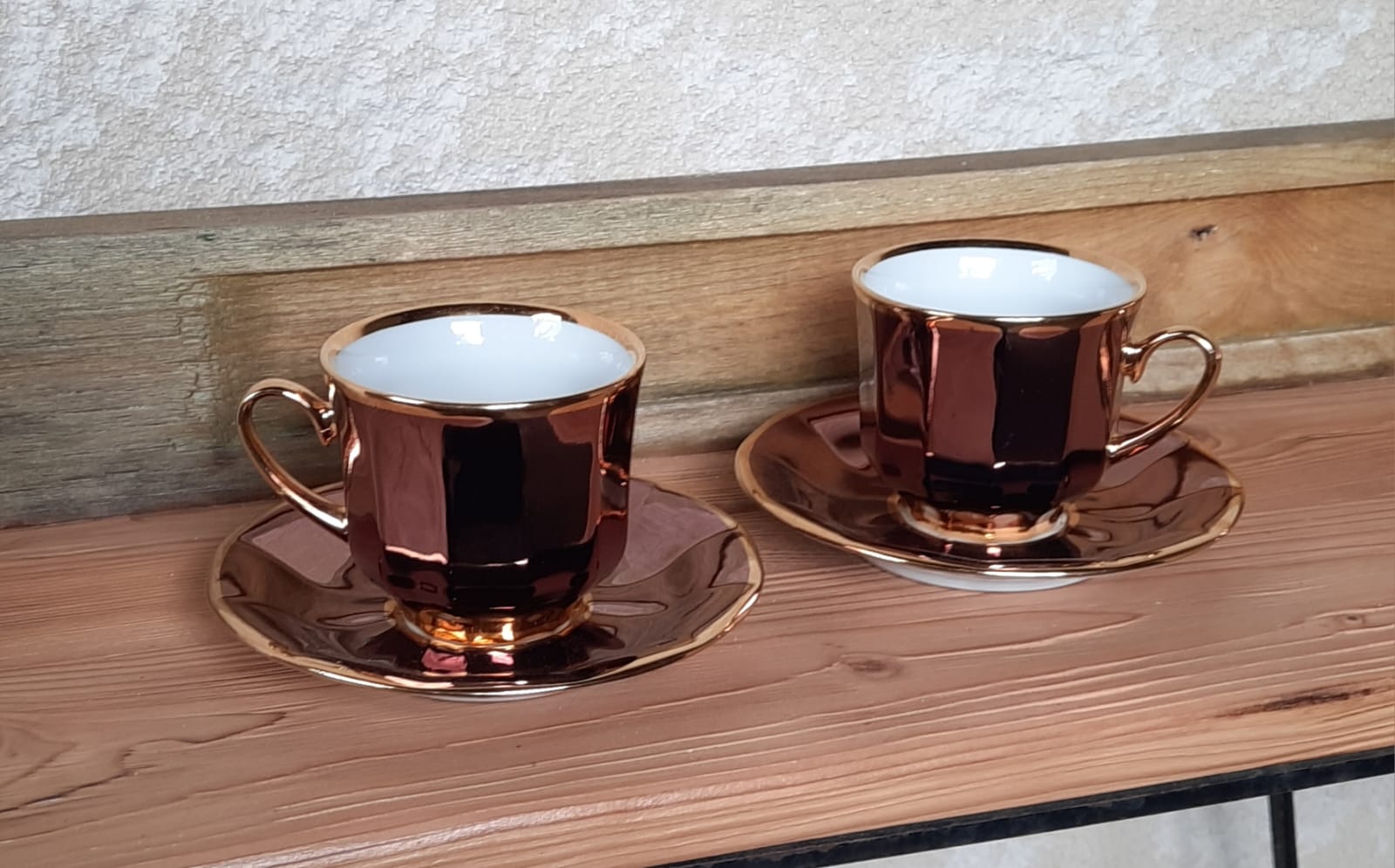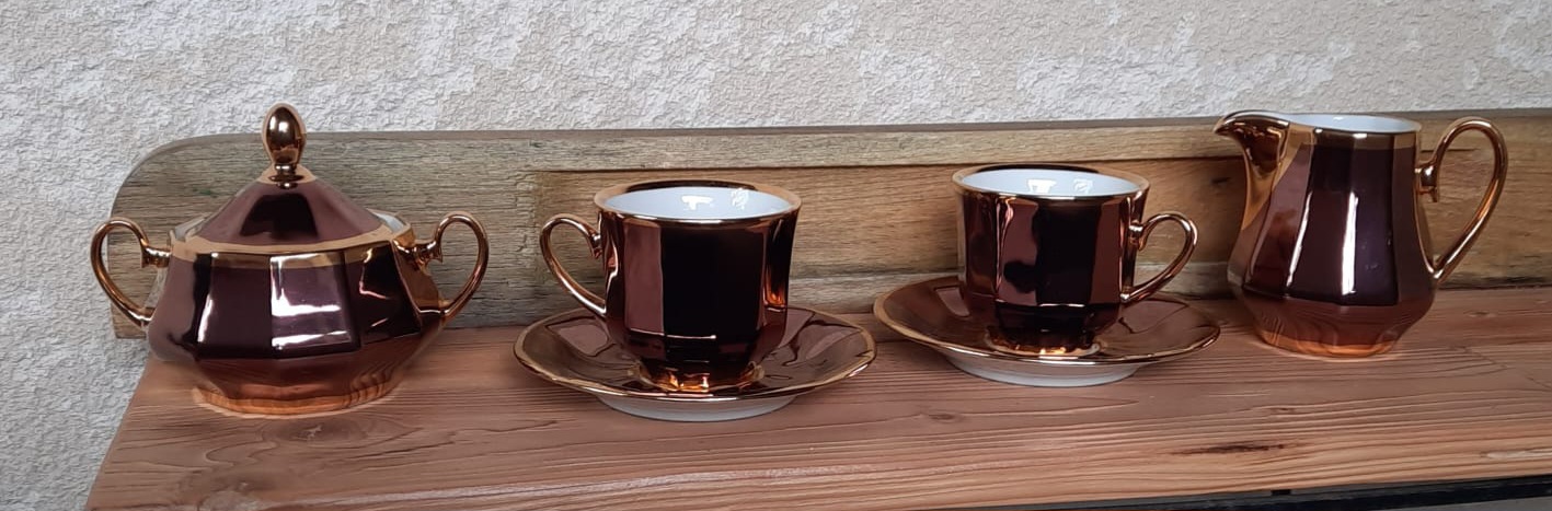 Nepoužívaná sada hnedá metalíza, 2x šálky +pošálky, mliečnik, cukornička....
