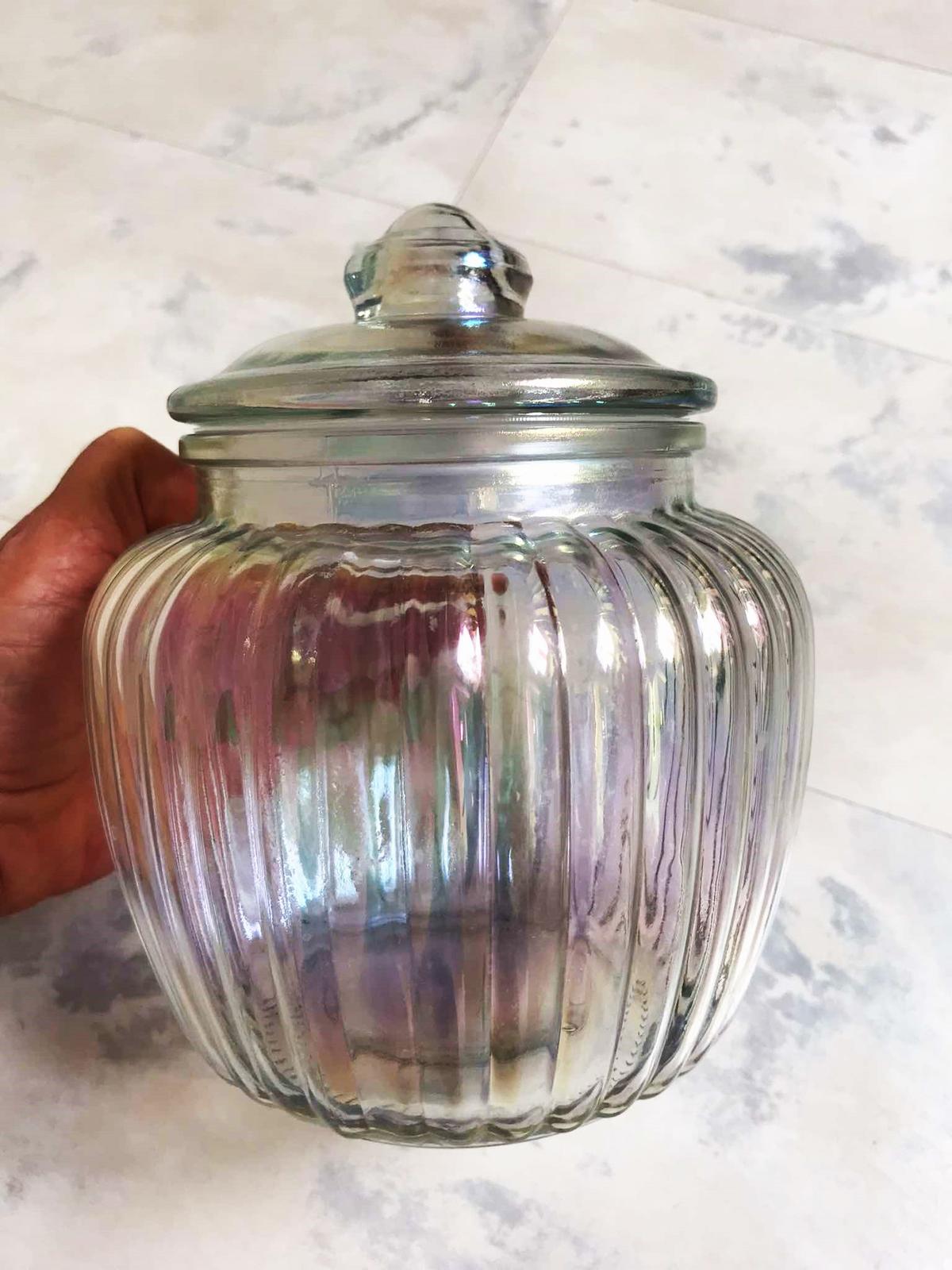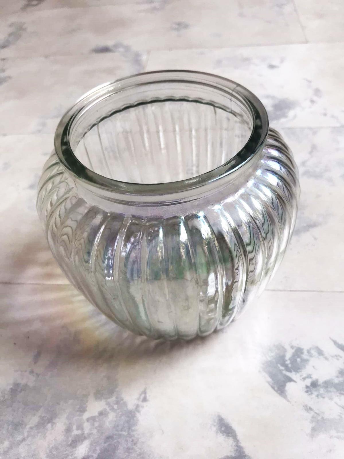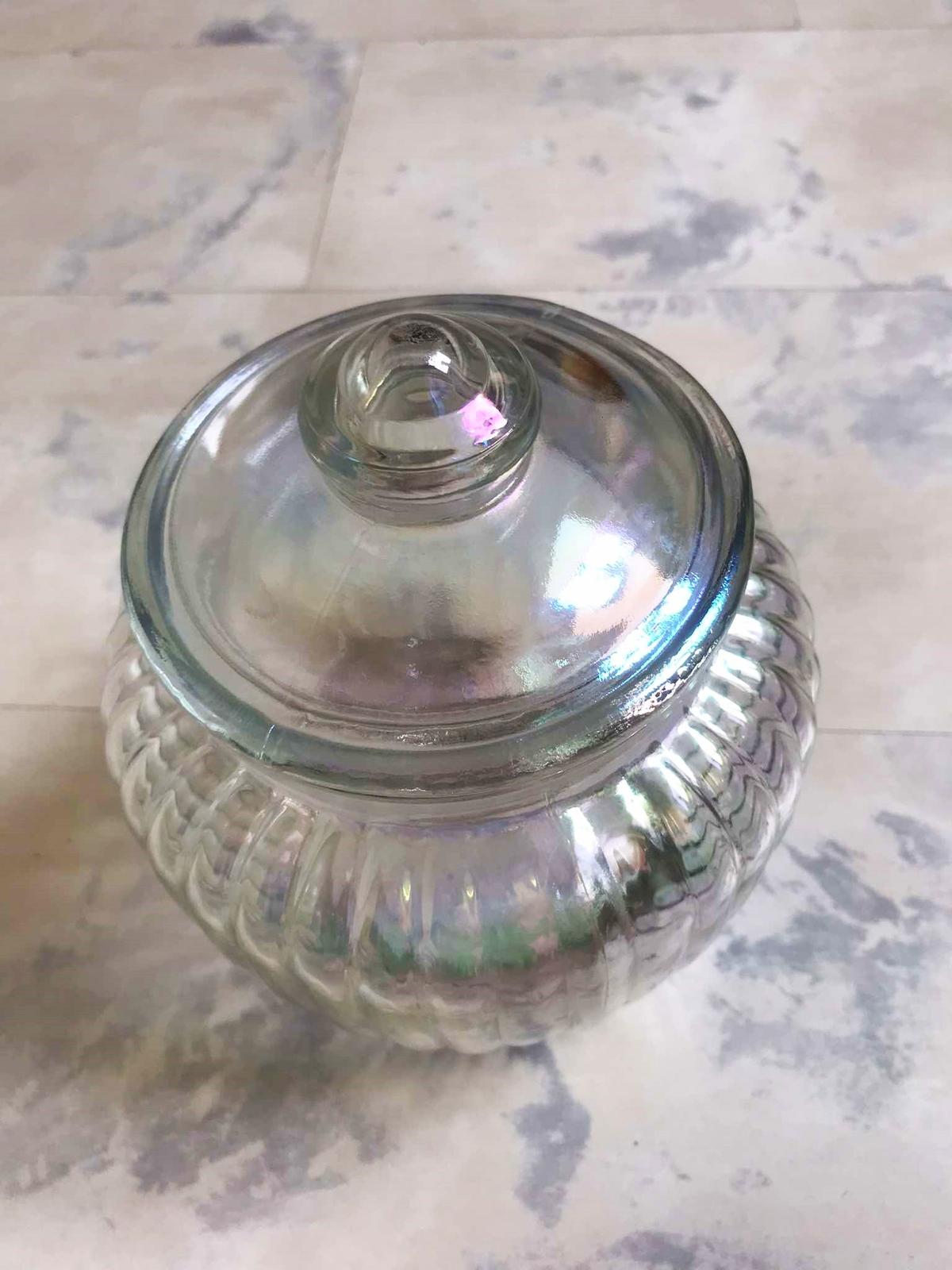 vo svetle hraje rôznymi farbami dúhy,krásny doplnok,je plne funkčná - s tesniacim uzáverom,v top stave,výška = 18 cm,šírka v najširšej časti = 16 cm,spodný priemer = 10 cm,vrchný = 11 cm, dá sa použiť aj ako dóza,alebo krásna váza
