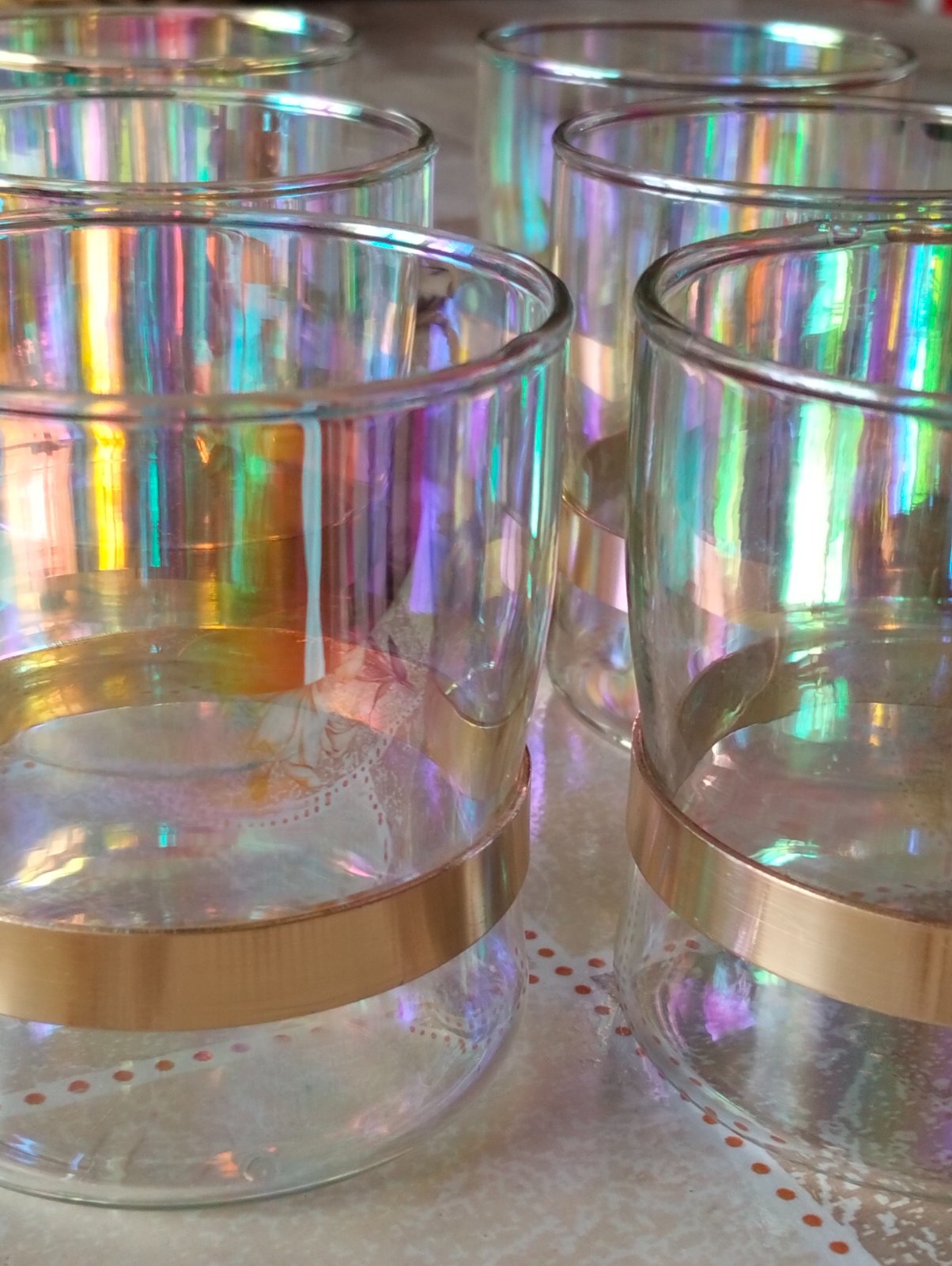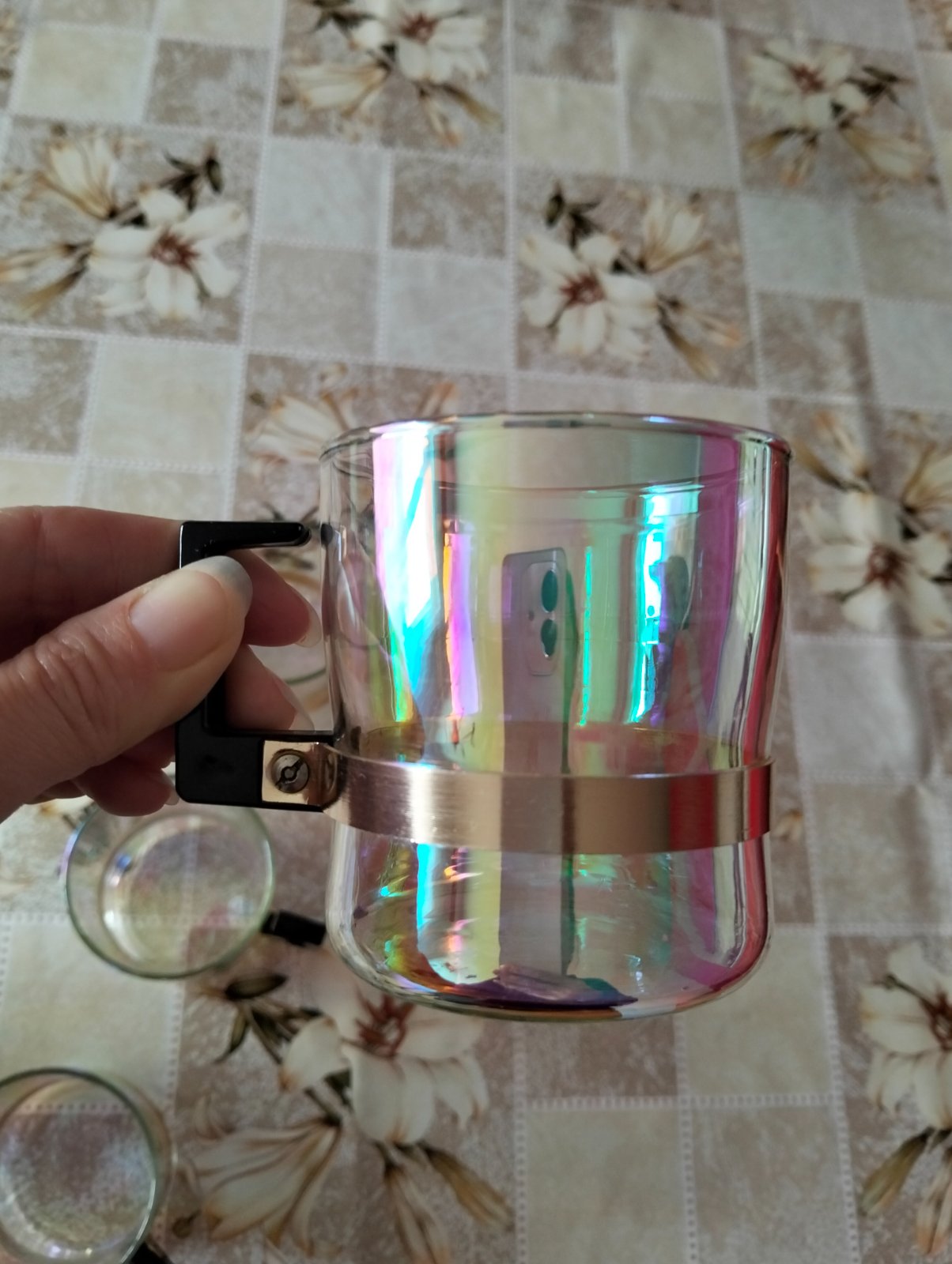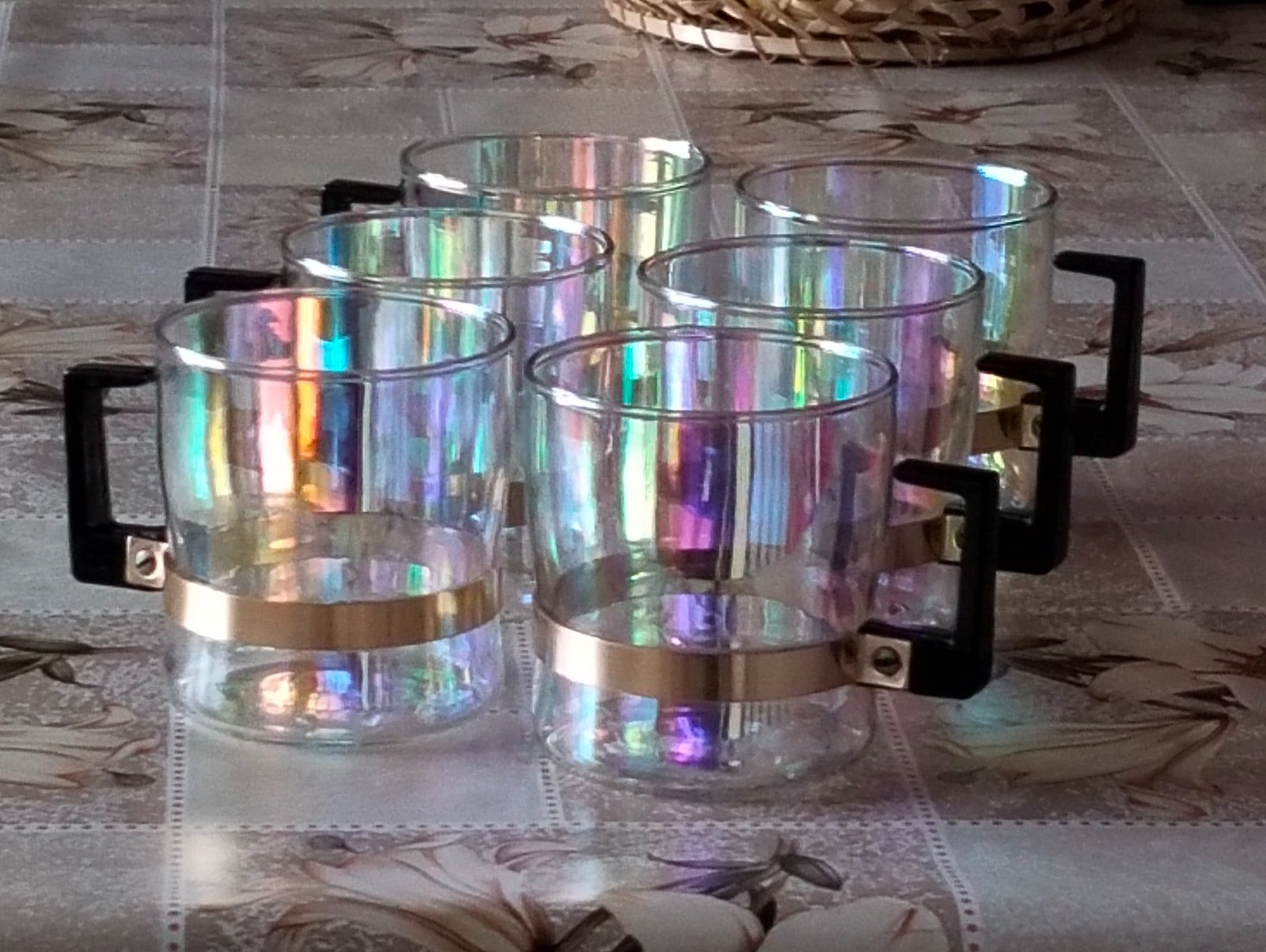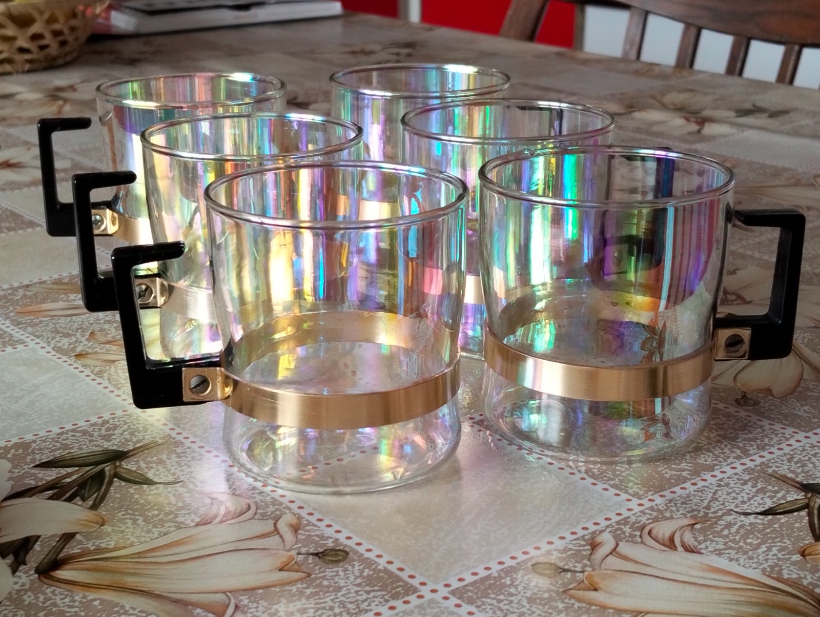 Retro sada 6 ks sklenených šálok na kávu značky Simax, s dúhovým efektom a čiernymi plastovými a kovovými rúčkami. Tieto poháre sú ikonickým kúskom úžitkového skla, ktorý bol v Československu populárny najmä v období od 60. do 80. rokov.