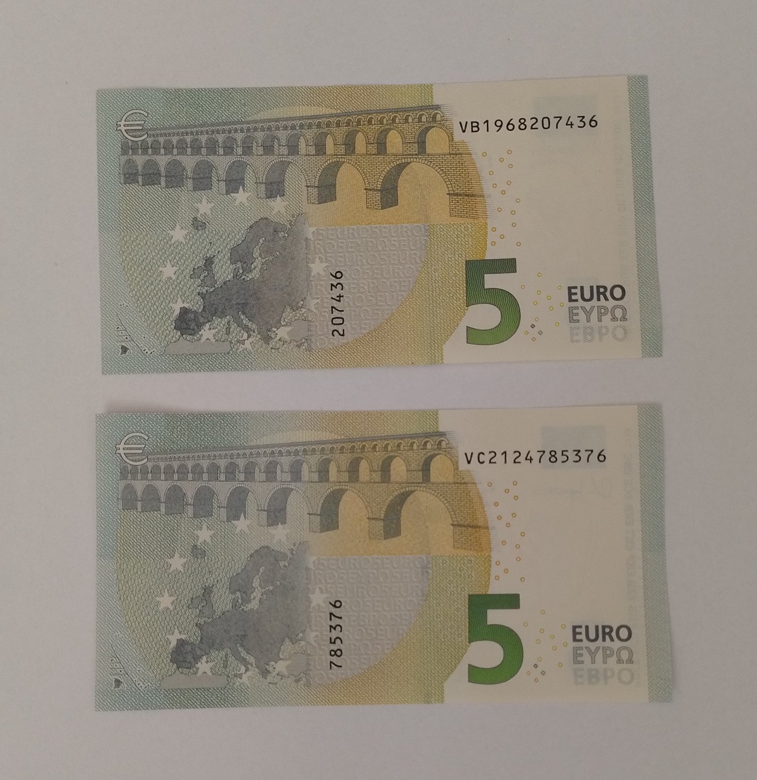 Dve 5€ bankovky zo Španielskej tlačiarne. Prvá bankovka je séria VB posledná s podpisom tretieho prezidenta ECB M. Draghi a druhá bankovka je nasledujúca séria VC s prvým podpisom štvrtej prezidentky ECB Ch. Lagarde.
