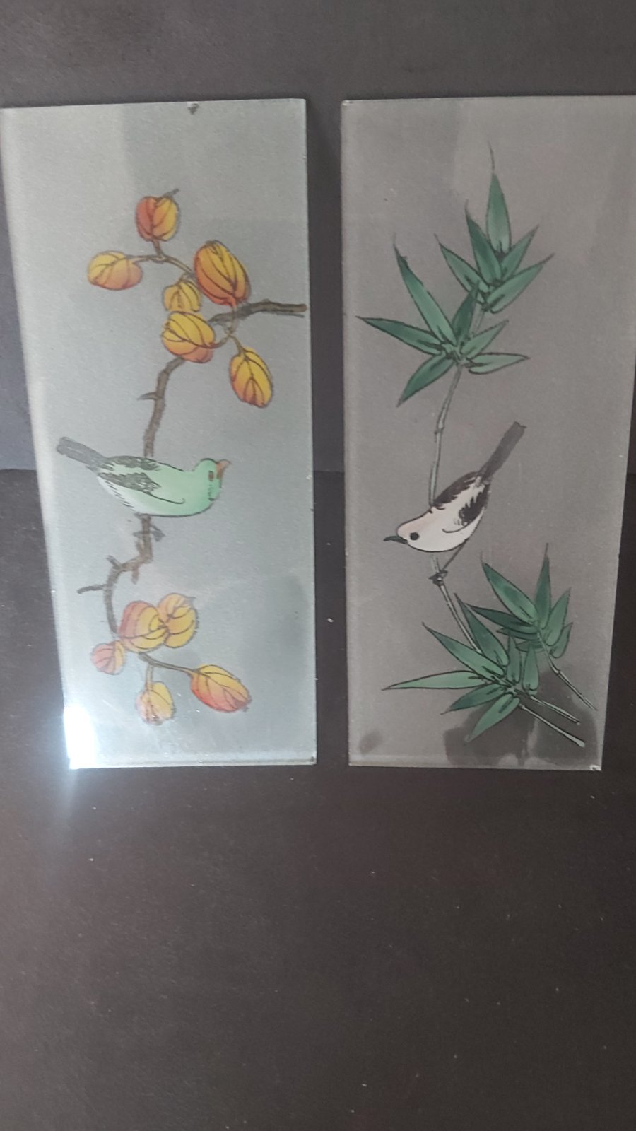 predám 2 ks ručne obrázkov maľovaných na skle s motívom vtáčikov. Dá sa zarámovať, alebo použiť inak, záleží na vašej kreativite. Cena je za obidva sklené obrázky Osobný odber alebo pošlem poštou ktorú hradí kupujúci.