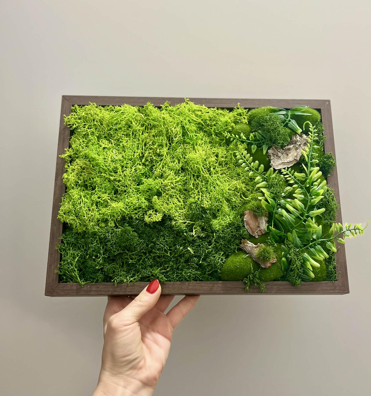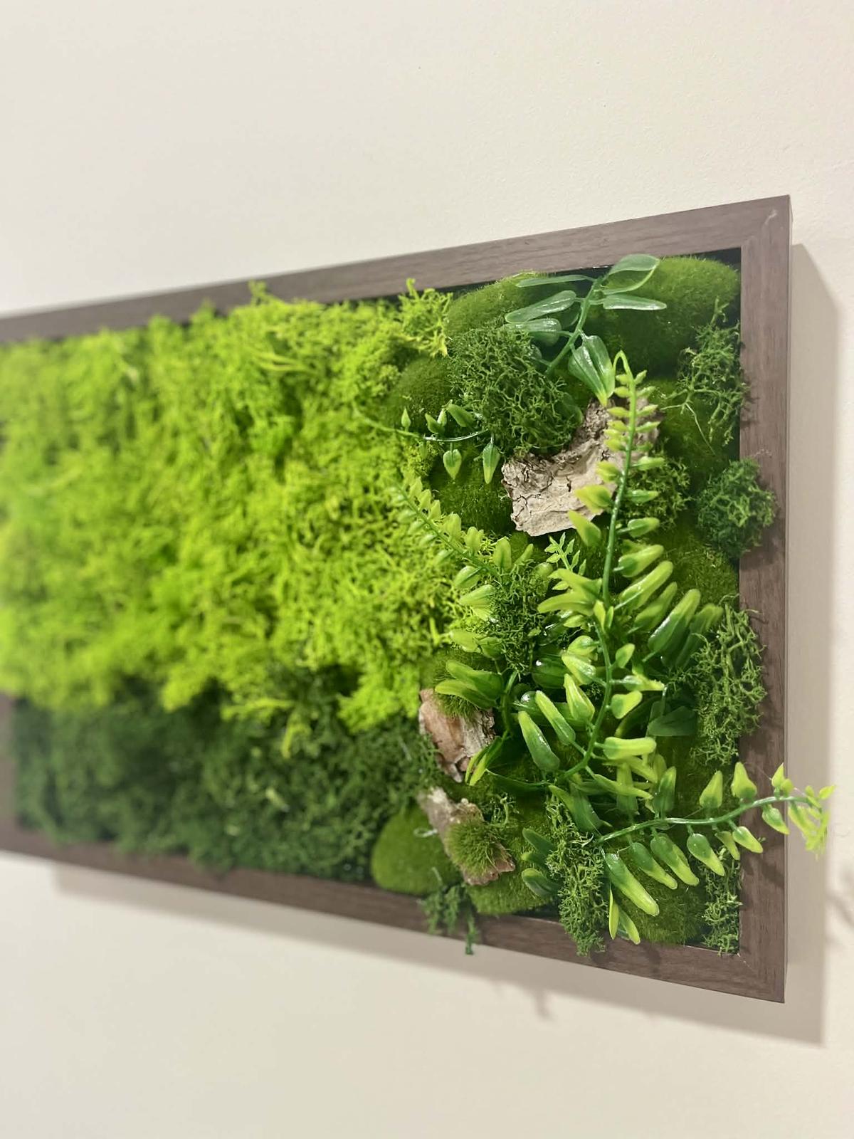 Obraz „Zelený horizont“ je originální interiérový doplněk, který spojuje přírodní estetiku s moderním designem. Kombinace vysoce kvalitního stabilizovaného mechu v různých odstínech zelené a pečlivě zakomponovaných dekorativních prvků vytváří nádhernou 3D strukturu plnou hloubky a detailů.