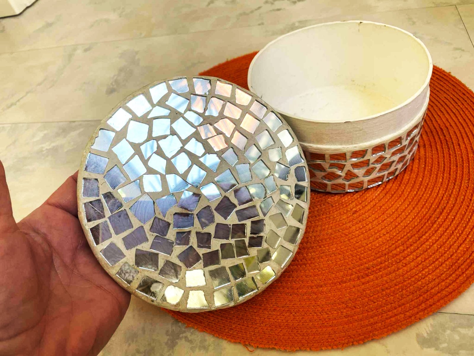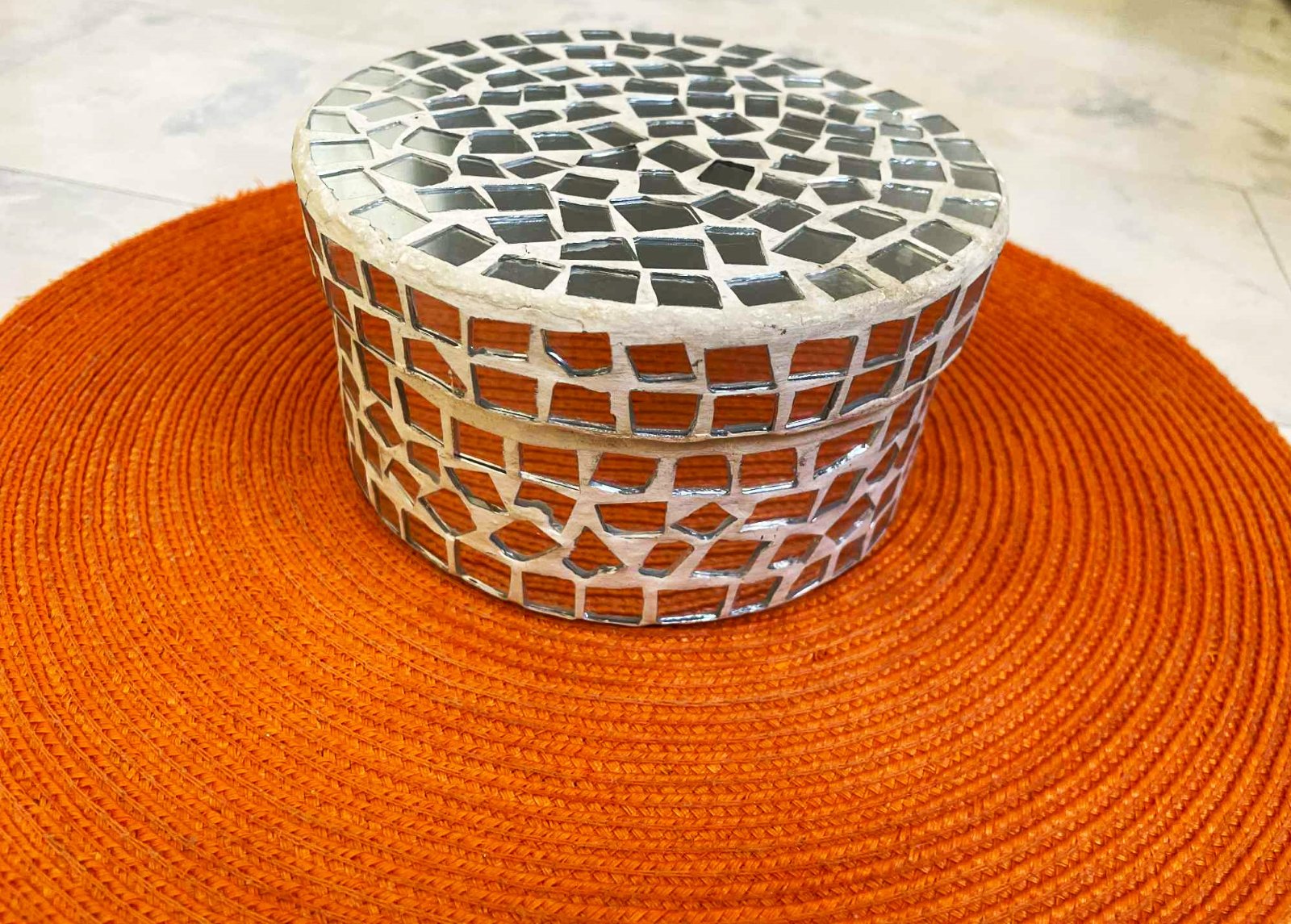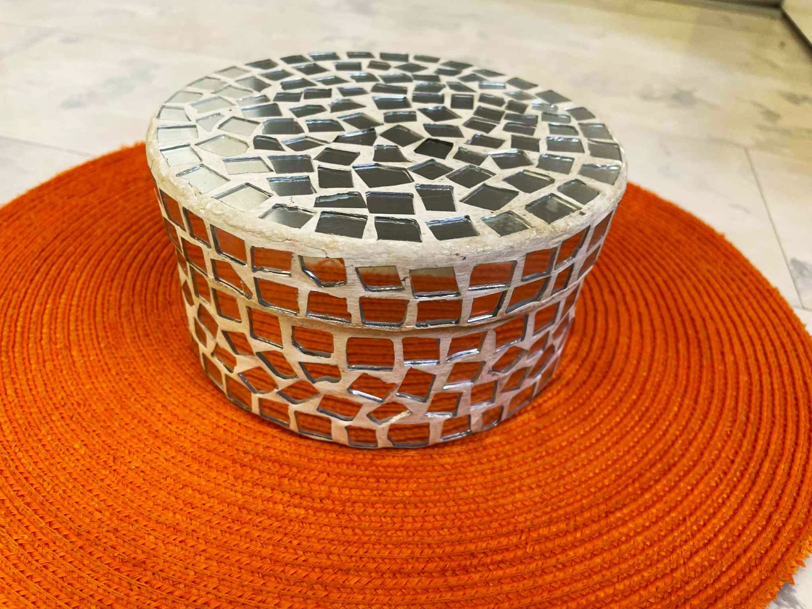 vkusná,celá trblietavá,zrkadlová mozaika,veľmi pekný starý doplnok,priemer 15 cm,výška 8 cm