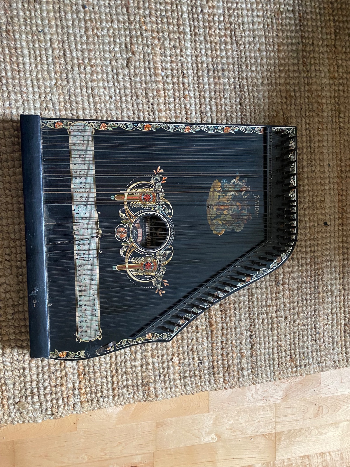 Predám starožitnú citaru typu Guitar-Zither (model Lyra-Adler), originál nemecká výroba, bohato zdobená ručnými ornamentmi a pôvodnou grafikou. Ide o veľmi pekný dekoratívny a zberateľský kus.