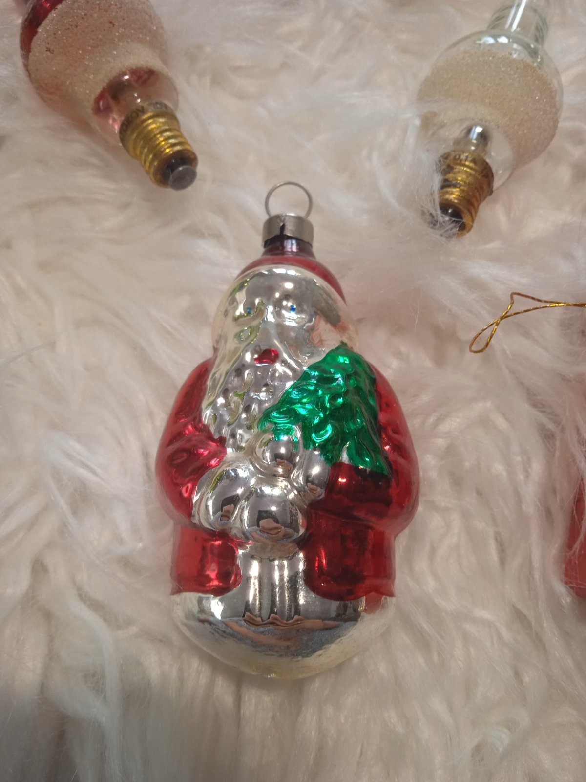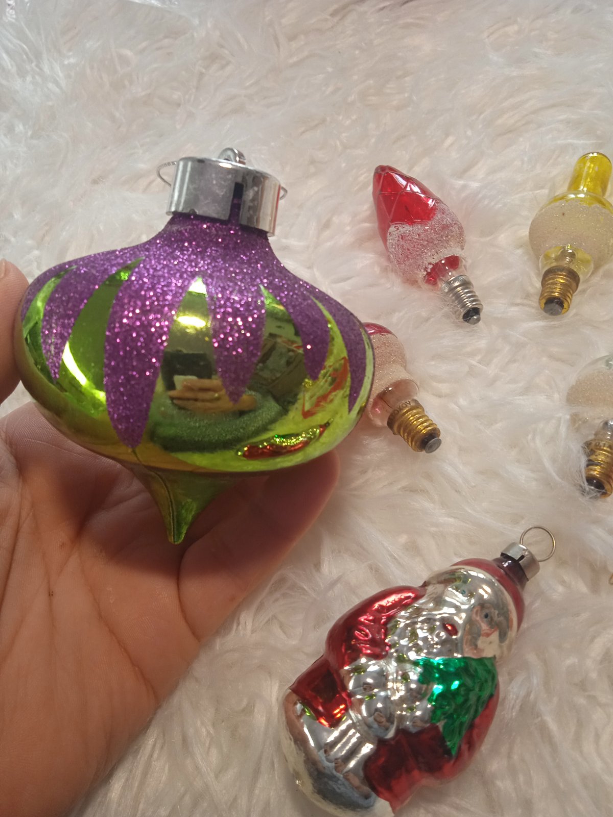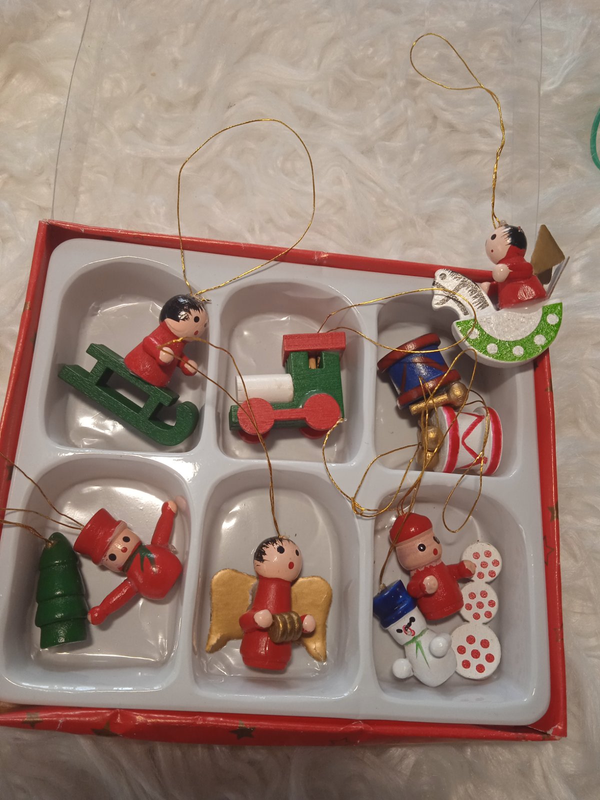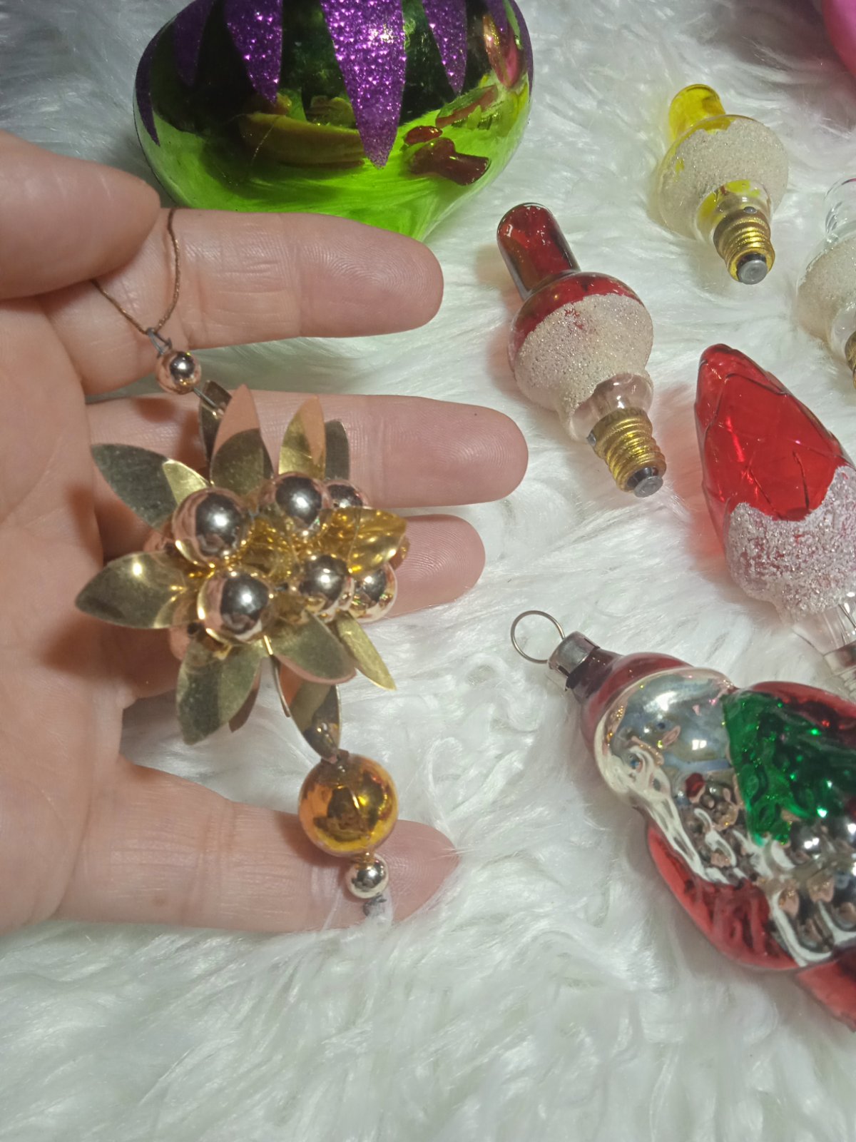 🎄🎄🎄..... žiarovky kus 2e, šiška žiarovka je nová 3e. Mikuláš 3e, guľka fialová 1e, drevené ozdoby 6e, ružová stará guľka 3e, zlatá guľka hviezdička 3e