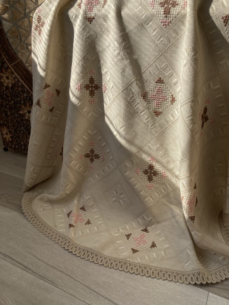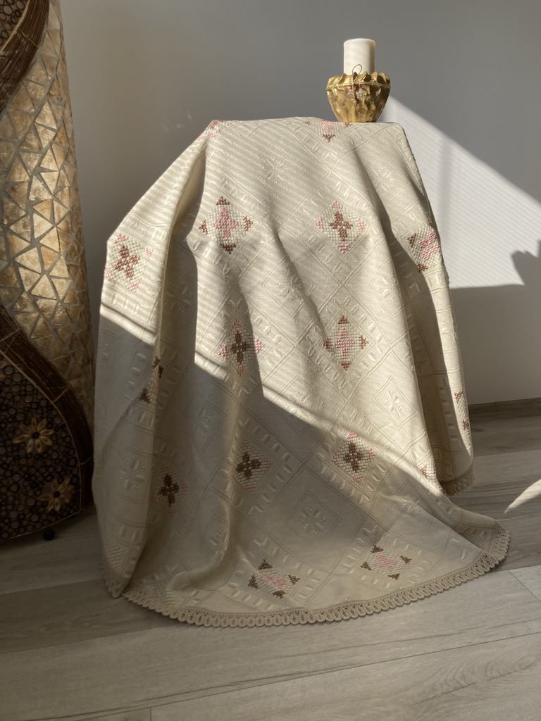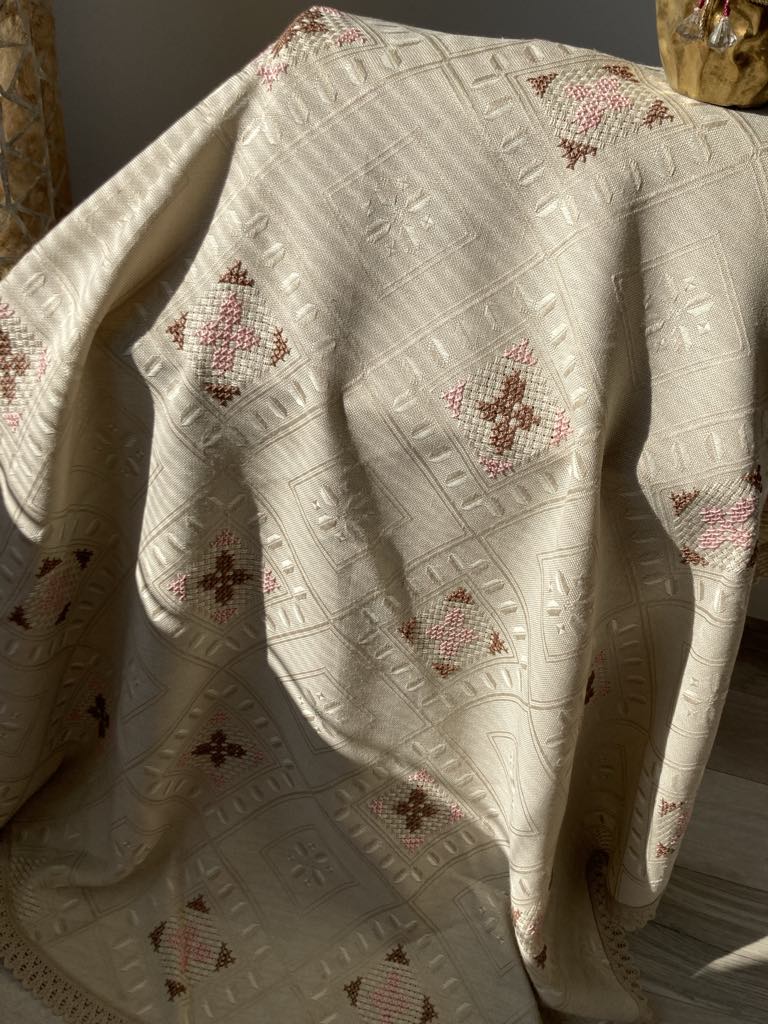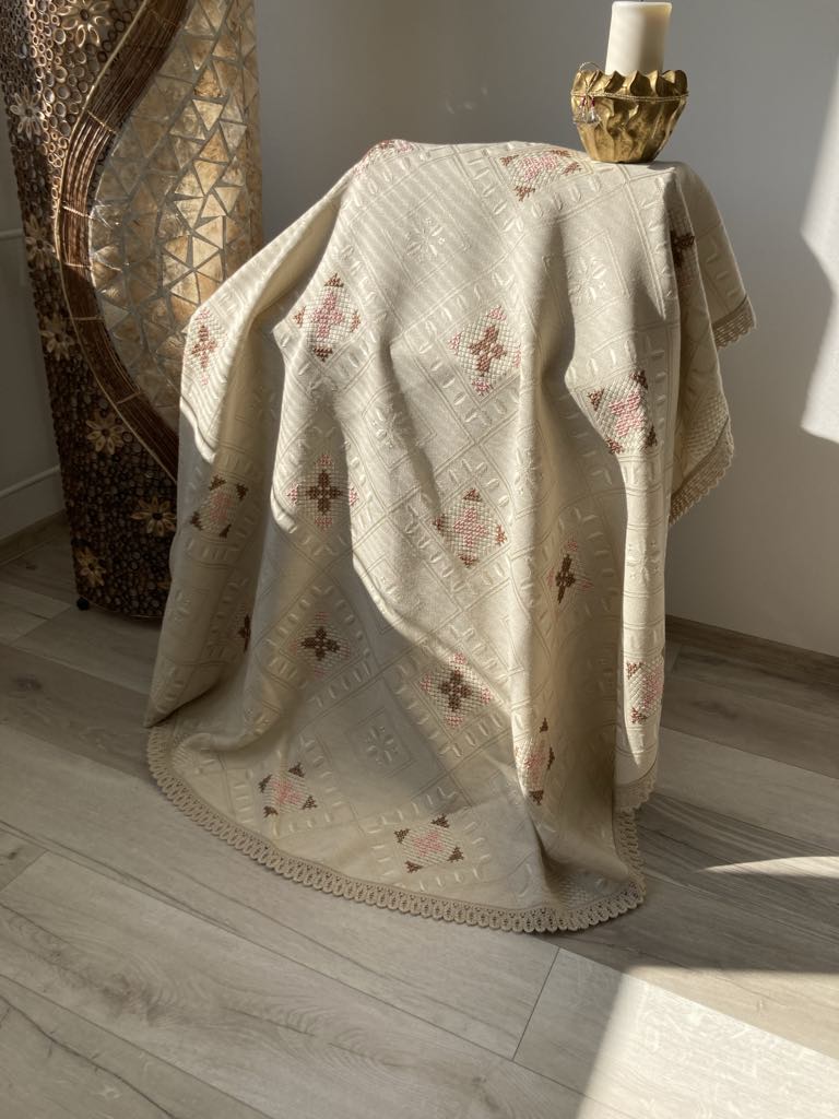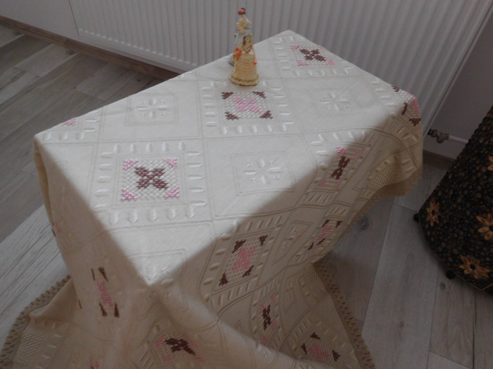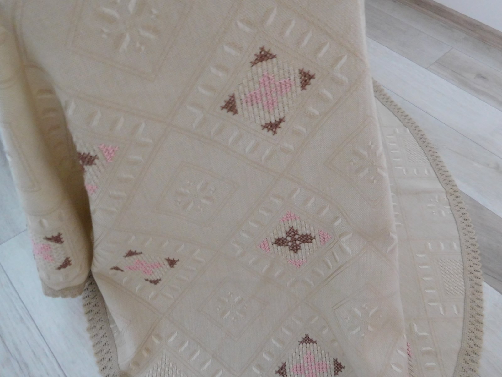 Ponúkam na predaj obrus hutnejšieho materiálu,okolie je obšité vlnenou krajkou-priemer kruh-175 cm, obrus je nepoškodený,čistý,mekký,voňavý,použiť sa dá aj na okrúhly aj na štvorcový stol, je to na Vás.