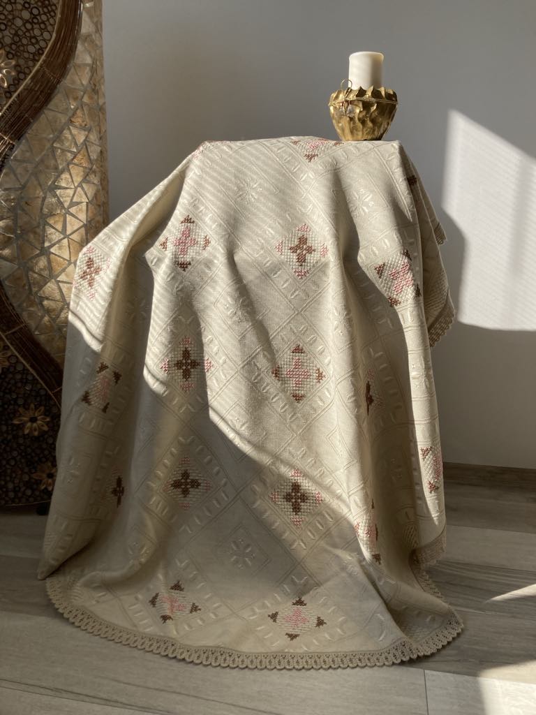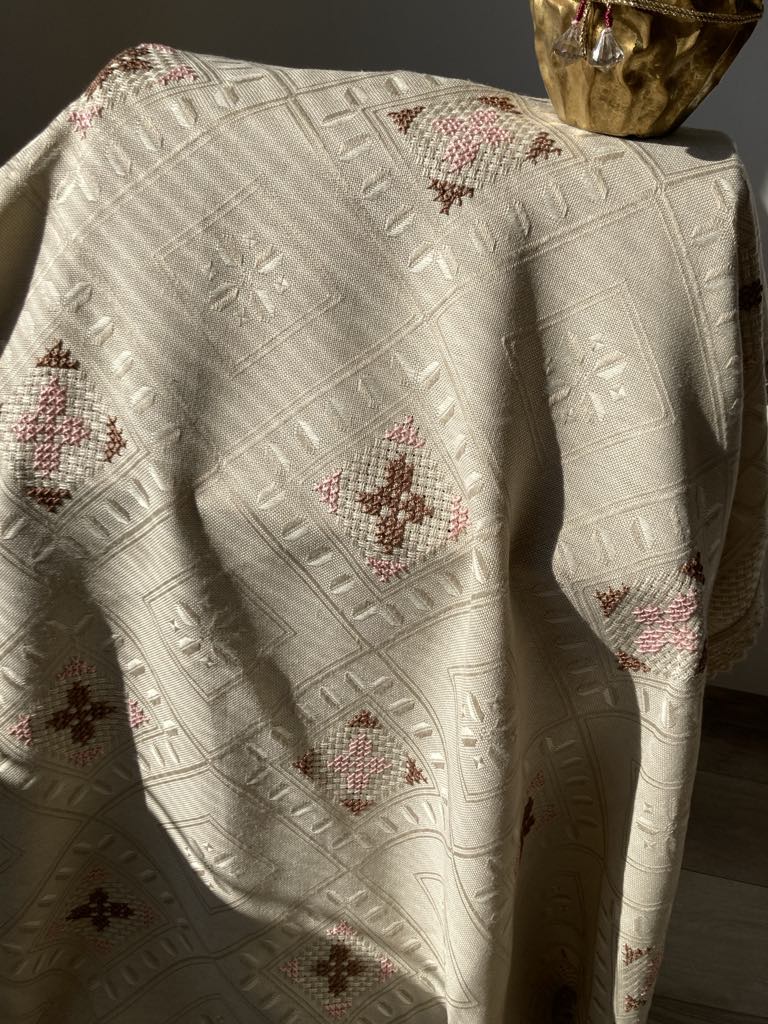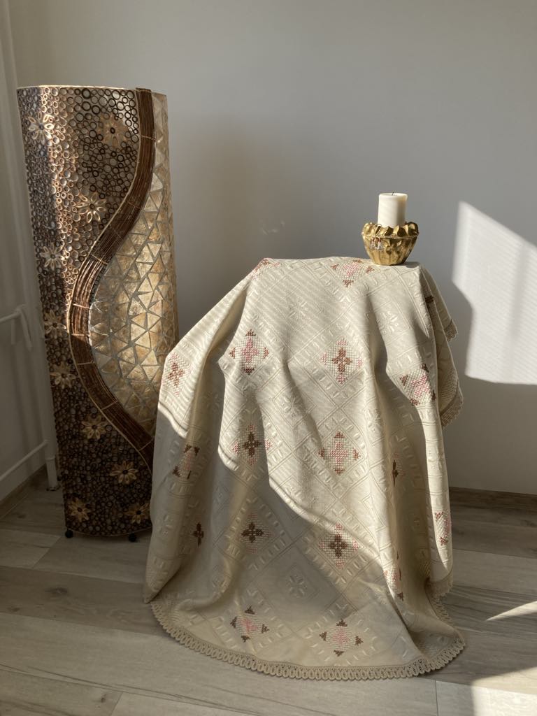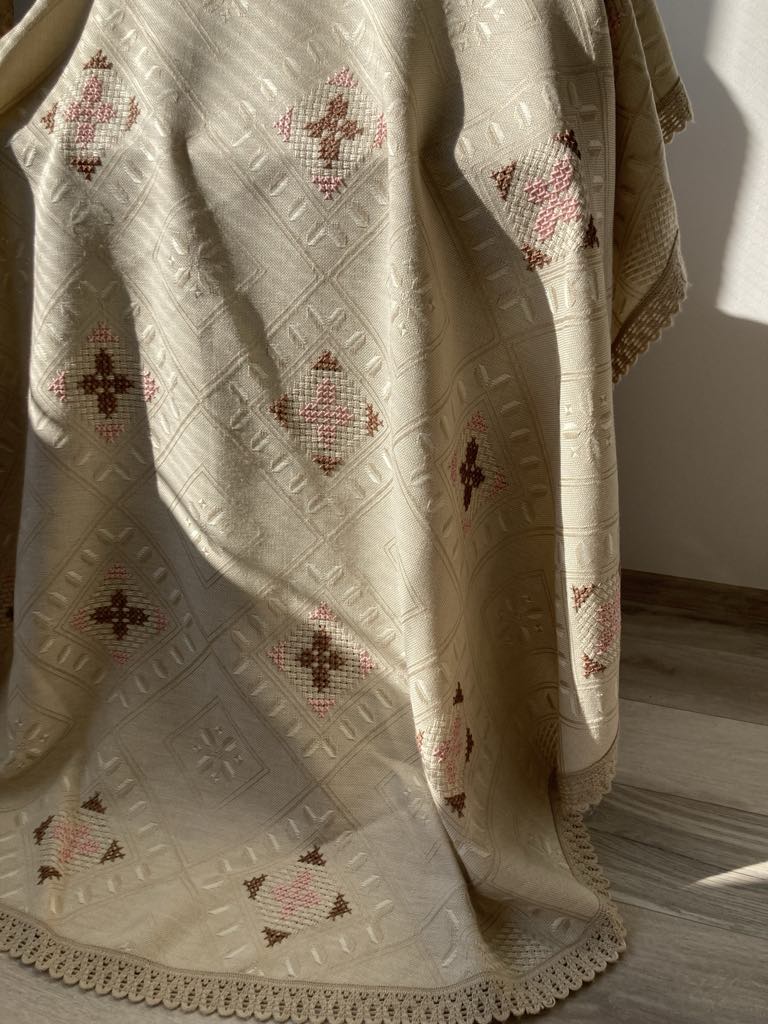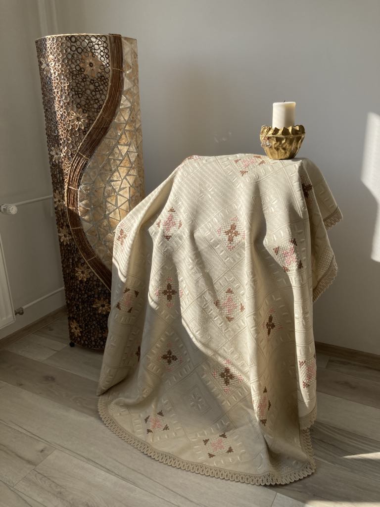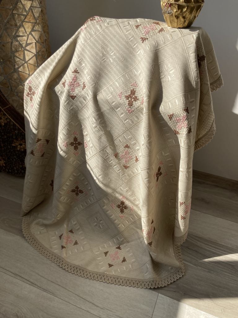 Ponúkam na predaj obrus hutnejšieho materiálu,okolie je obšité vlnenou krajkou-priemer kruh-175 cm, obrus je nepoškodený,čistý,mekký,voňavý,použiť sa dá aj na okrúhly aj na štvorcový stol, je to na Vás.