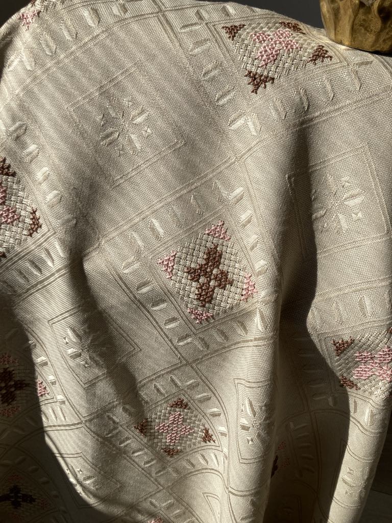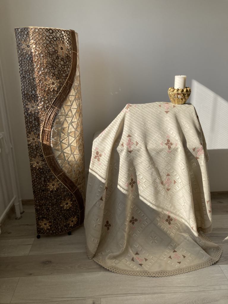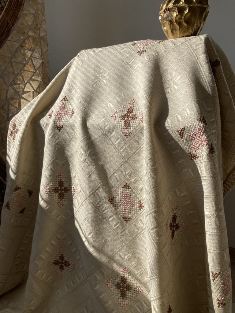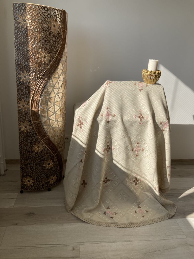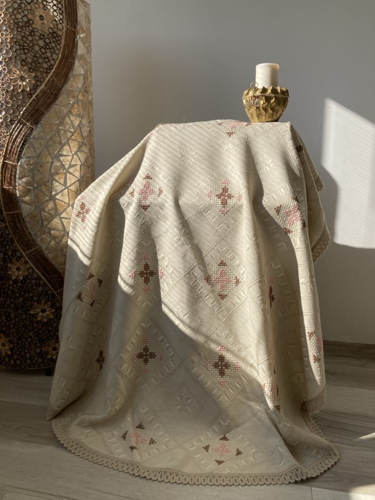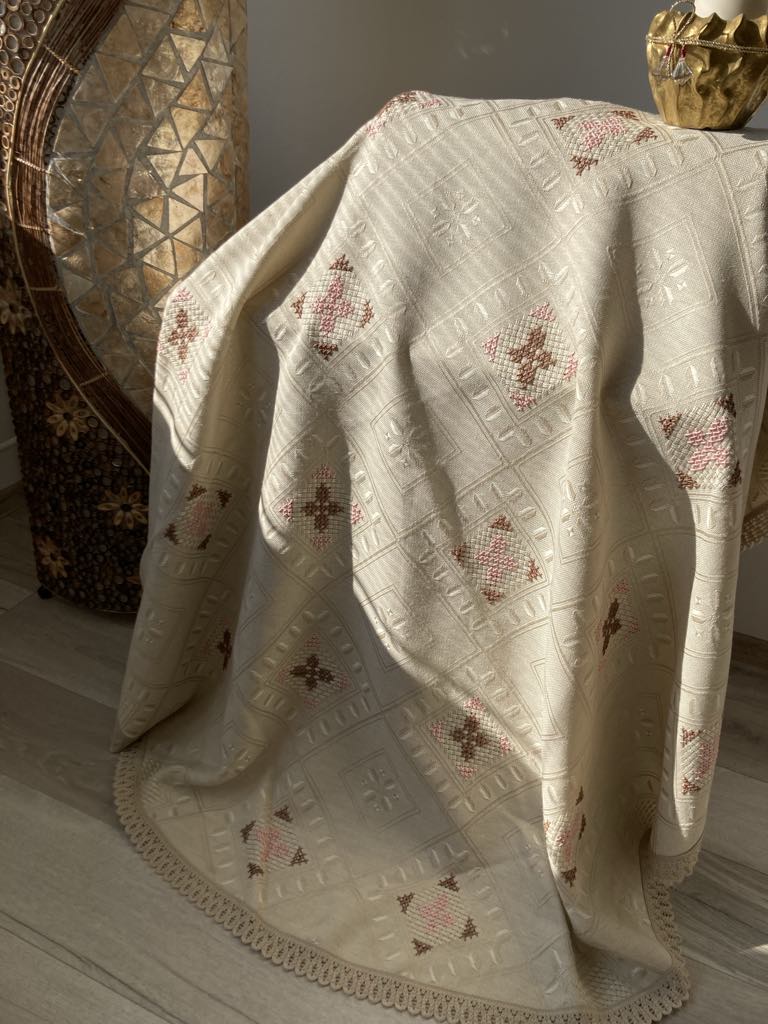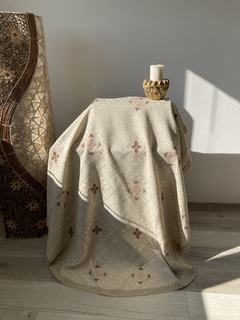Ponúkam na predaj obrus hutnejšieho materiálu,okolie je obšité vlnenou krajkou-priemer kruh-175 cm, obrus je nepoškodený,čistý,mekký,voňavý,použiť sa dá aj na okrúhly aj na štvorcový stol, je to na Vás.