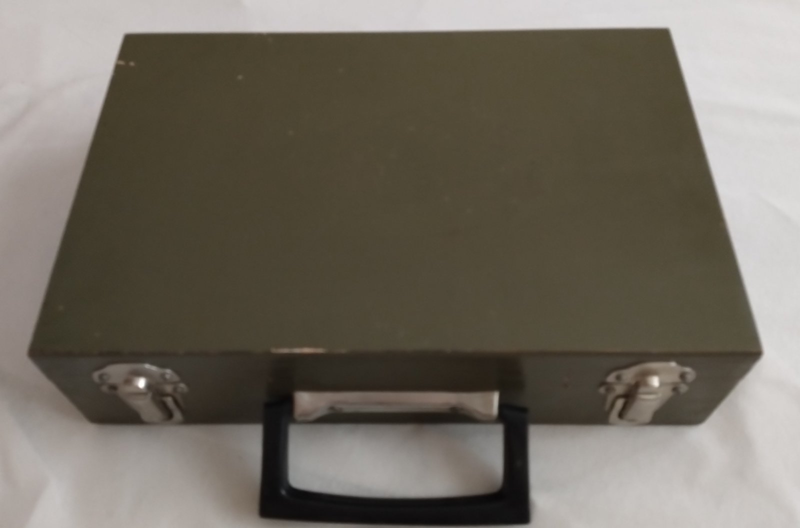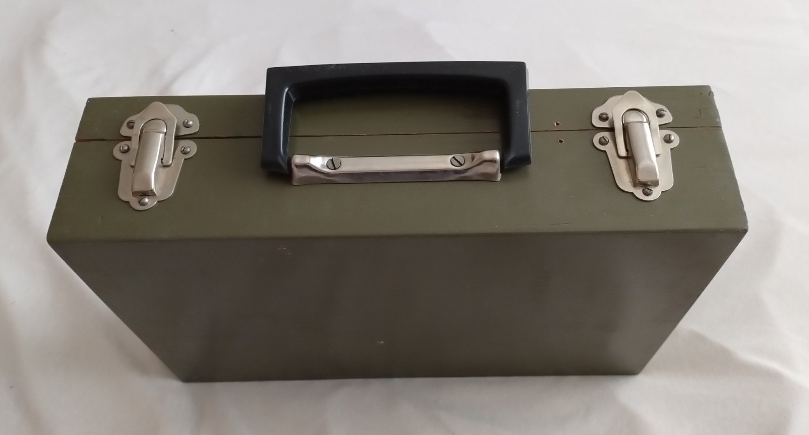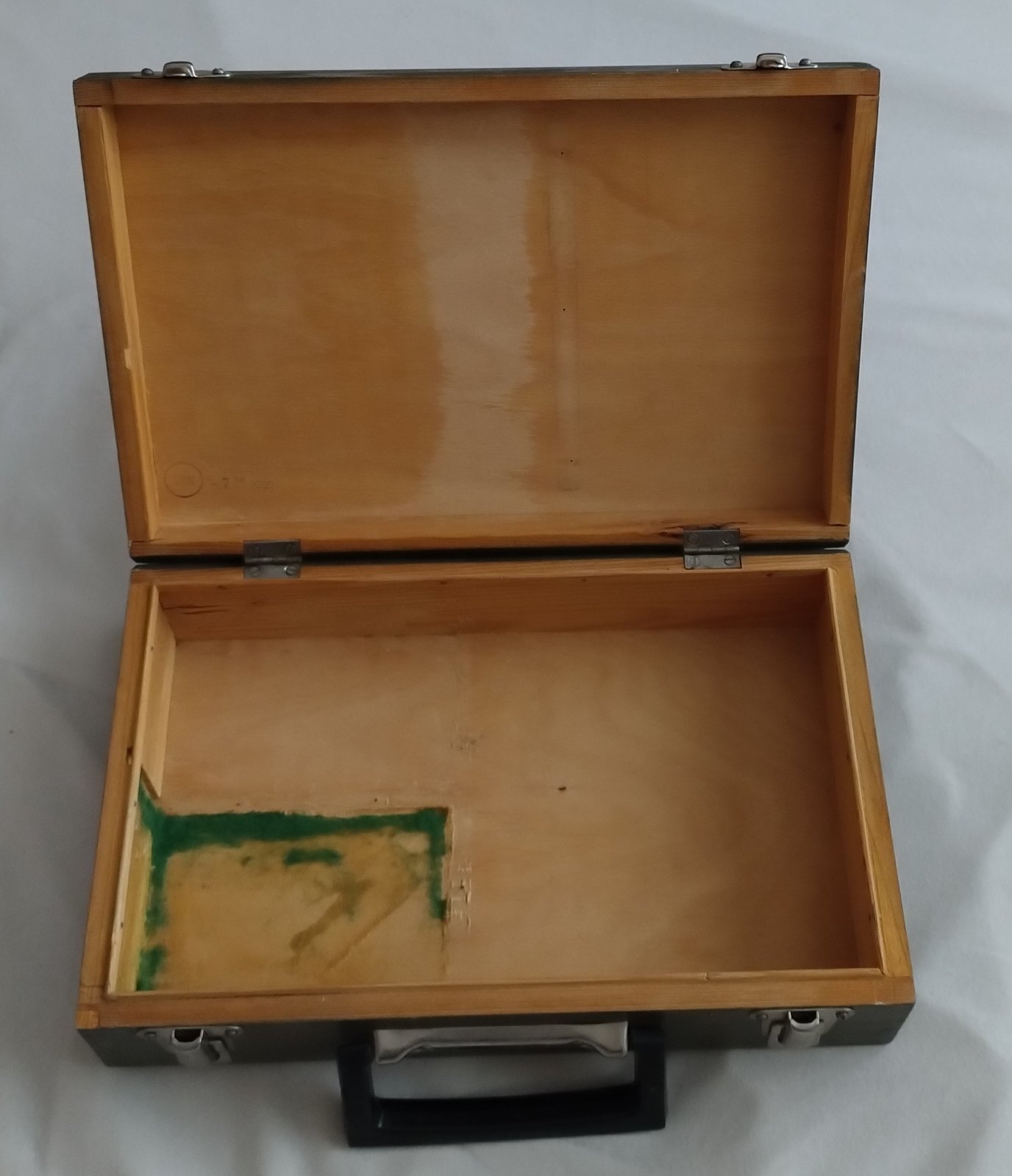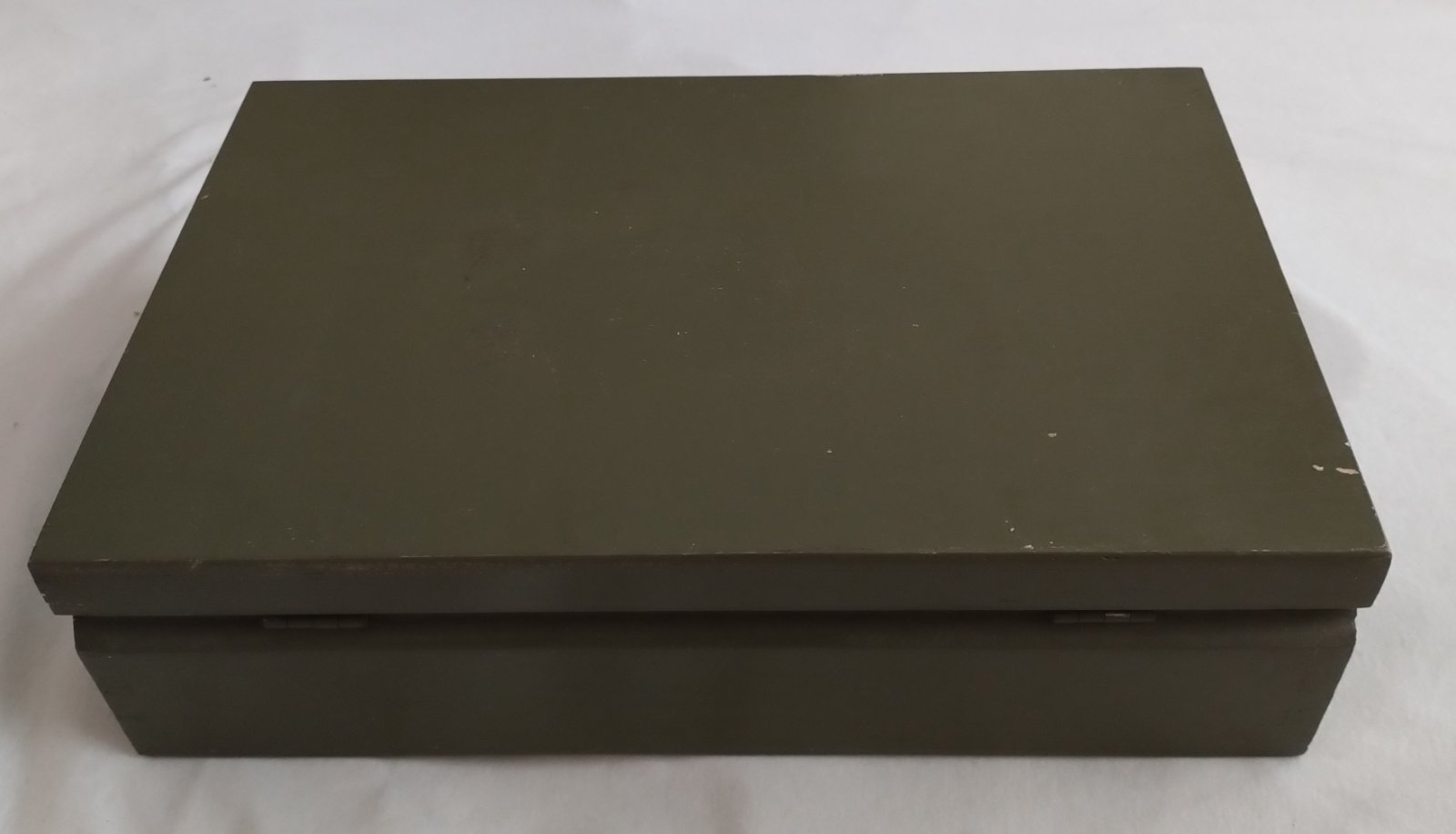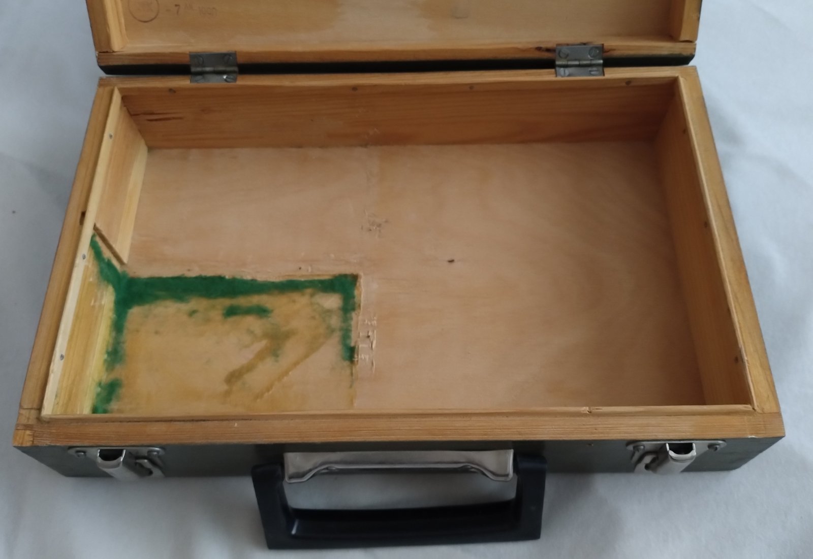 Predám drevený retro kufrik s plastovou rukoväťou, dvomi kovovými zámkami a pántami v zelenej vojenskej farbe. Vonkajšie rozmery: 32 cm x 21 cm x 9 cm. Z vnútornej strany vrchnej časti je odtlačok pečiatky a dátum z roku 1990.