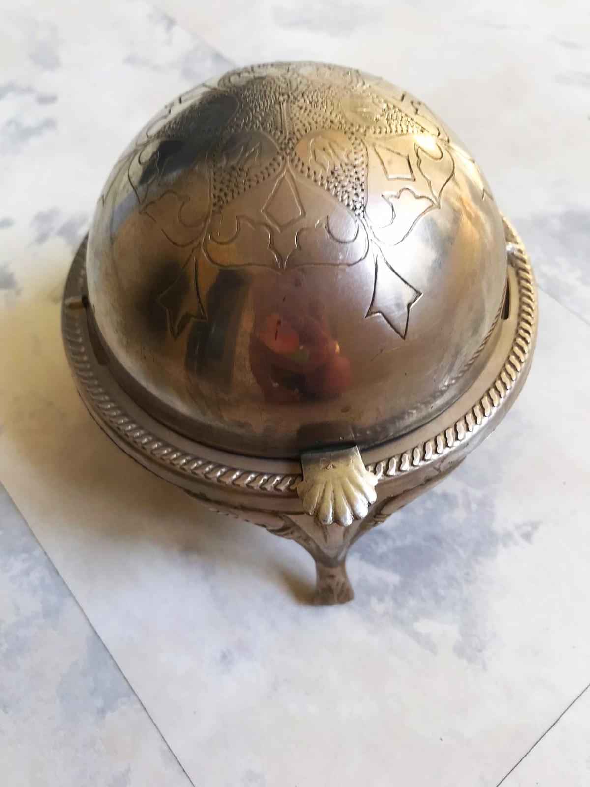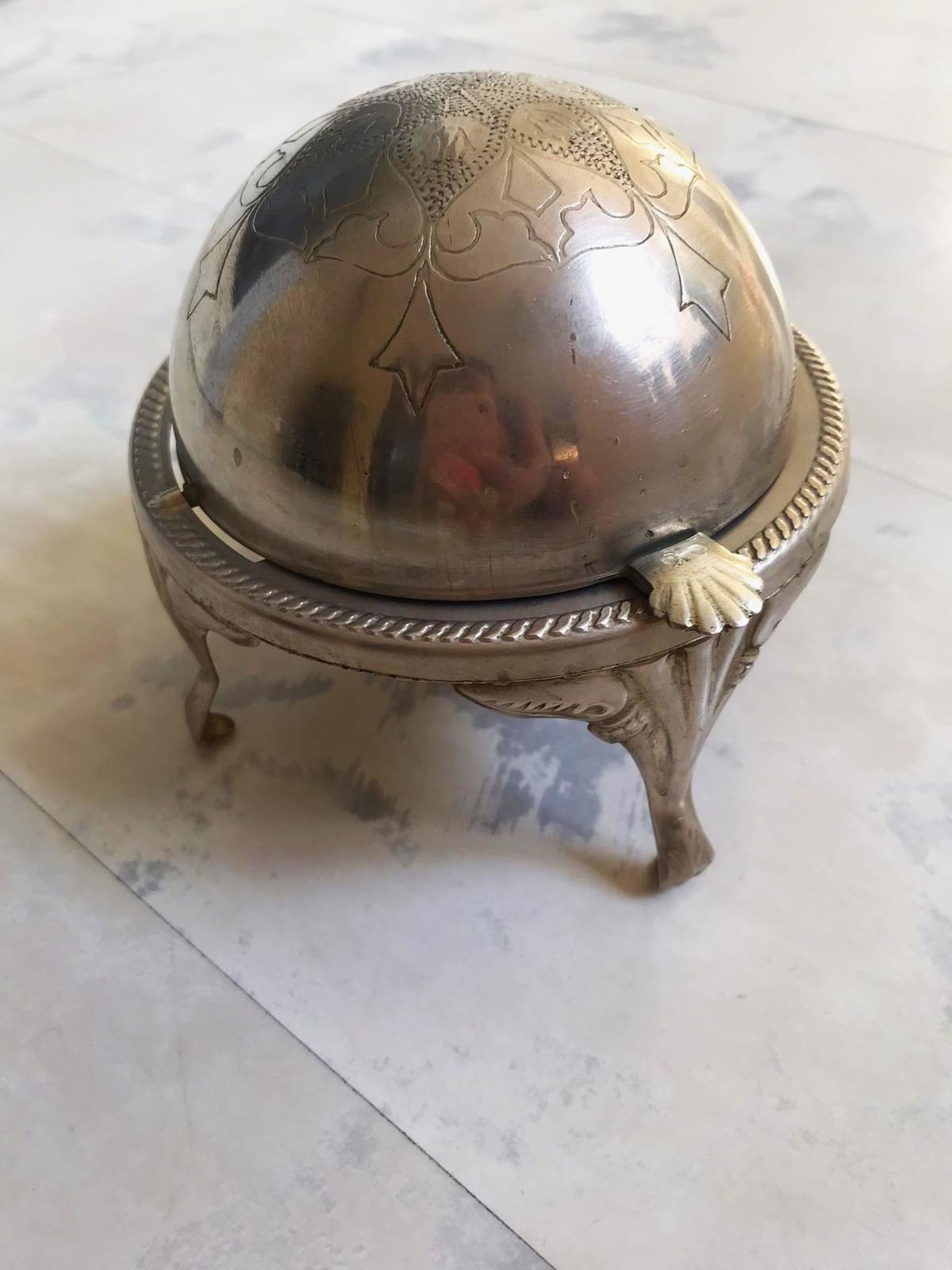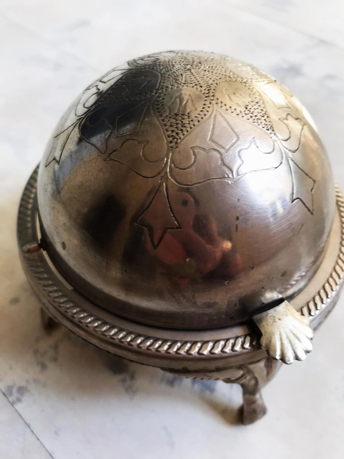 stará starožitná kazetka/bonboniéra na nožičkách,je to pravdepodobne alpaka, guľa sa otvára vyklopením,priemer gule 12 cm, celková výška= 13 cm