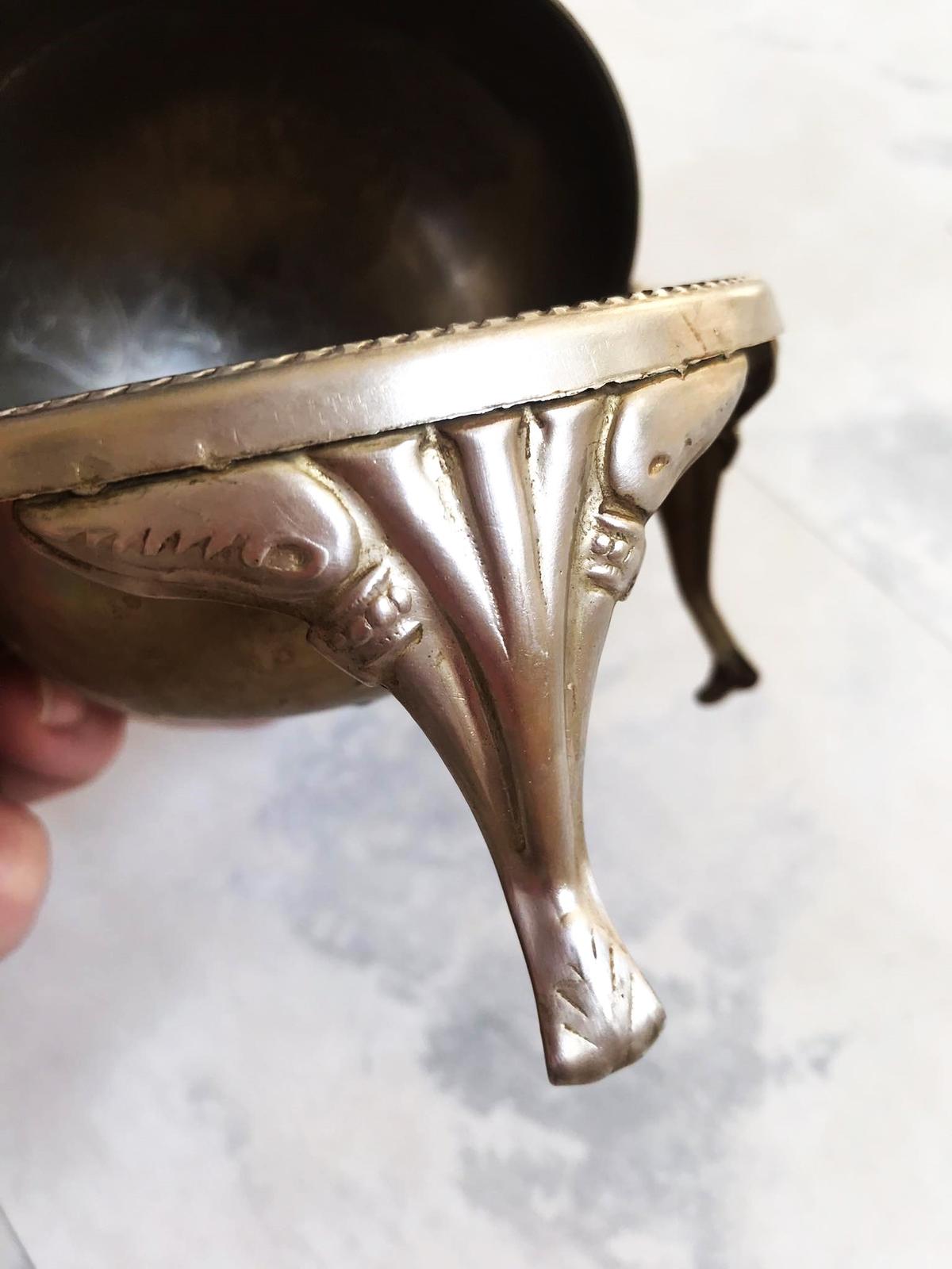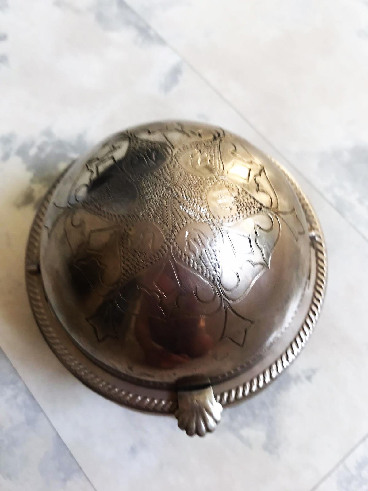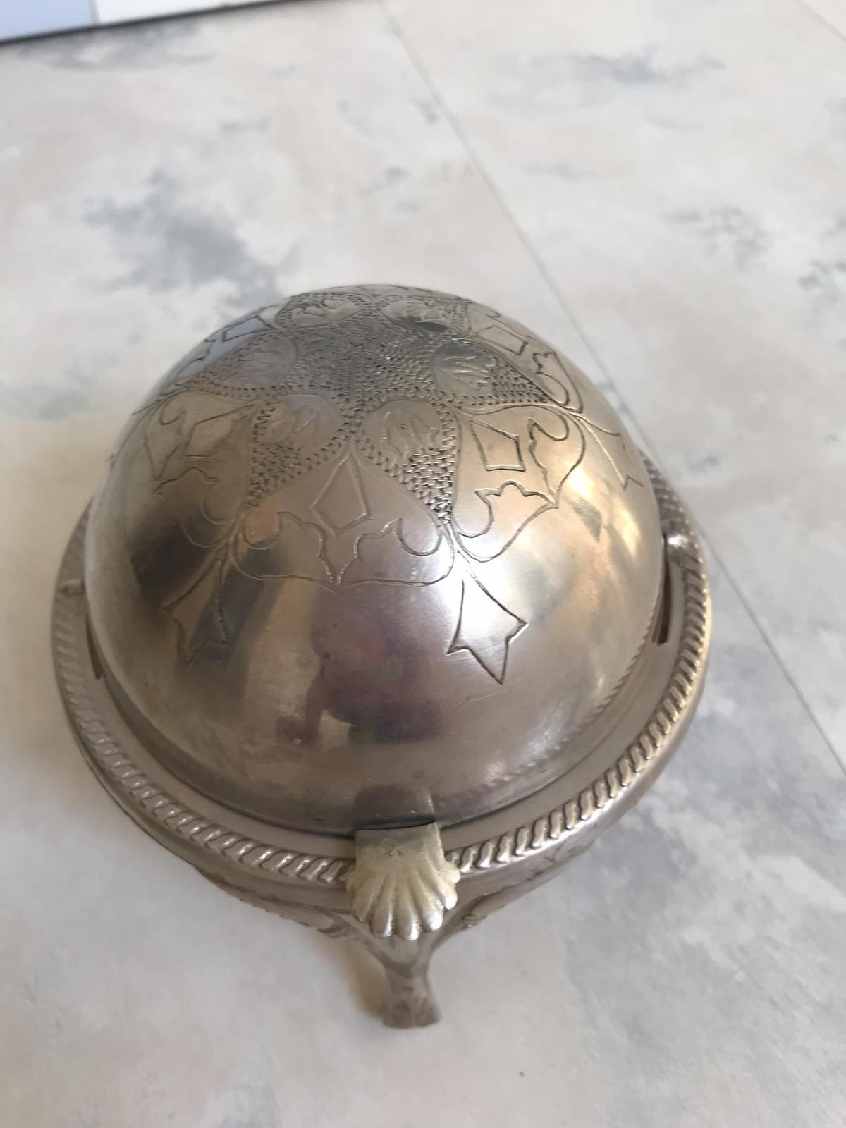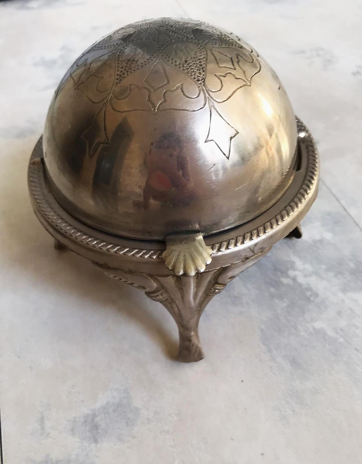 stará starožitná kazetka/bonboniéra na nožičkách,je to pravdepodobne alpaka, guľa sa otvára vyklopením,priemer gule 12 cm, celková výška= 13 cm