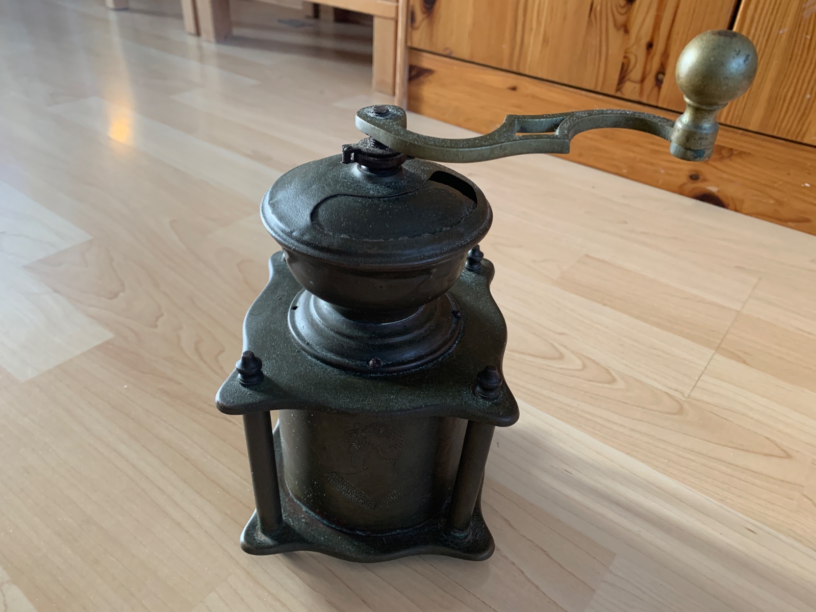 Starozitny mlyncek, asi mosadz, neviem to rozpoznat.