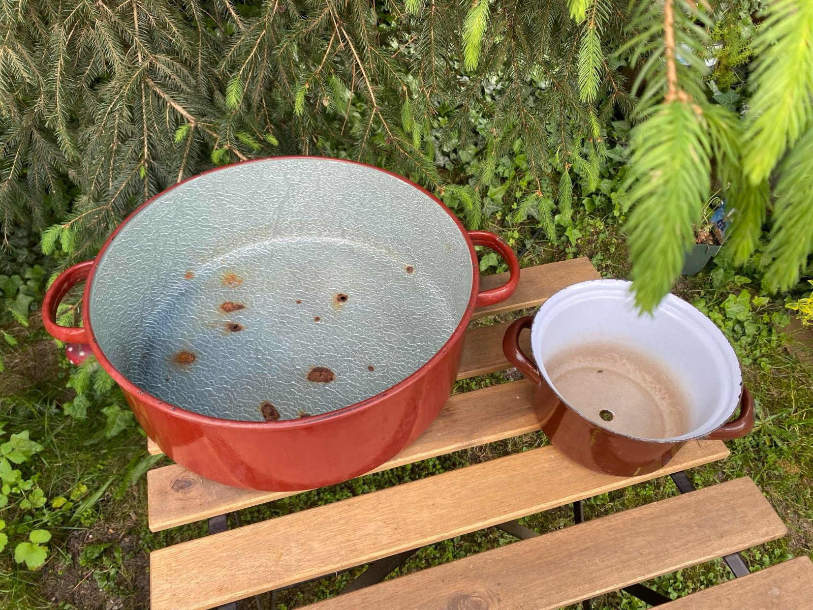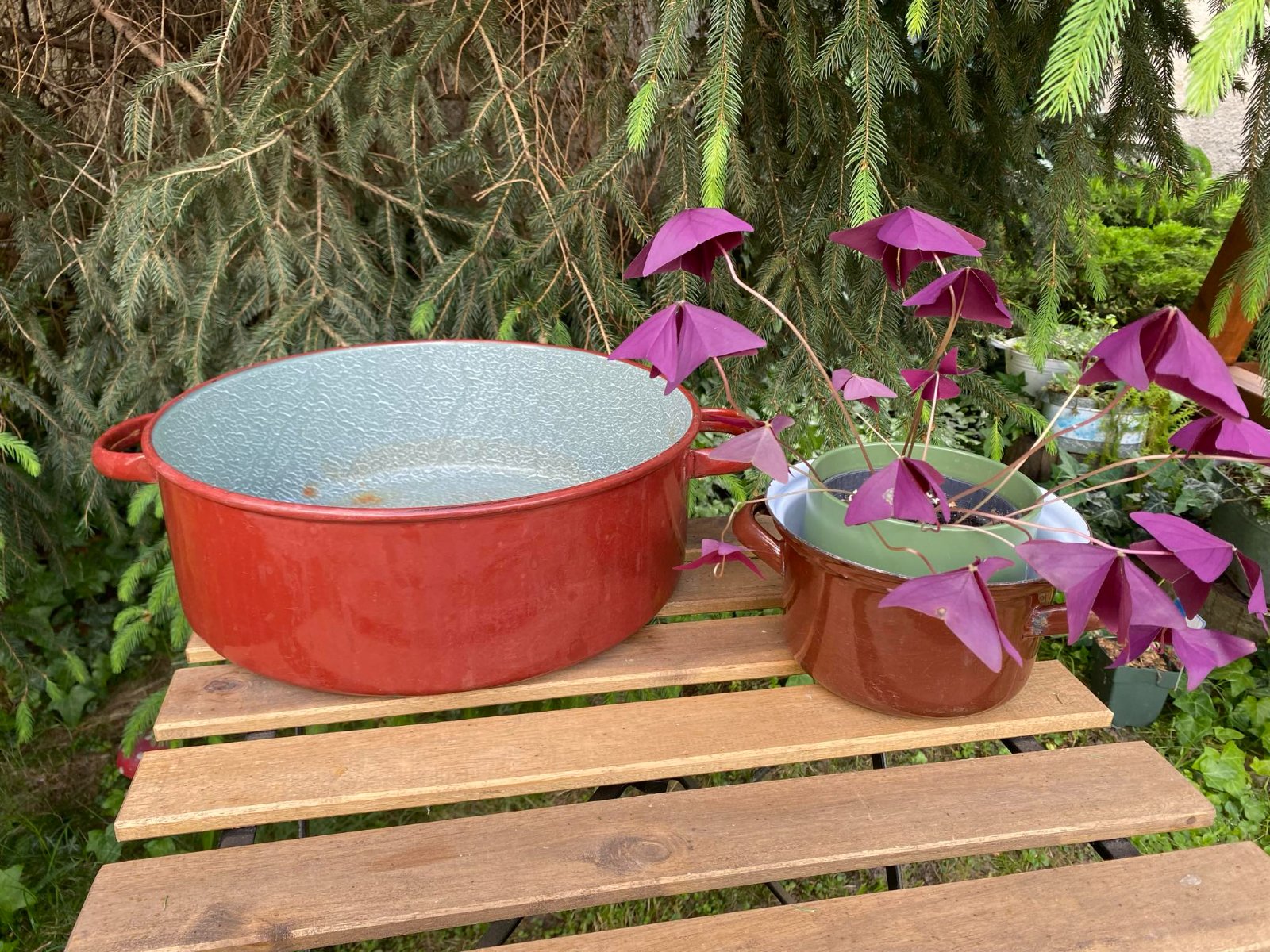 Predám staré smaltované hrnce v strede s dierkami 2 ks ( sada ).