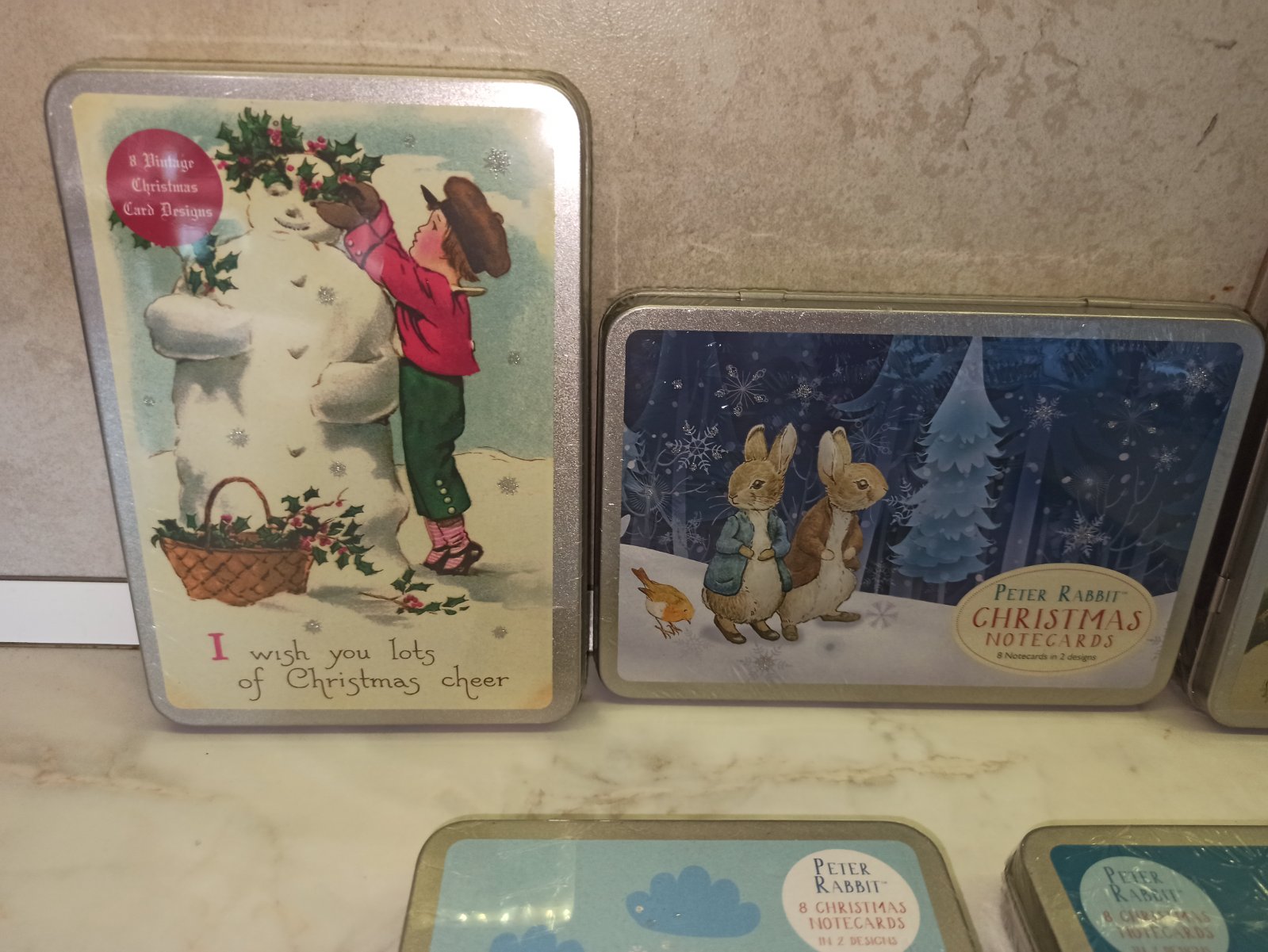 Sady vianocnych pohladnic zbalene spolu v trvanlivej retro plechovici.