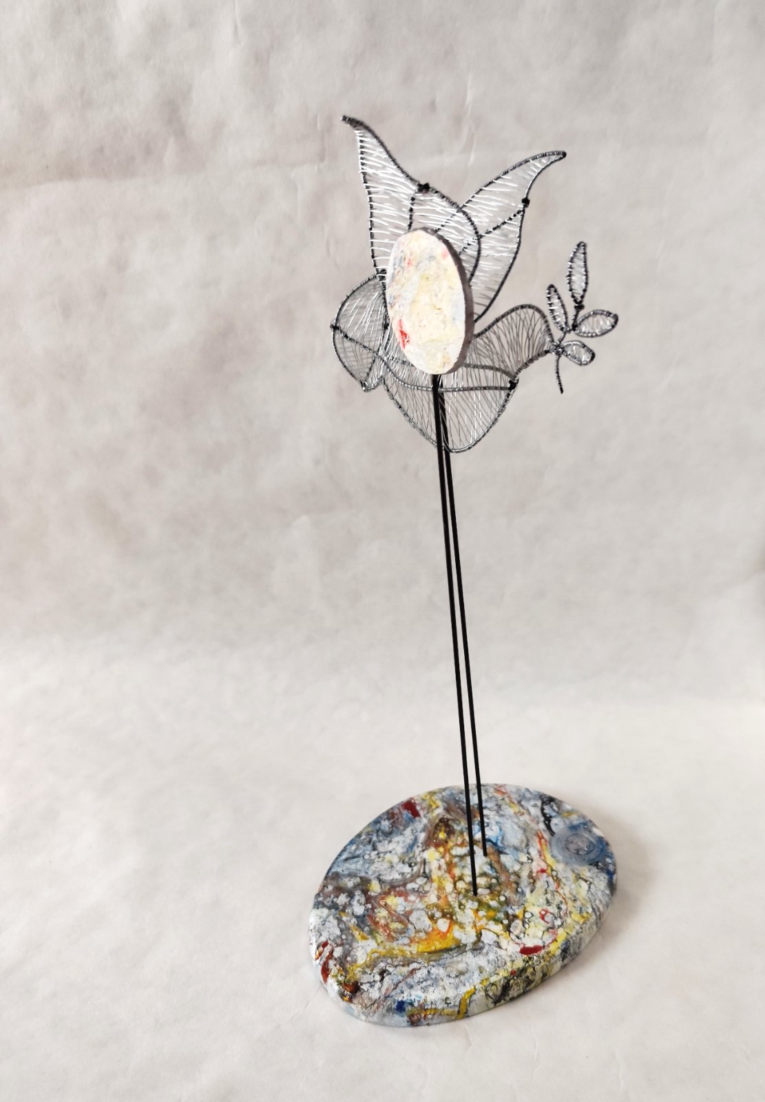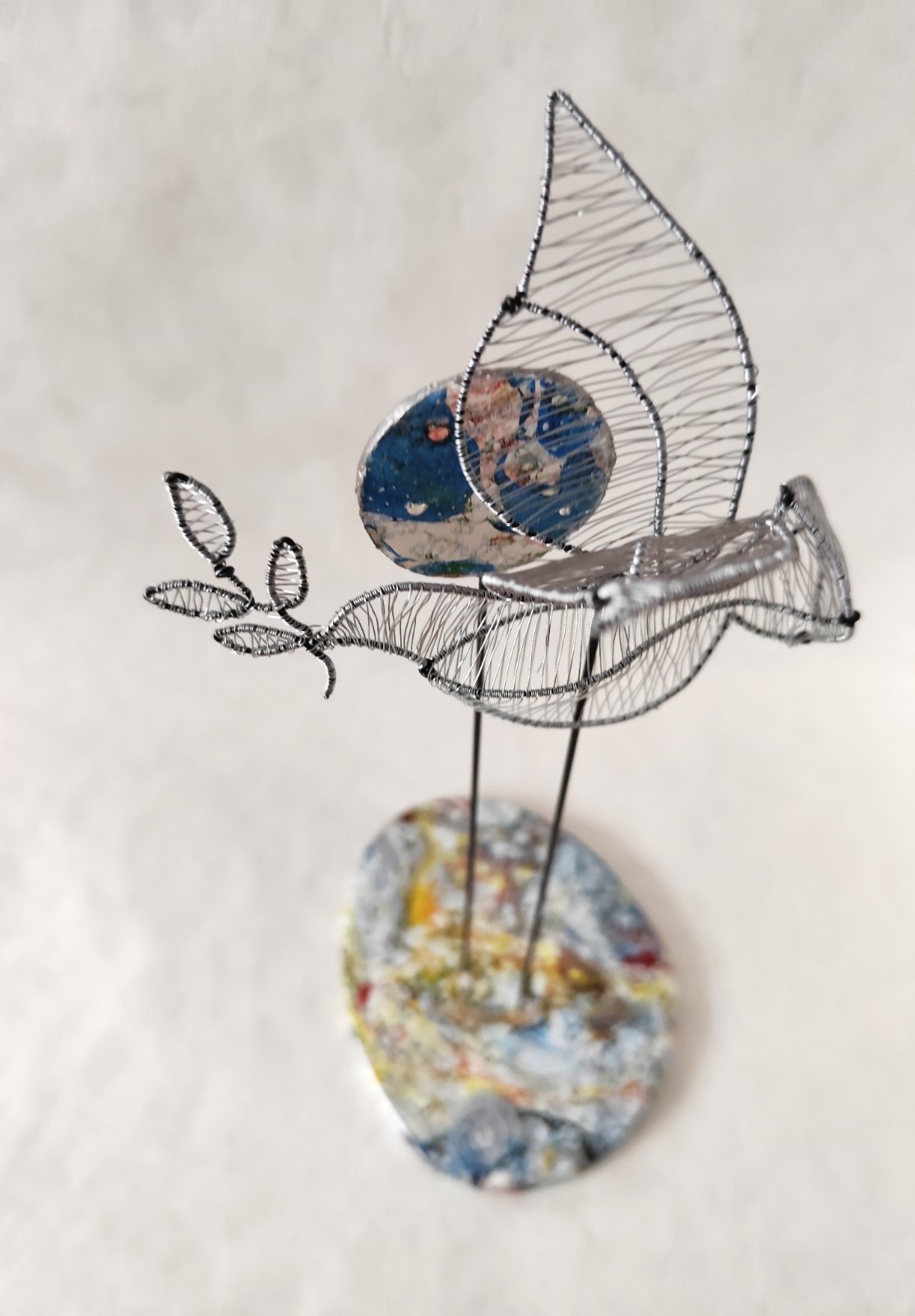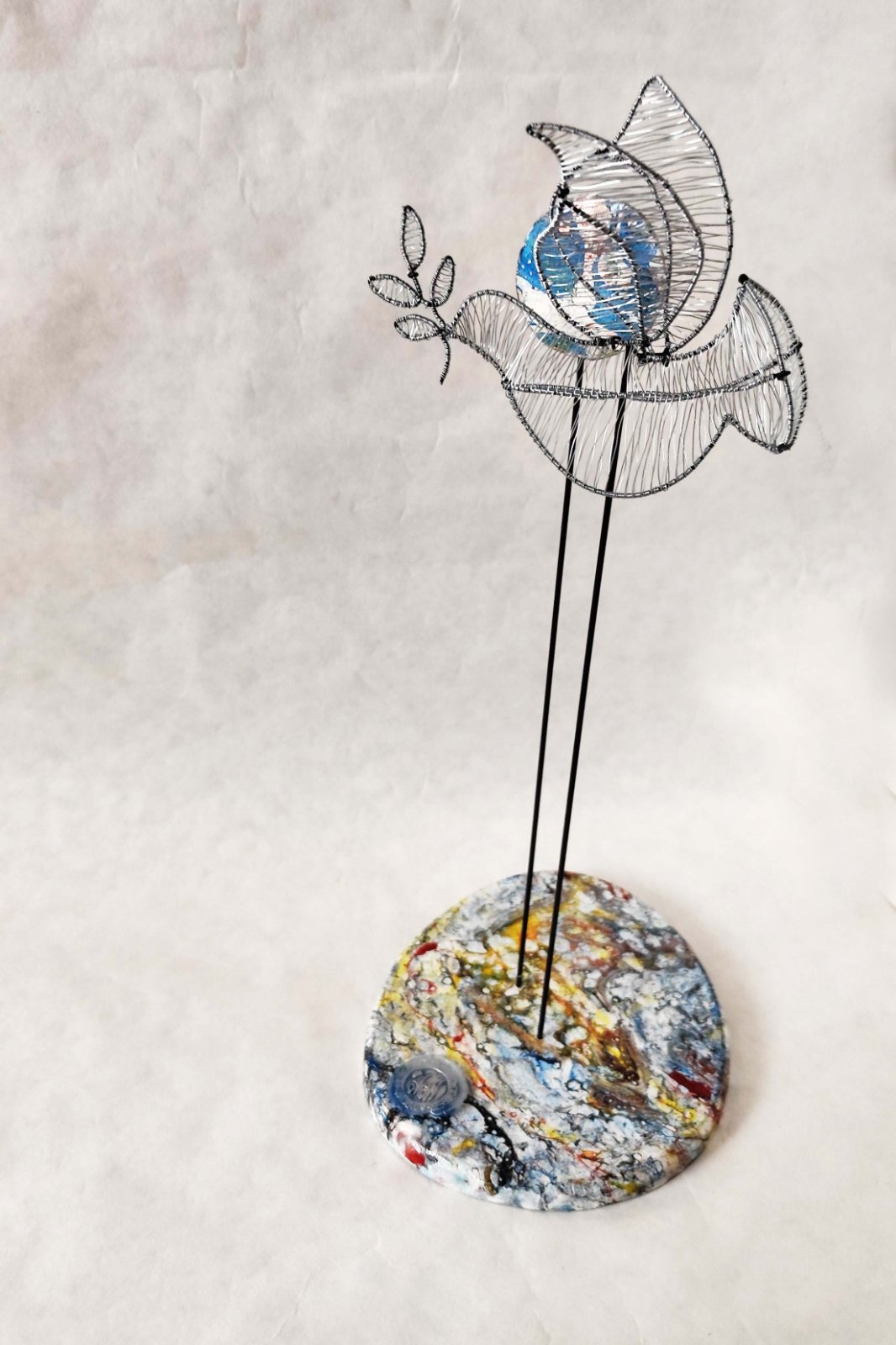 Drôtená holubica, vystavovaná, signovaná. rok 2025. Podstavec je z mangového dreva zdobený autorsky upravenou technikou ebru.