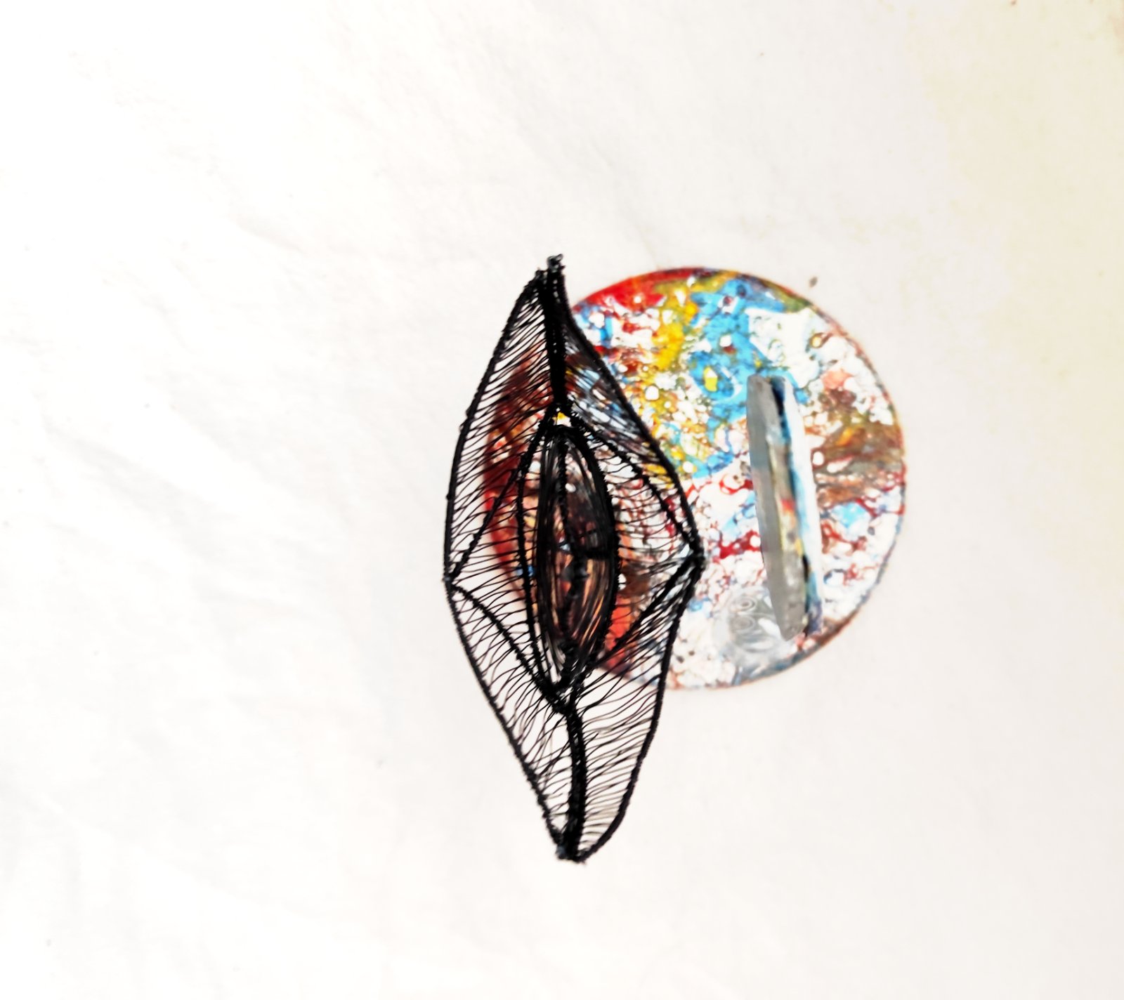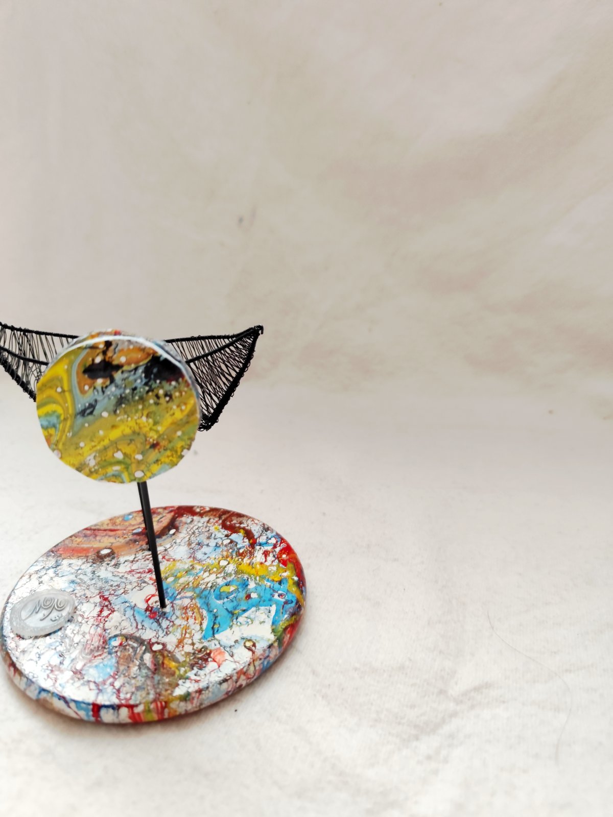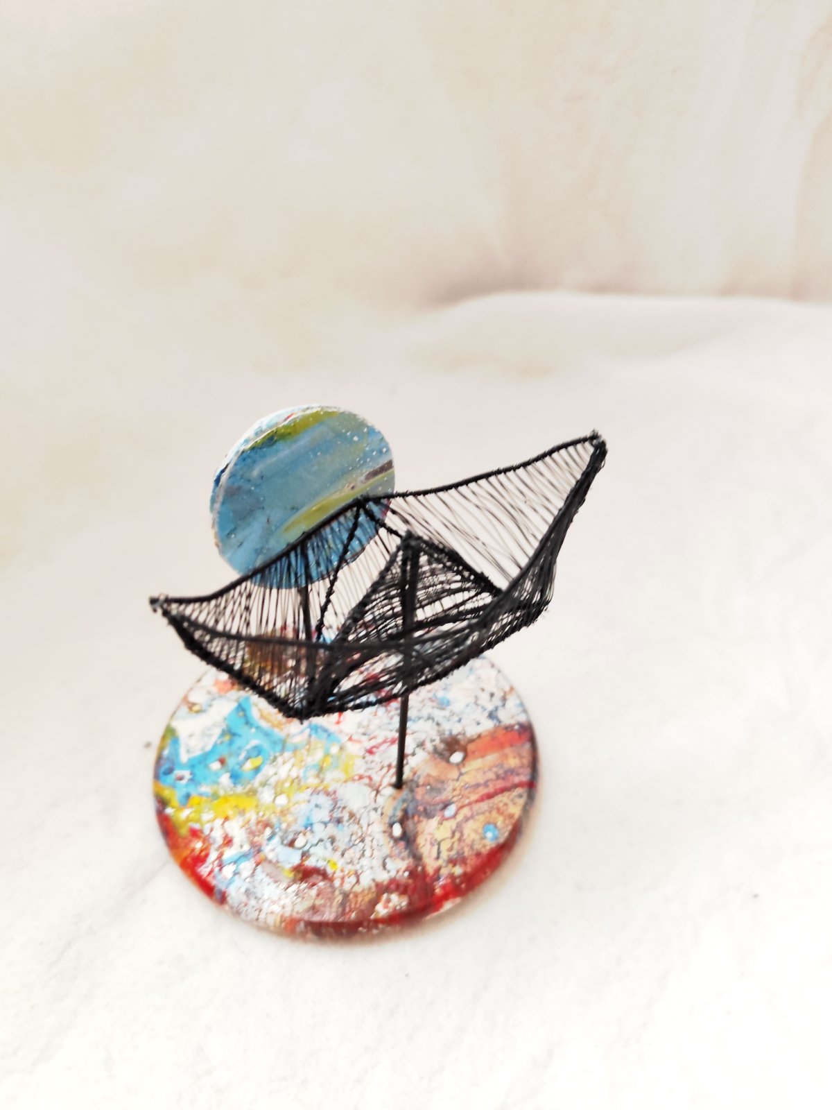 Čierna drôtená origami lodička, drevený podstavec maľovaný autorsky modifikovanou technikou ebru. V pozadí kruh z penovej dosky maľovaný technikou ebru. Dielo bolo vystavované a je signované.