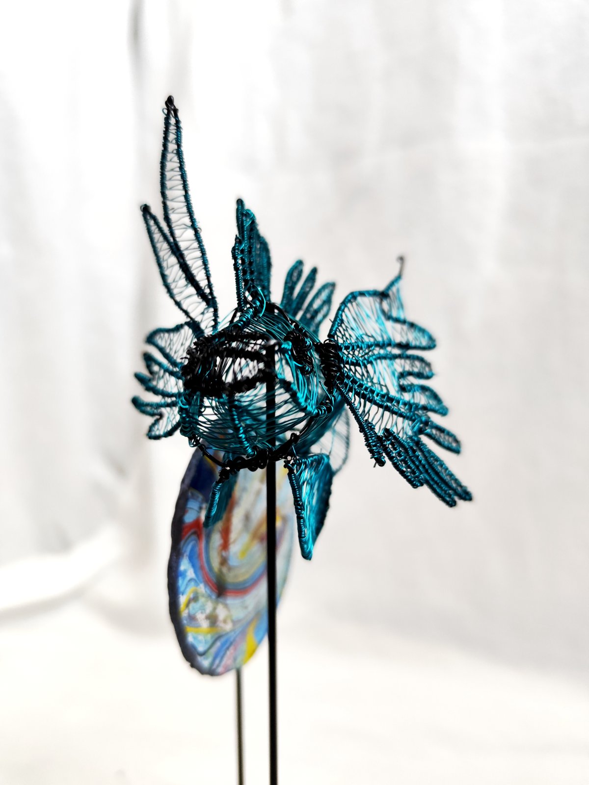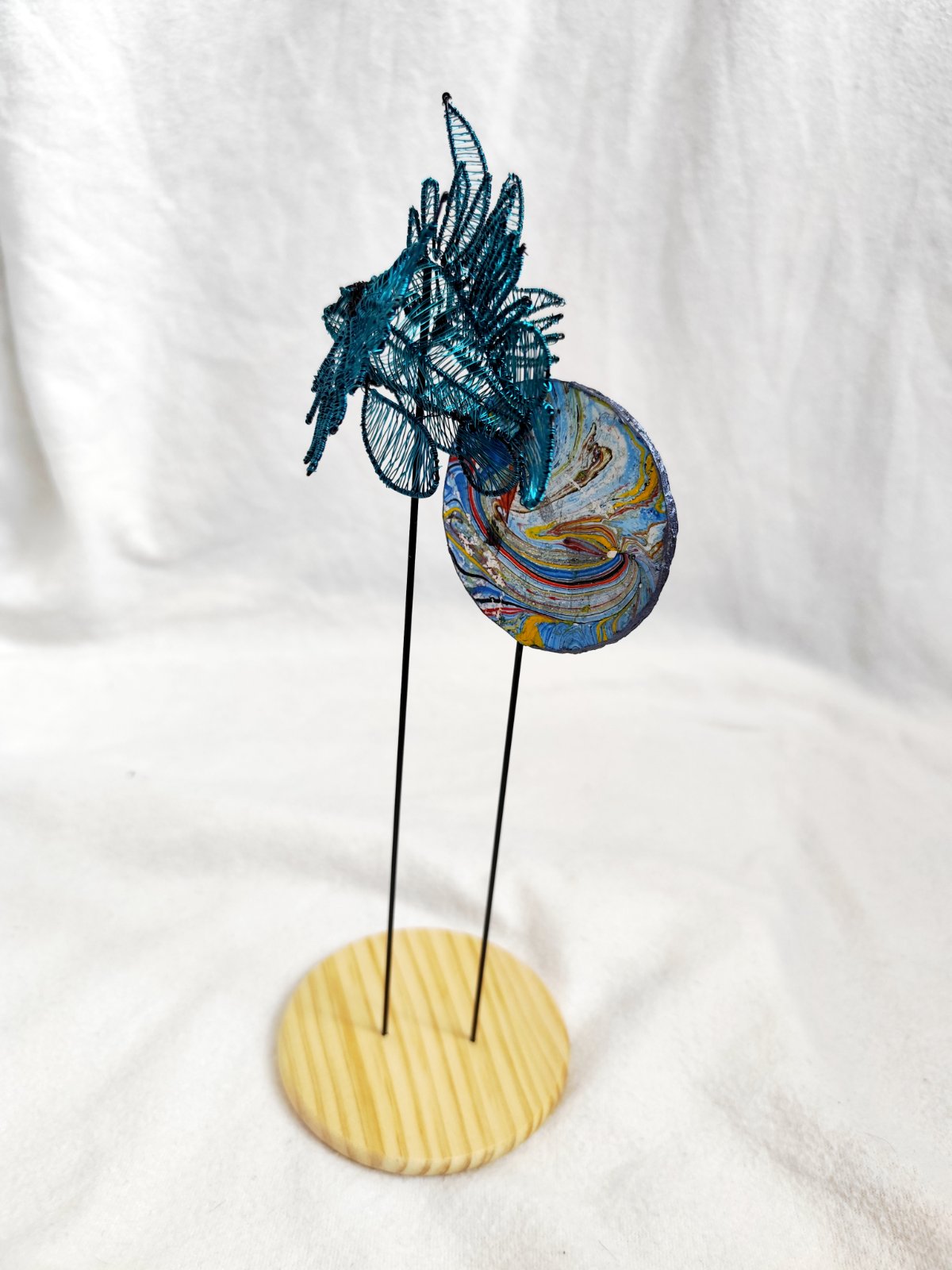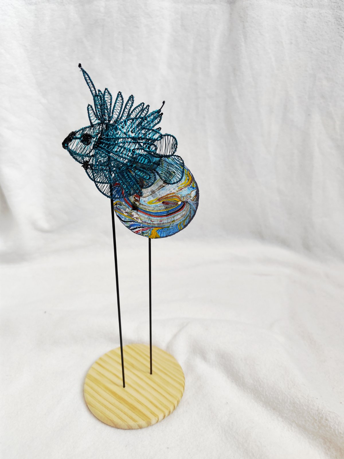 Rybička vypletená z drôtu, podstavec z dreva a v pozadí penová doska maľovaná technikou ebru. Dielo bolo vystavované a je signované.