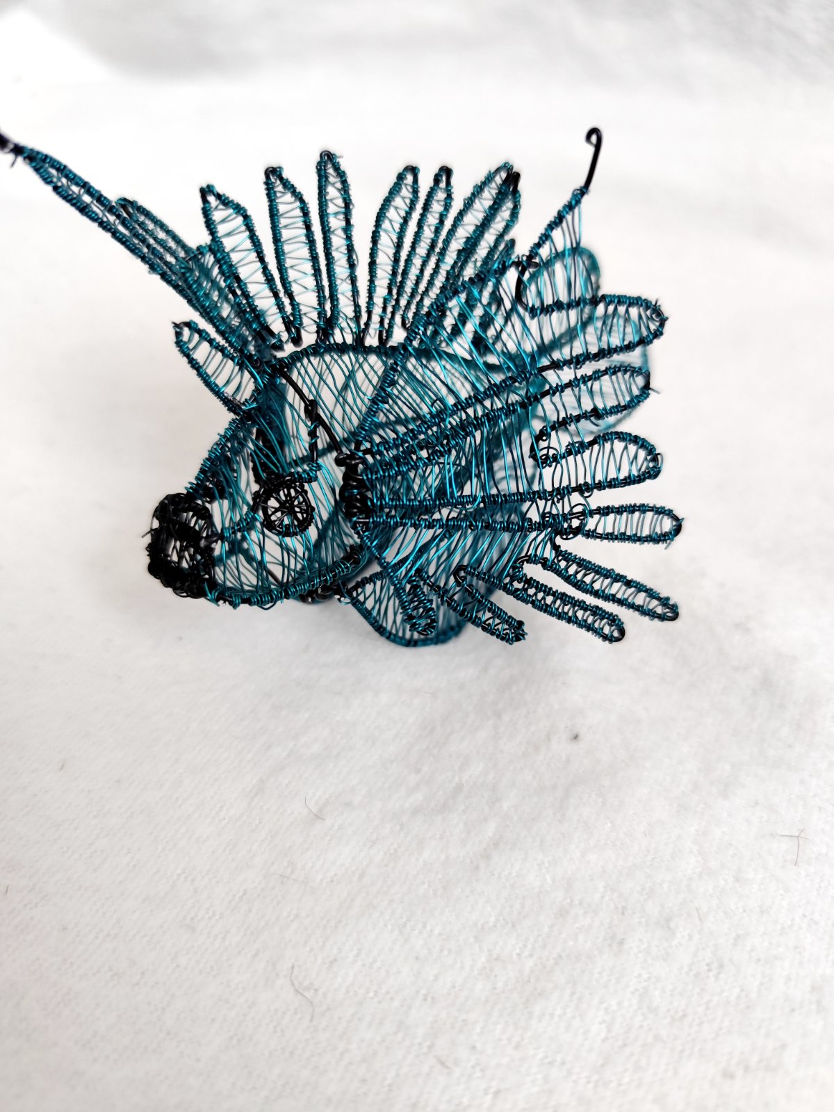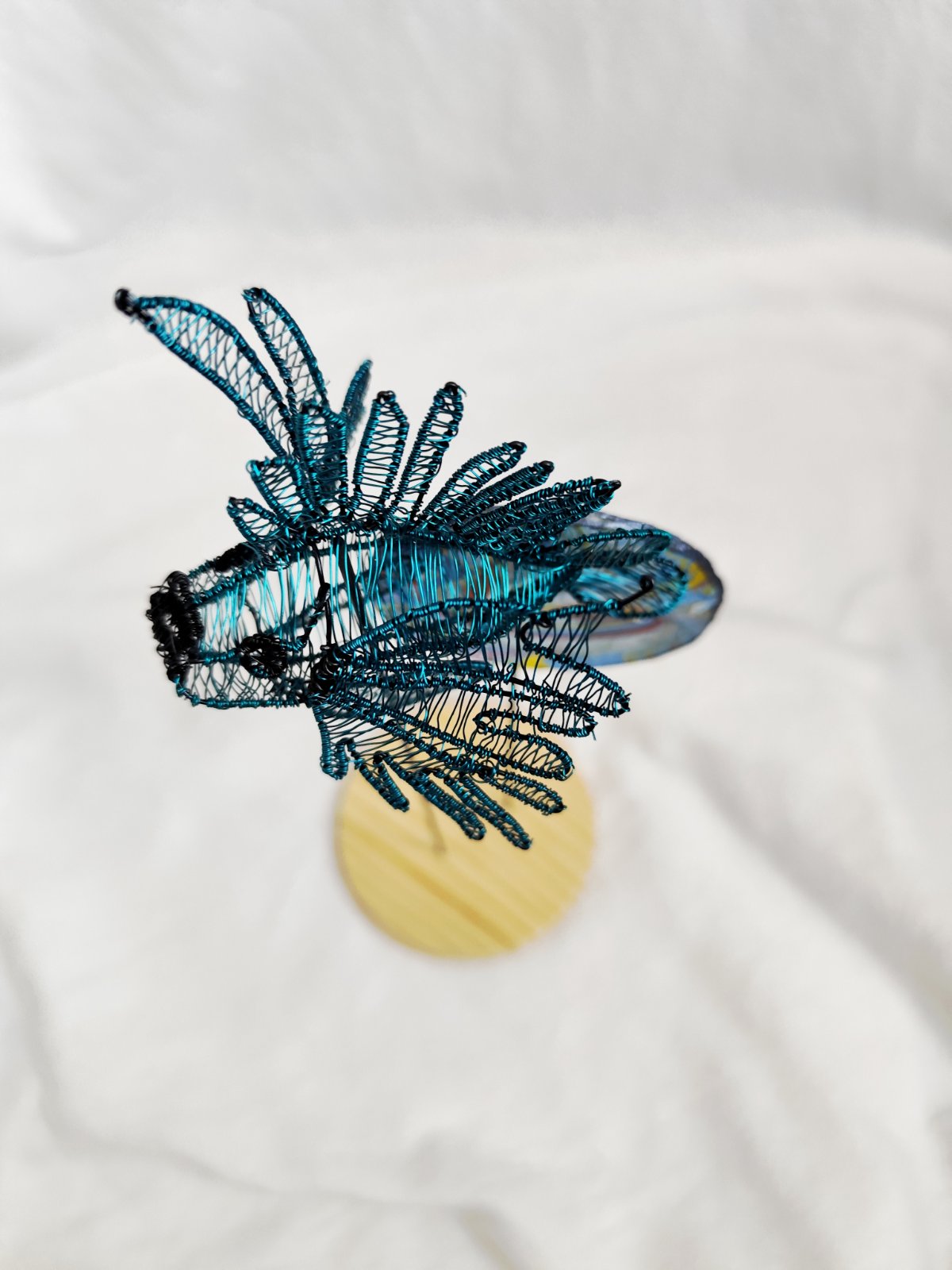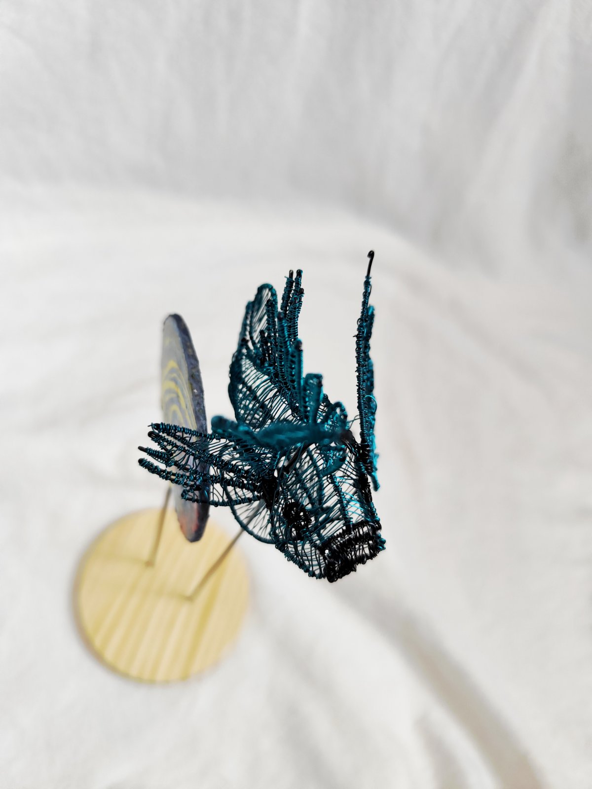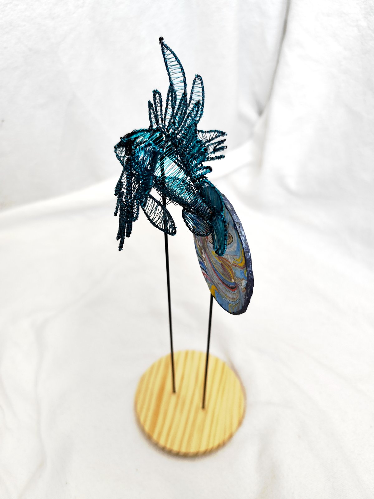 Rybička vypletená z drôtu, podstavec z dreva a v pozadí penová doska maľovaná technikou ebru. Dielo bolo vystavované a je signované.