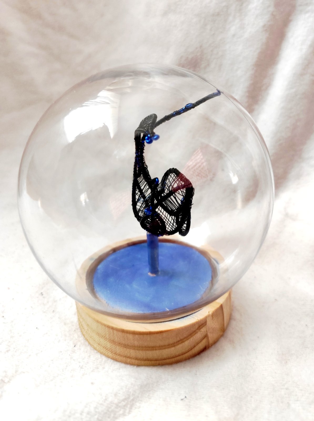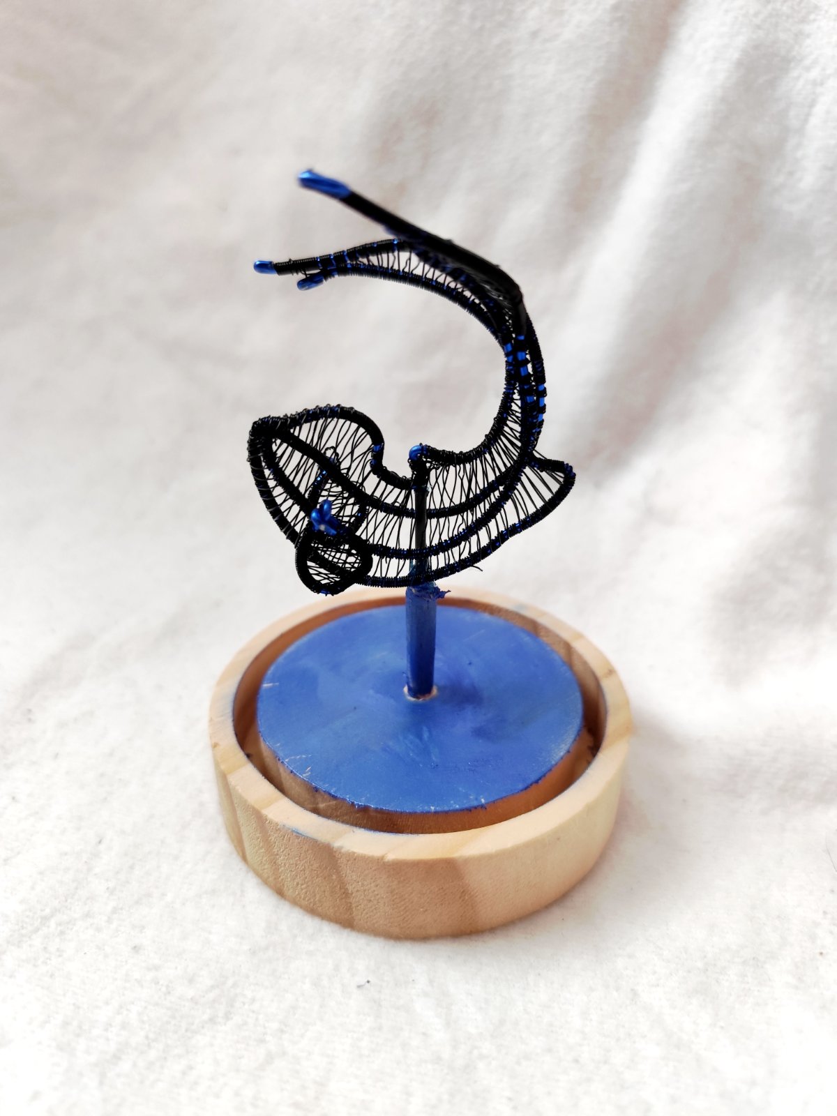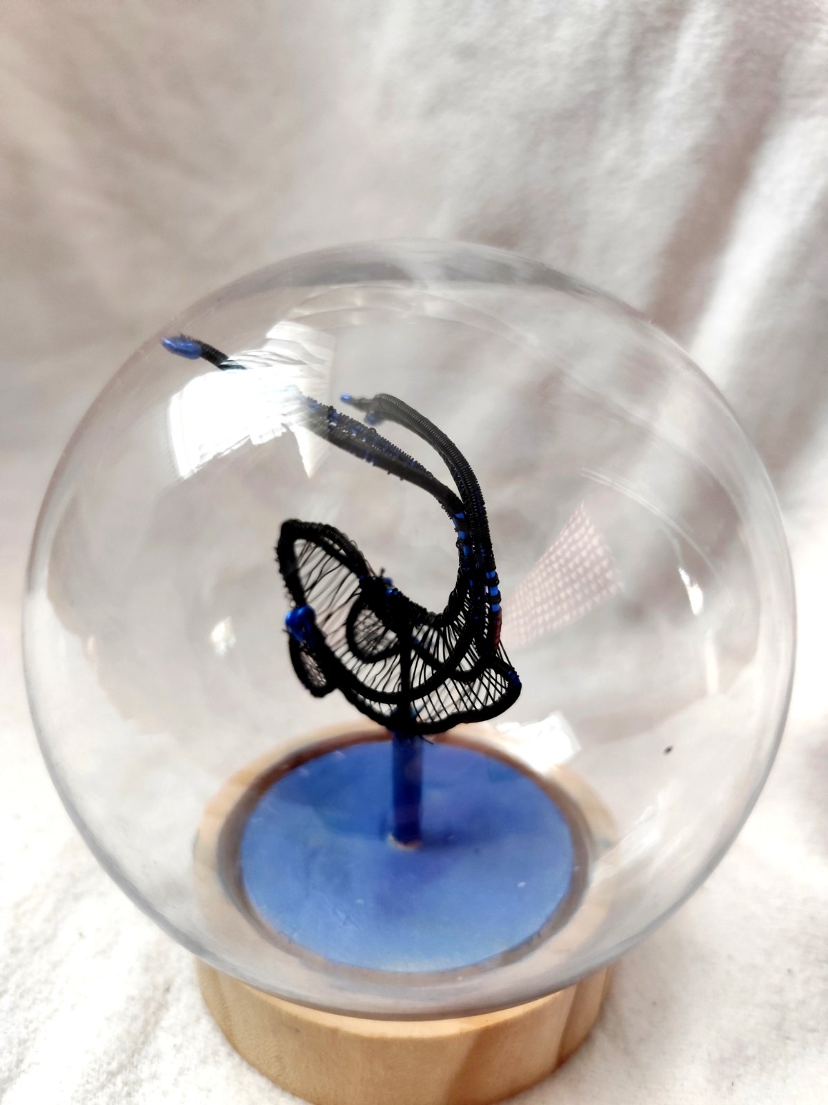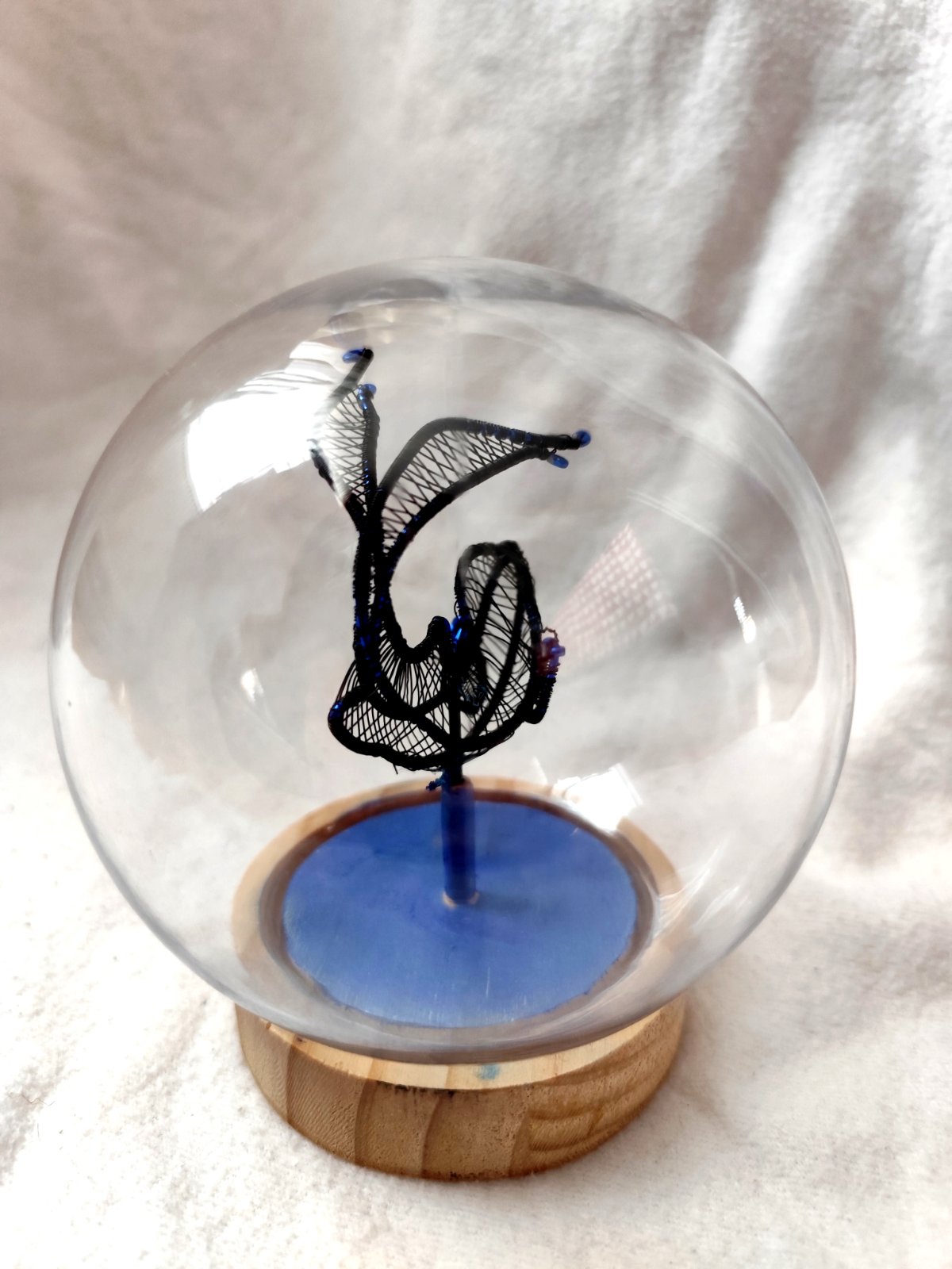 Ryba z čierneho drôtu na drevenom podstavci a v plastovej guli. Dielo bolo vystavené a je signované.