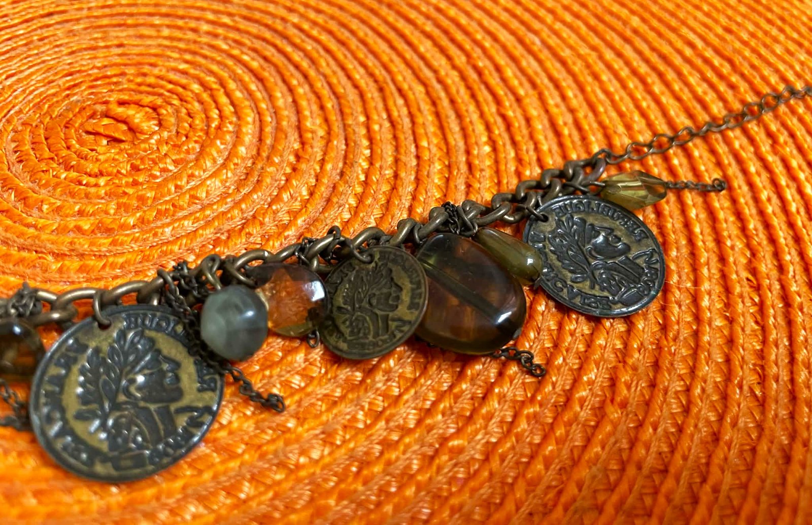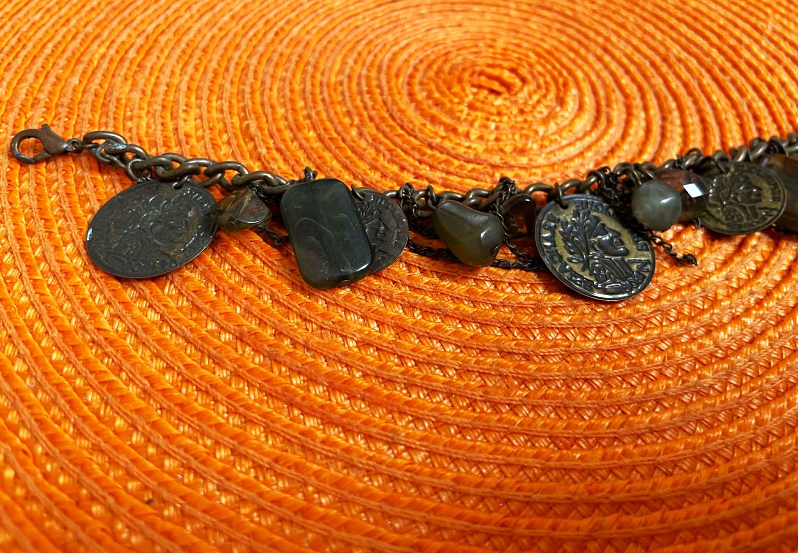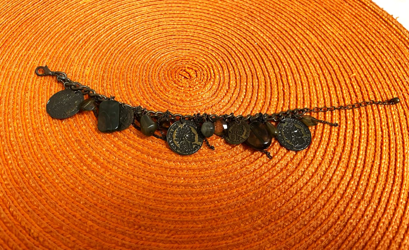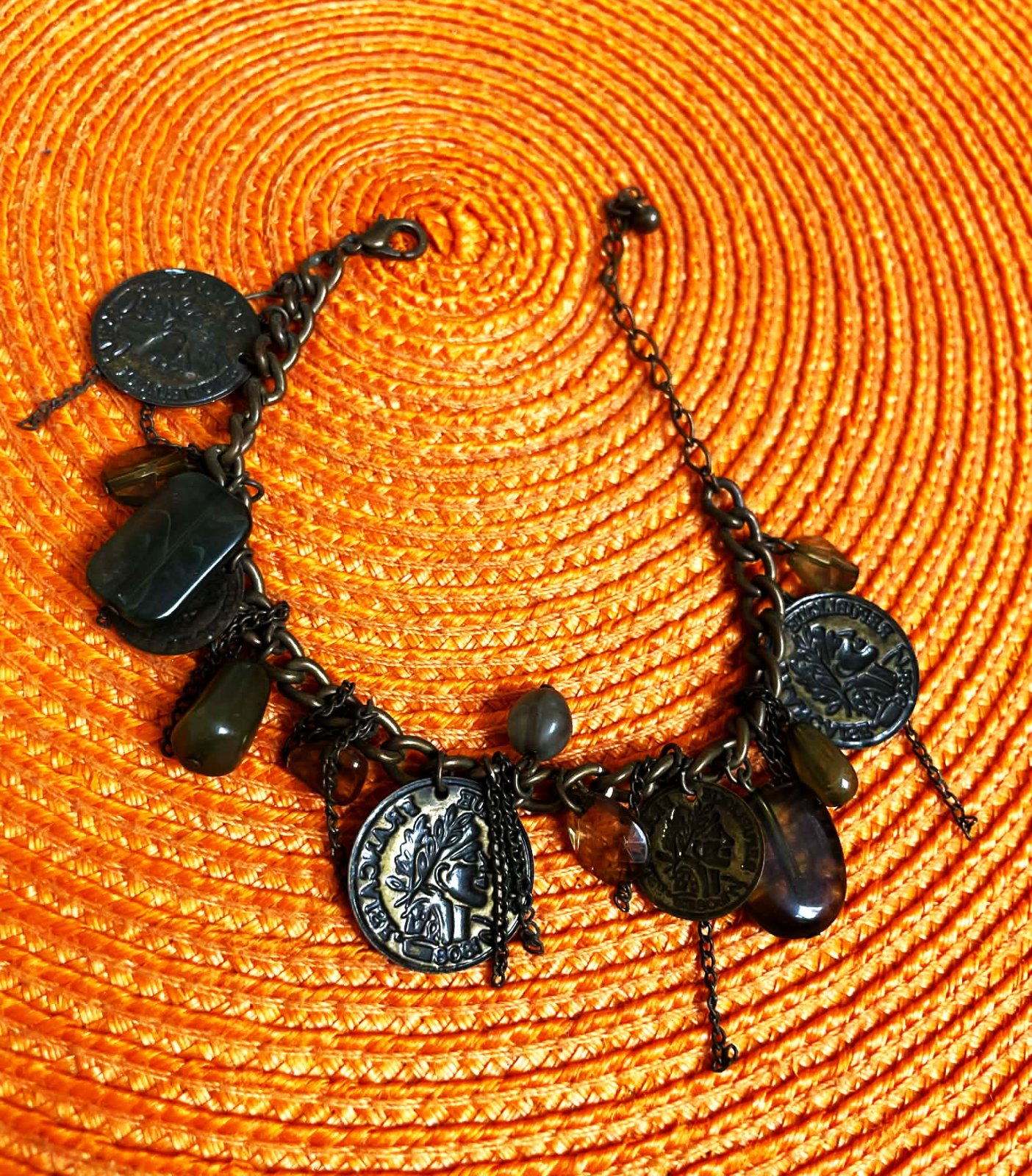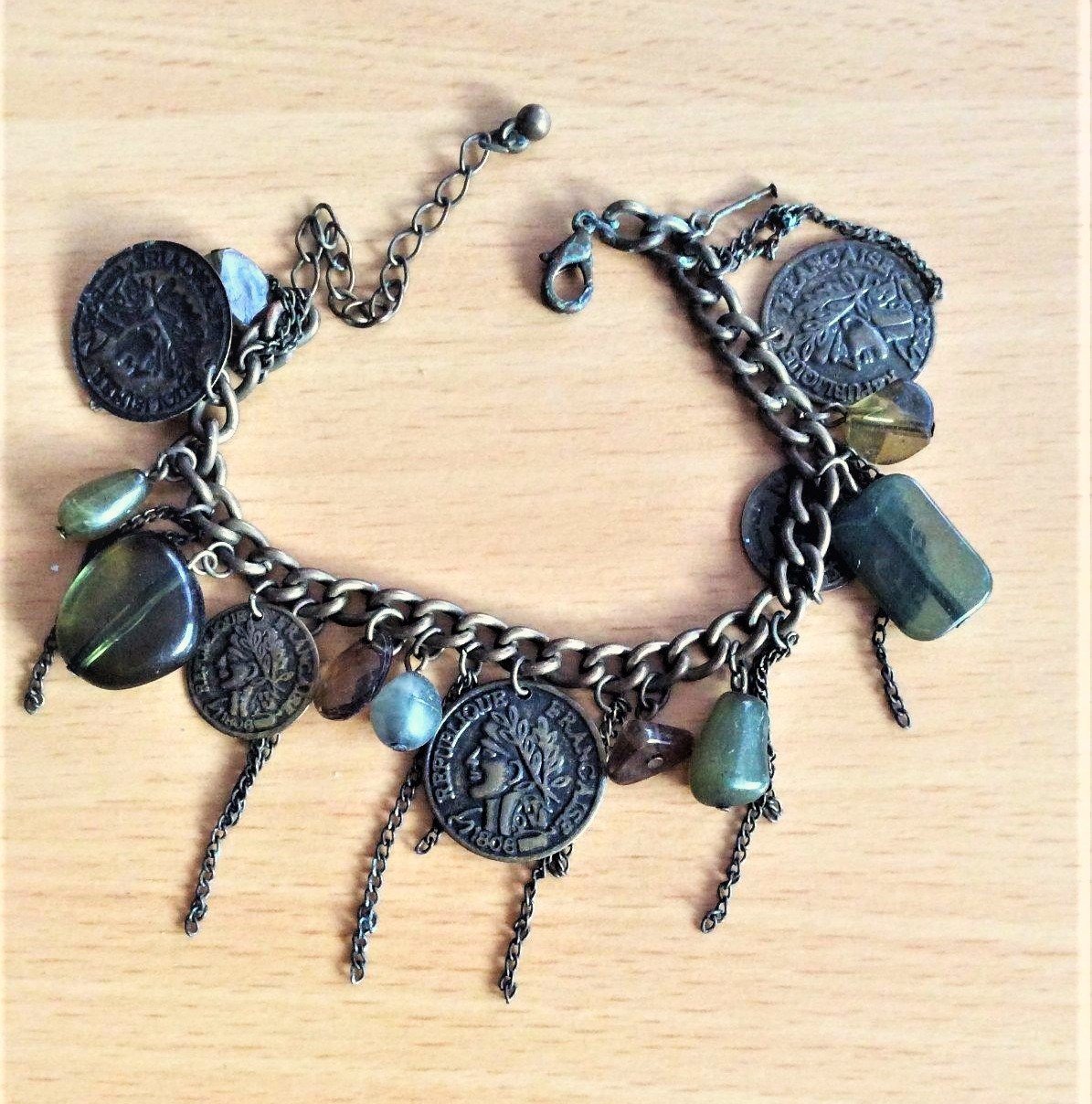 zaujímavý náramok z mexického tmavého striebra s patinou, s visiacimi kamienkami a mincami,vhodný na leto aj okolo nohy