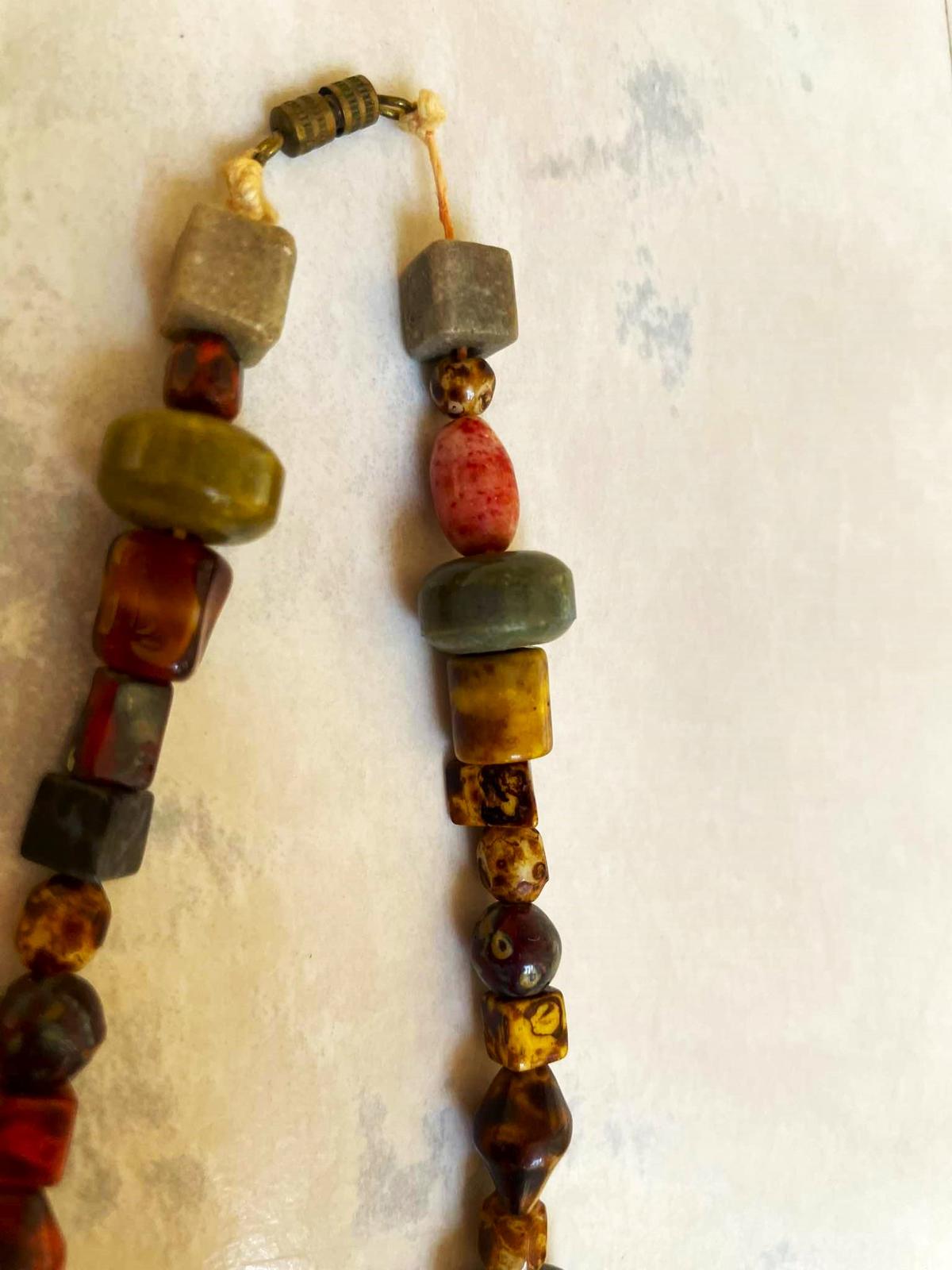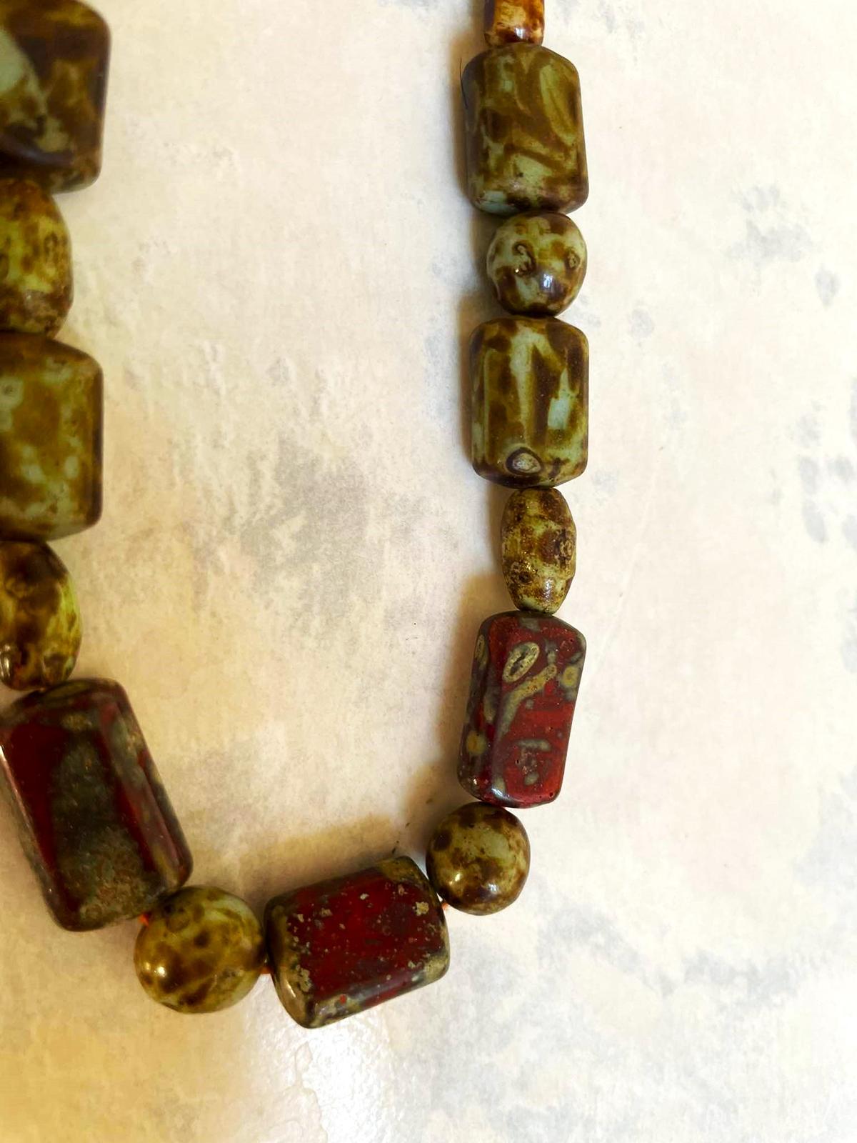 krásny kamienkový starodávny vintage náhrdelník z glazovaných keramických korálikov v štýle škótskeho achátu,vyznačuje robustnými (chunky) hranatými a oválnymi korálikmi v zemitých tónoch, ako je zelená, červená, hnedá a žltá,medzi väčšími korálikmi sú menšie dištančné koráliky,sú ku krku,na uzapínanie,dlžka = 41 cm