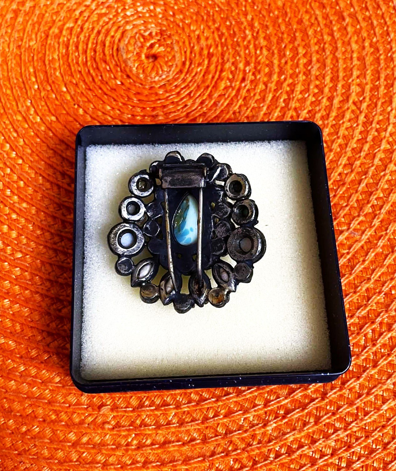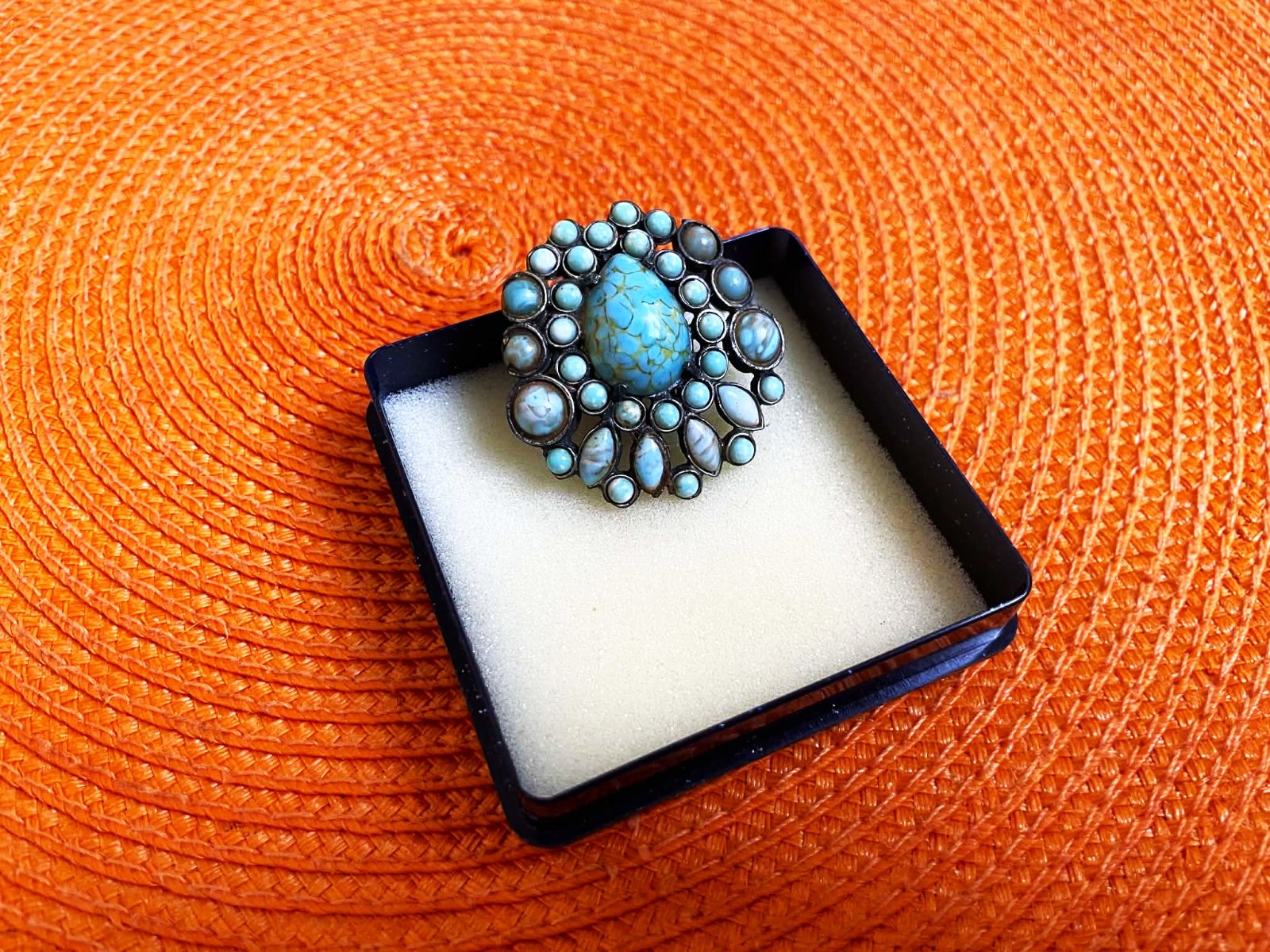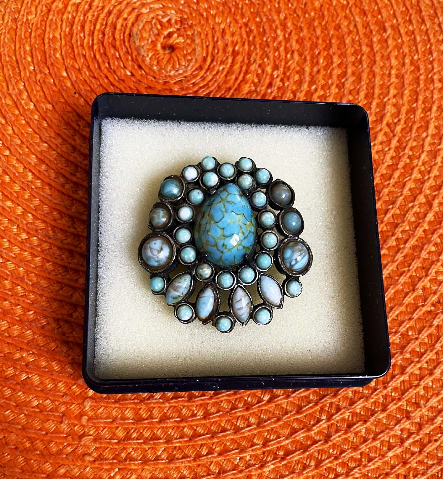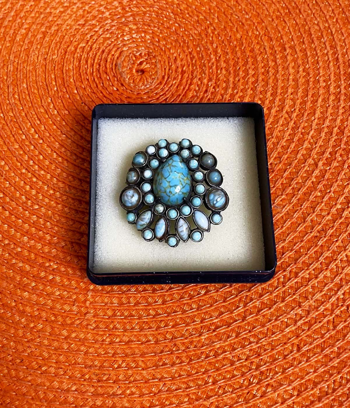 starožitná brošňa v štýle Native American Navajo z polovice 20. storočia, typický pre tyrkysové a strieborné prevedenie,dizajn šperku je charakteristický usporiadaním kameňov do kvetinového alebo hviezdicového zoskupenia, čo je typický štýl v šperkoch Native American cluster,brošňa obsahuje centrálny oválny kabošon a množstvo menších okrúhlych a oválnych kameňov v odtieňoch modrej a tyrkysovej,kovové telo šperku má strieborný alebo patinovaný strieborný tón,je bez poškodená, cca 4 x 4 cm