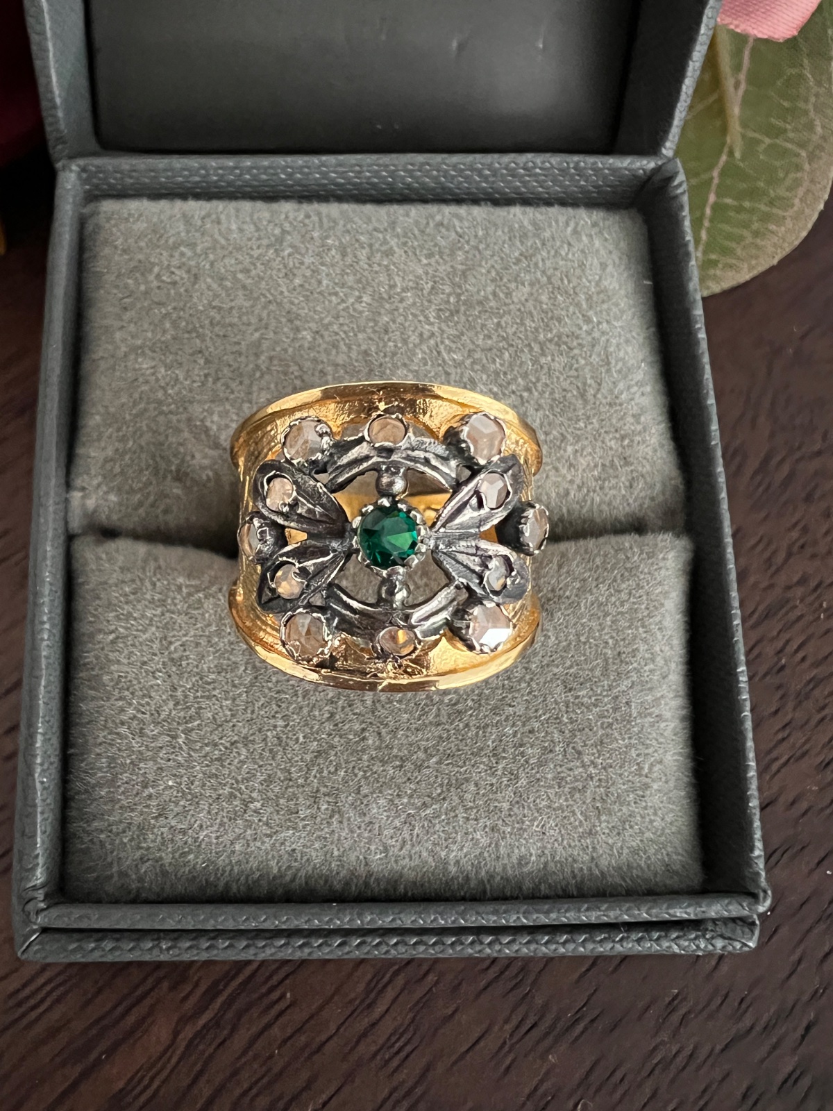Krasny velmi stary stieborny prsten pozlateny 18k zlatom ktore sa pouziva v Spanielsku , ma okolo 100 rokov. Ma drobne starozitne biele zafiry a v strede je esmeralda.