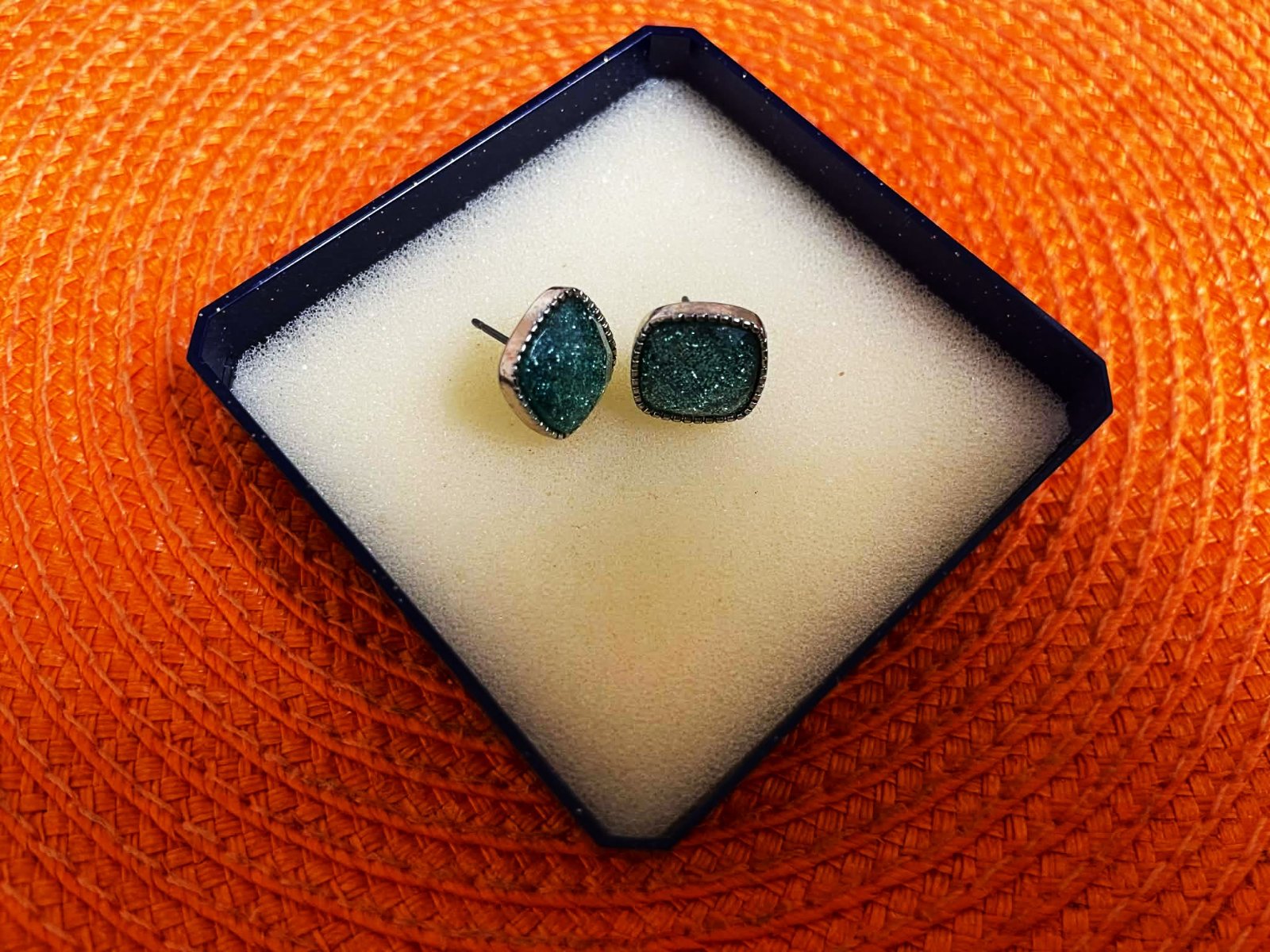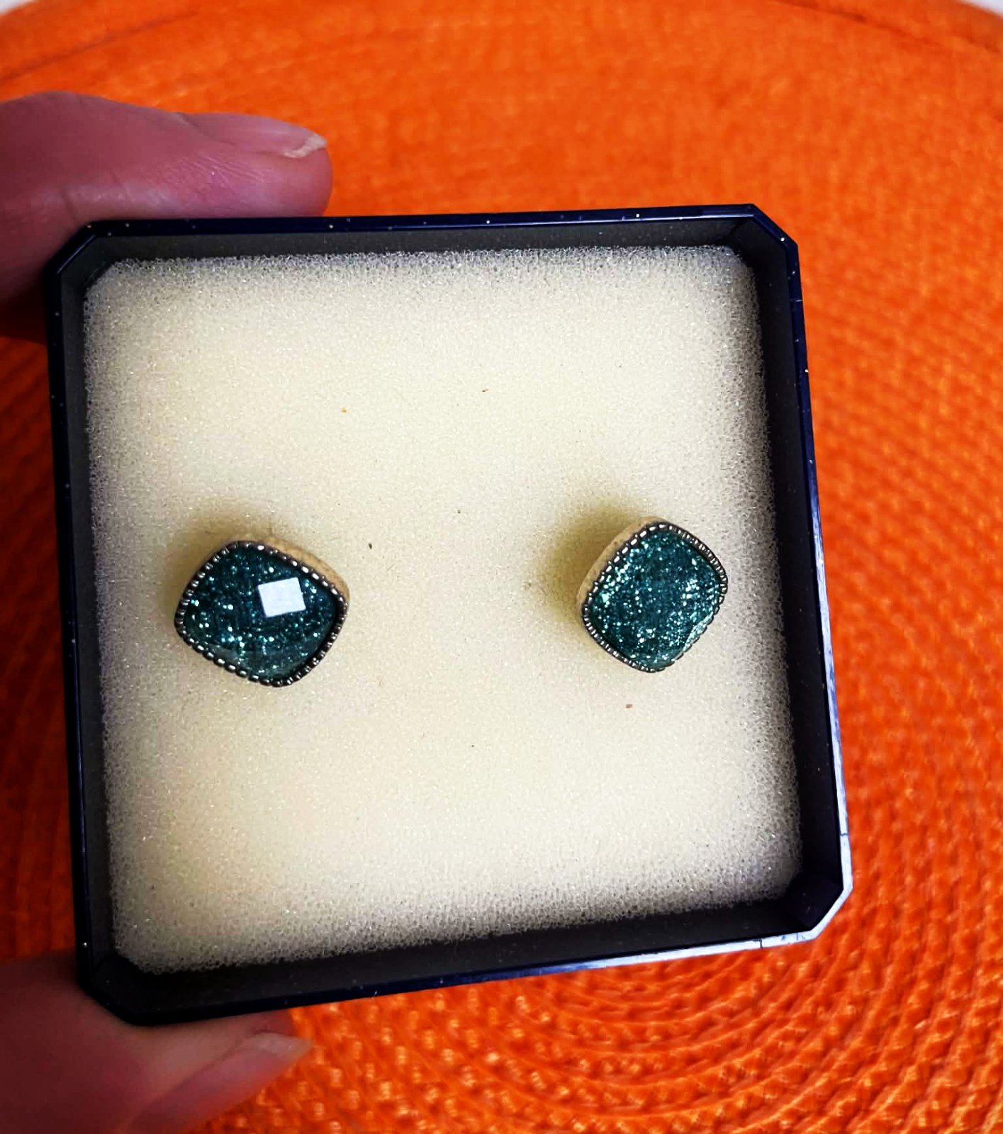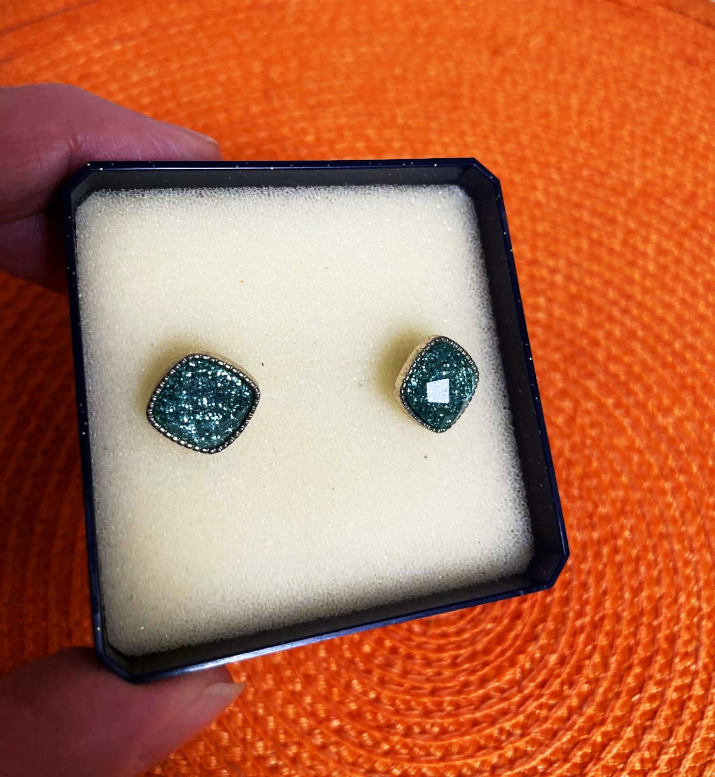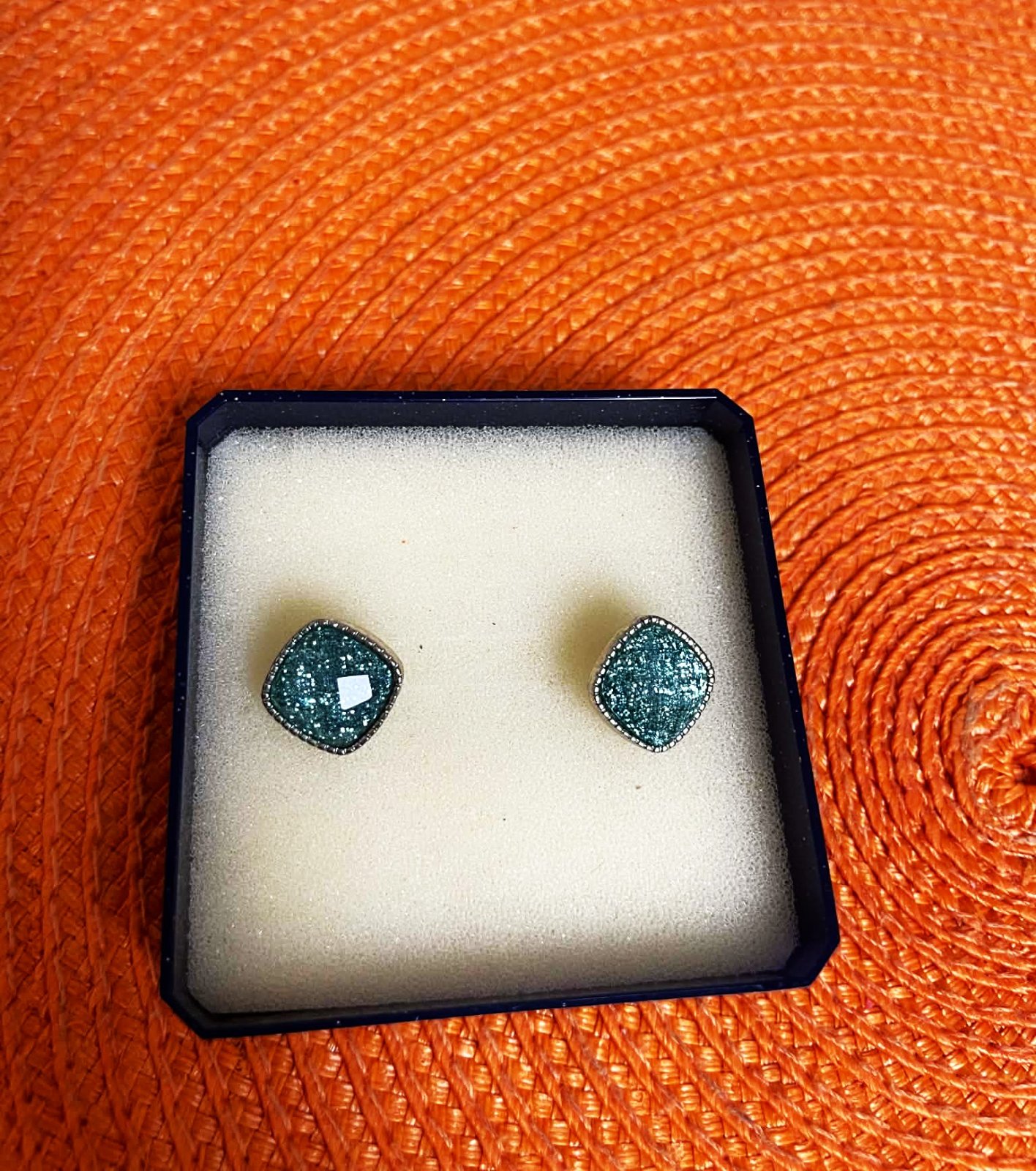 staré napichovacie náušnice v tvare štvorca, osadené v lôžku s krásnym lemom,sú trblietavé, očká hrajú jemne do tyrkysova