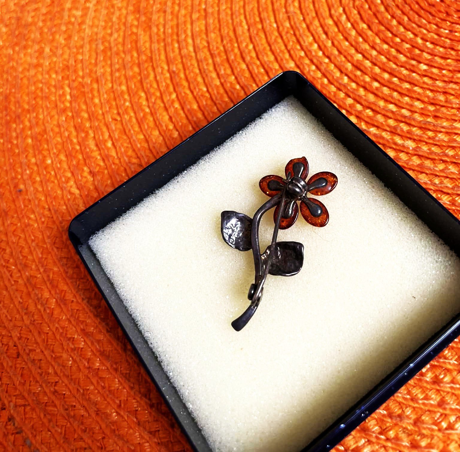 stará strieborná brošňa v tvare kvetu s jantárovými lupeňmi,lístky a stonka brošne sú vyrobené zo striebra, lupene kvetu sú z lešteného jantáru, 4x2 cm