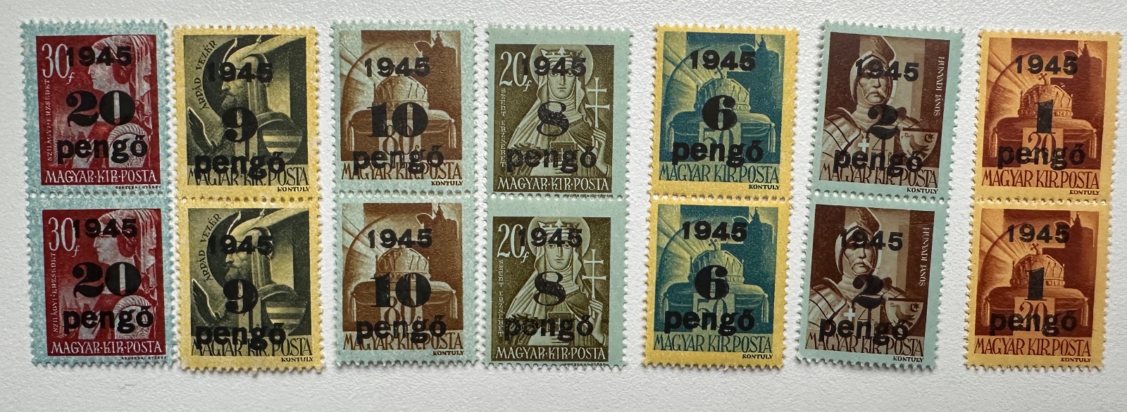 ☘️❤️Predám kompletné povojnové emisie s čiernou pretláčou „1945“ Maďarsko, pretláčané hodnoty pengő.Nelepené, čistý lep (MNH).Cena 20eur☘️❤️