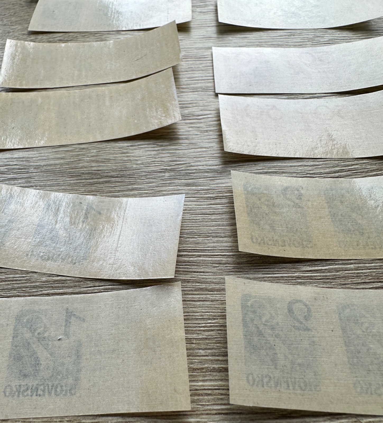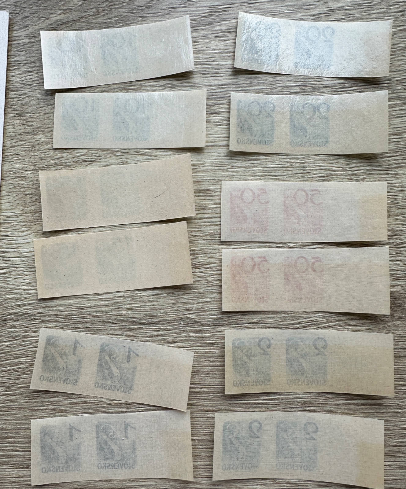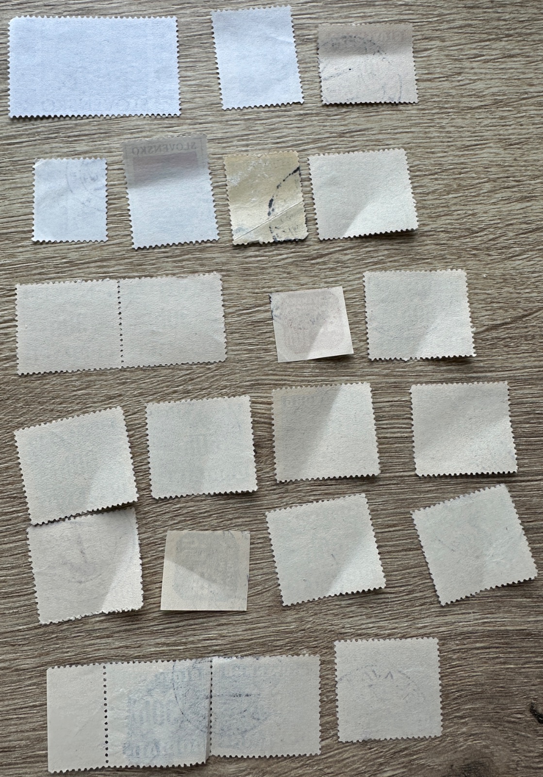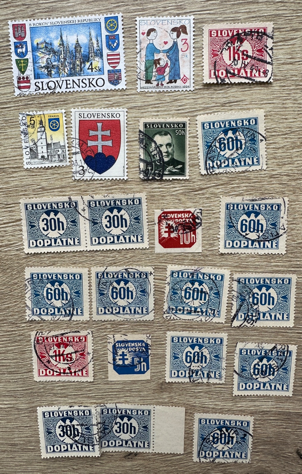 Na pravej strane je zmiešaný lot, uz peciatkovane a lepene.Časť sú bežné povojnové/slovenské pečiatkované známky, časť sú doplatné známky a hore vidno aj novšie známky Slovenskej republiky, napríklad motív „5 rokov Slovenskej republiky“.