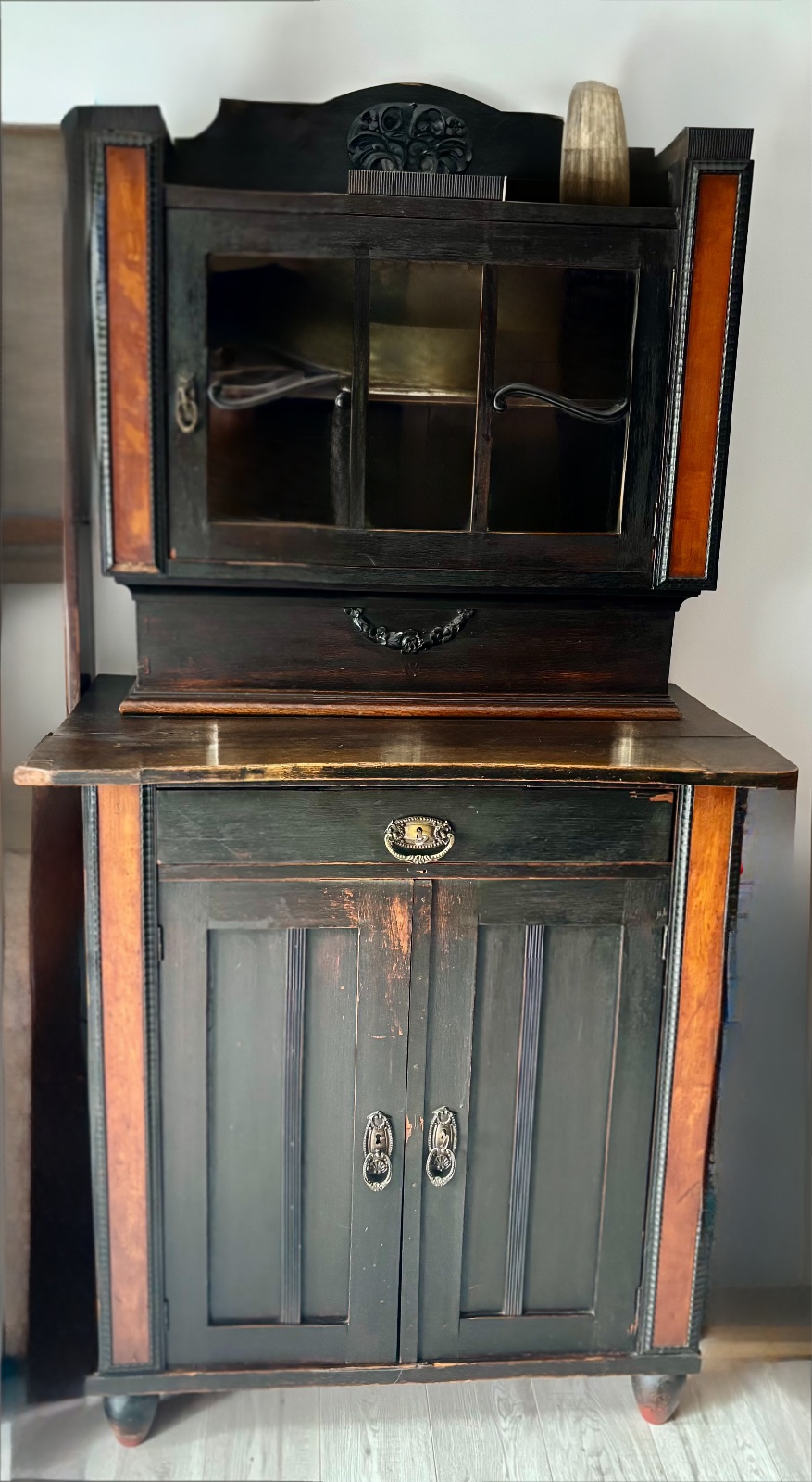 Predam krasny zrestaurovany starozitny sekretar / pribornik (93 x 52,5 x cca 200 cm), pekny elegantny kus s posobivymi detailami, vhodny do starozitneho interieru, ale aj ako samostatny soliterny stylovy kusok do obyvacky, ci pracovne.