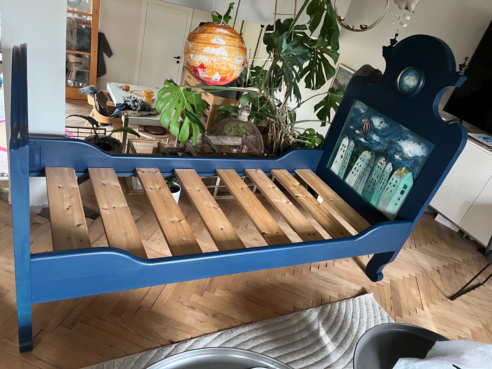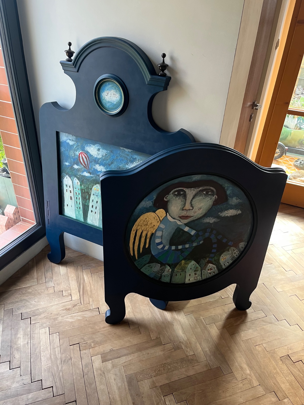 Nádherná zreštaurovaná starožitná postel,malba slov.vytvarnicka Sona Mrazova,akrylmalba s kolazou,sign.Bočnice novovyrobene u stolára-čisté drevo-masív.Osobny odber priamo v TT
