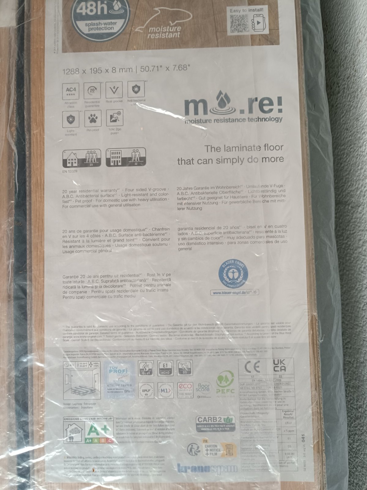 * ochrana proti povrchovej vode po dobu 24 hodín podľa predpisov NALFA a ochrana proti striekajúcej vode po dobu 48 hodín podľa pracovného štandardu KRONOSPAN WN-103, www.floor-with-more.com.
